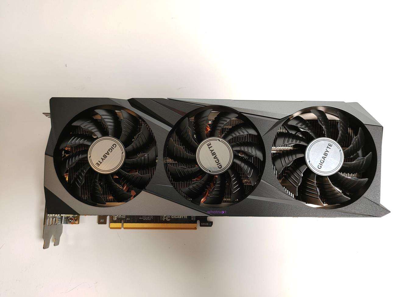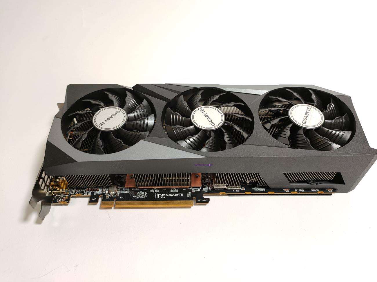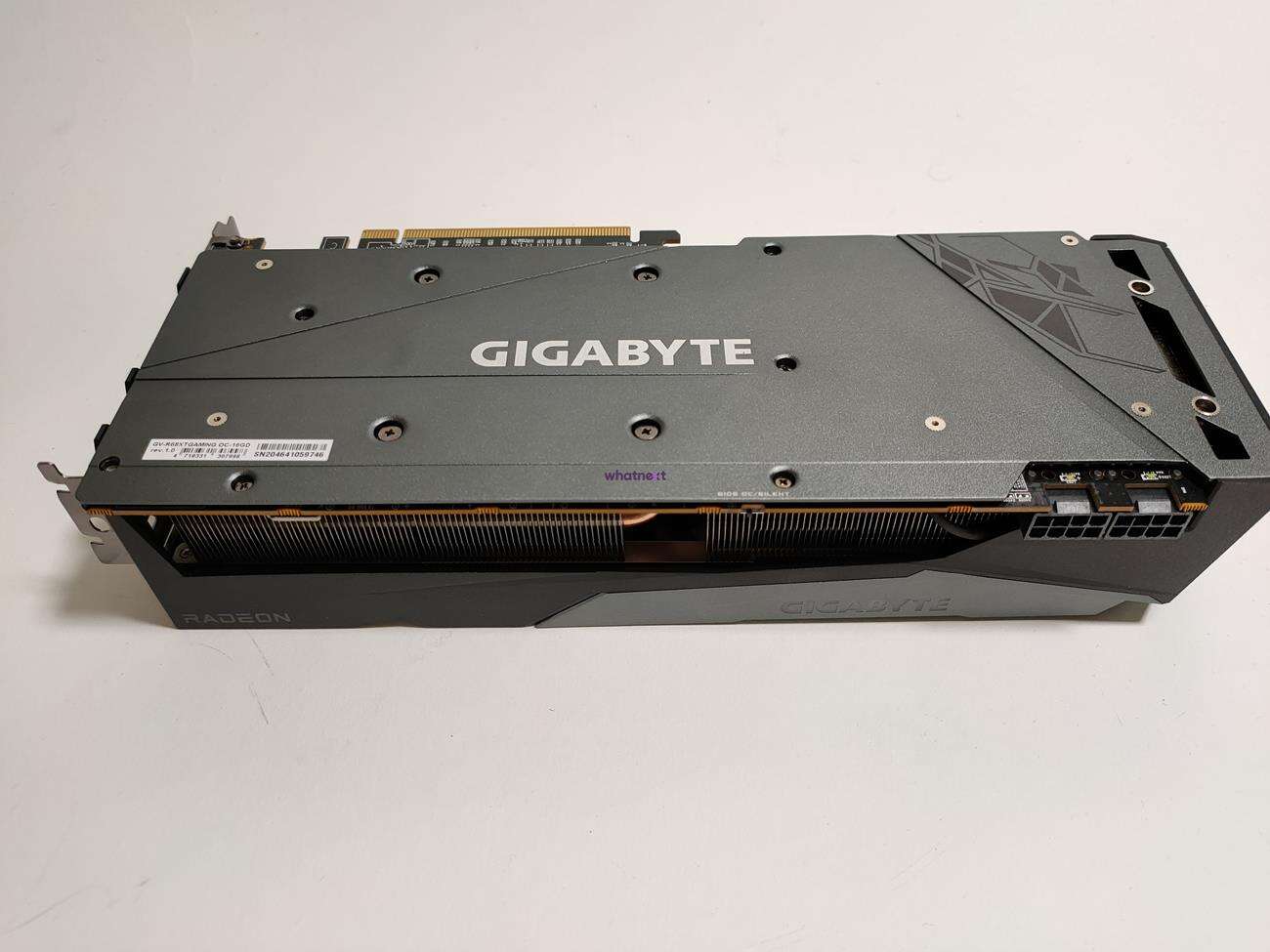 Za chłodzenie odpowiada spory radiator oraz trzy wentylatory, z których środkowy obraca się w przeciwnym kierunku do pozostałych. Gigabyte Radeon RX 6800 XT Gaming OC 16G ma wymiary 286 mm x 118 mm x 58 mm. Zajmuje ona ponad dwa sloty PCI. Na jej samym końcu producent umieścił dwa złącza 8 pin. Zalecany zasilacz ma mieć moc 750 W.
