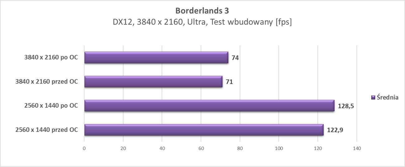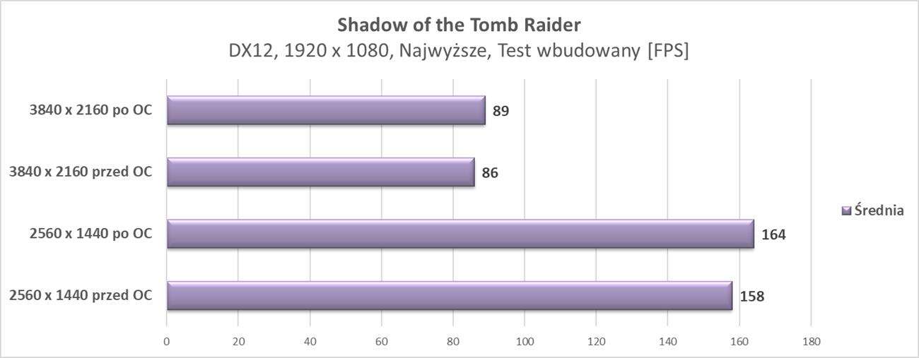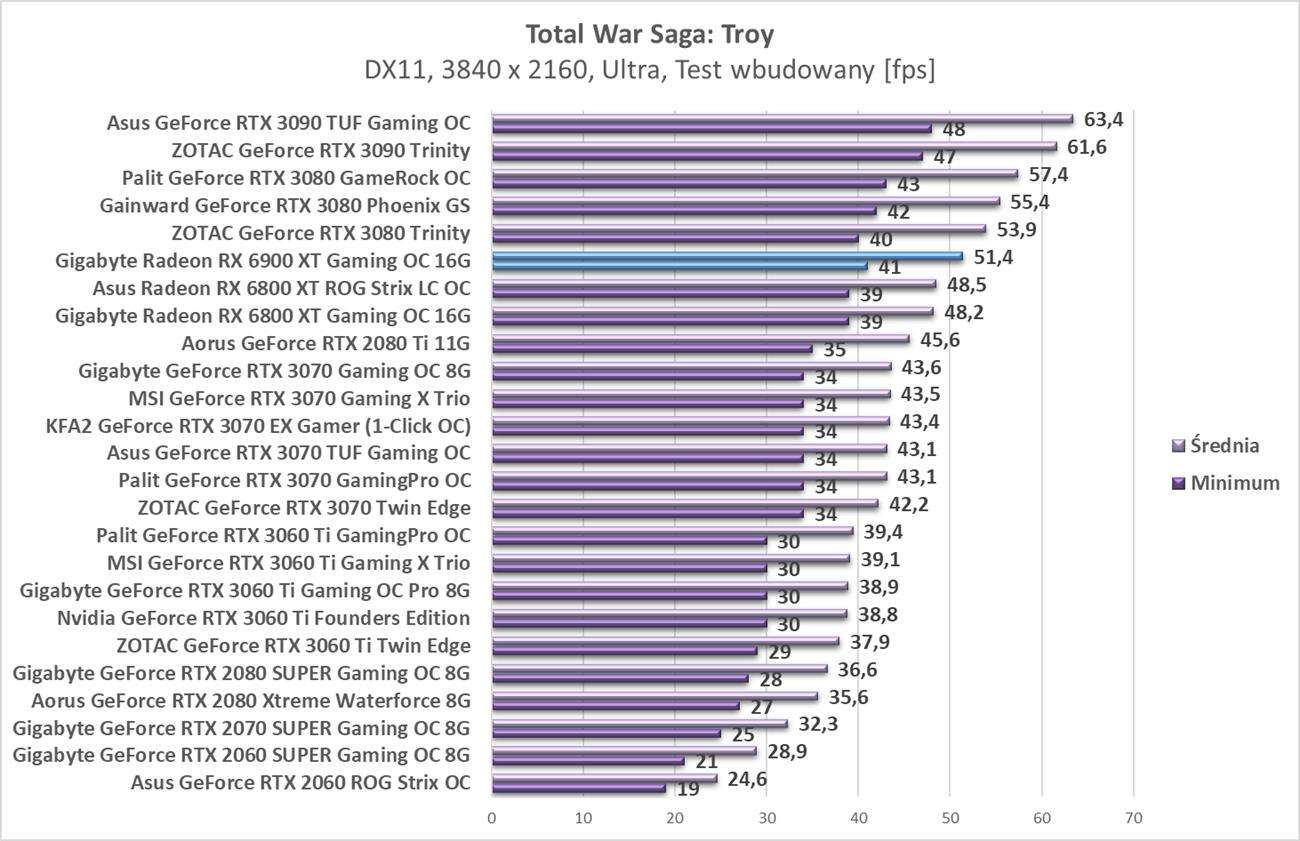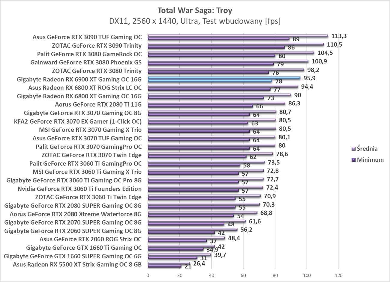 W drugiej z rozdzielczości karta plasuje się już bliżej RTX 3080 w mocno podkręconej wersji. Wyniki nie są już tak wysokie i np. w Total War Saga: Troy karta nie uzyskuje średnio 60 fps.