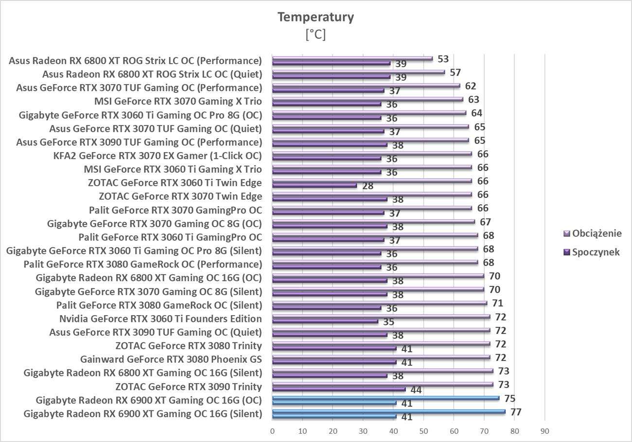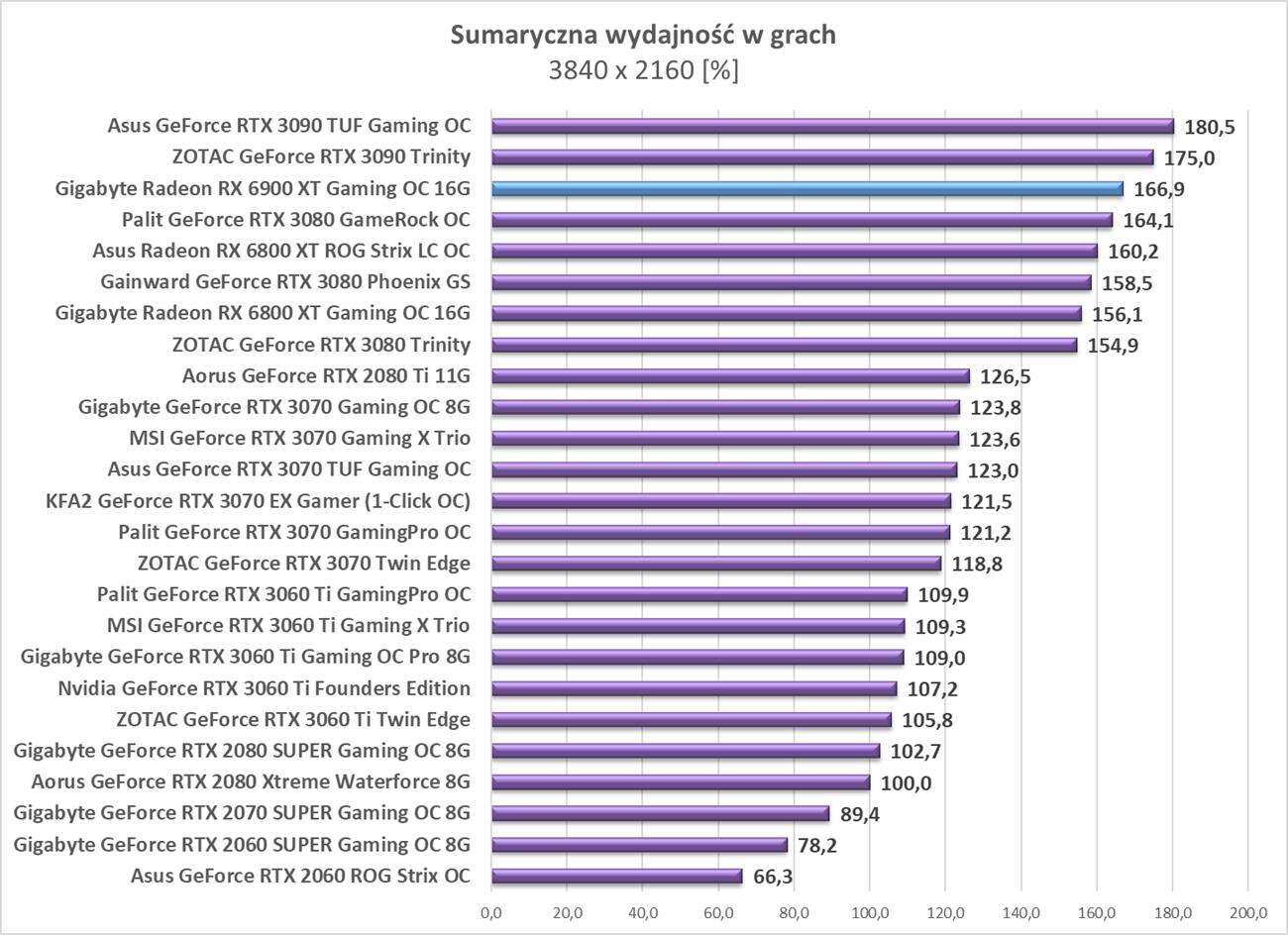 W rozdzielczości 2560 x 1440 px Gigabyte Radeon RX 6900 XT Gaming OC 16G nawiązuje równą walkę z niepodkręconym RTX 3090. W rozdzielczości 3840 x 2160 px grafika wypada już bliżej mocno podkręconemu RTX 3080. Oczywiście jest to tylko sumaryczna wydajność, a konkretne wyniki zależą od danej gry – w niektórych RX 6900 XT jest na czele, w innych przegrywa nawet z RTX 3080 czy jest z nią na równi.