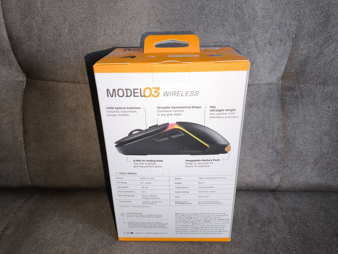 Glorious Model O3 Wireless trafia do Nas w standardowym, estetycznie zaprojektowanym opakowaniu detalicznym. Front pudełka prezentuje wizerunek myszy wraz z wyszczególnieniem najważniejszych cech konstrukcji, natomiast tył zawiera bardziej szczegółowy podgląd urządzenia oraz pełną specyfikację techniczną.