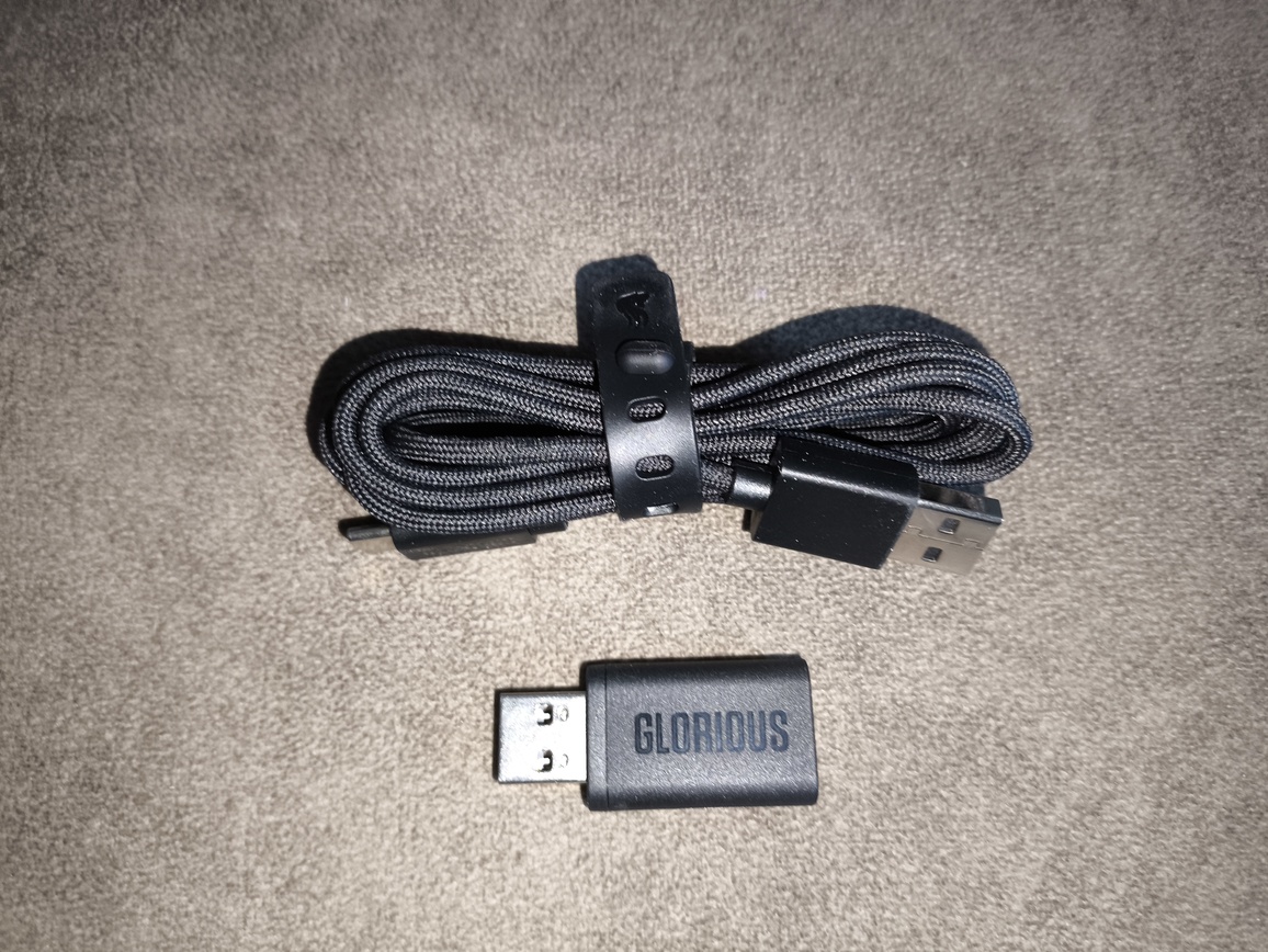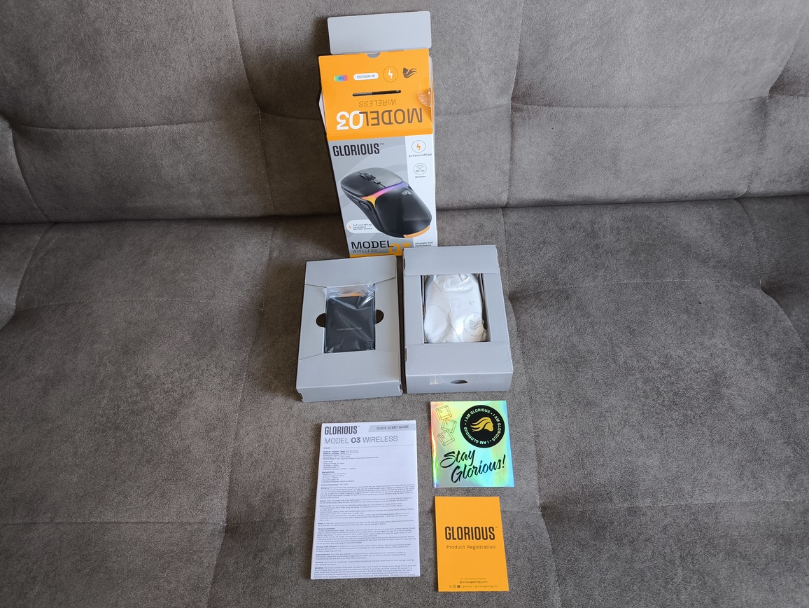 | Dołączone akcesoria | stacja ładująca bezprzewodowy odbiornik USB przewód USB typu A do USB typu C do ładowania dwa wymienne akumulatory zestaw naklejek Glorious skrócona instrukcja obsługi |