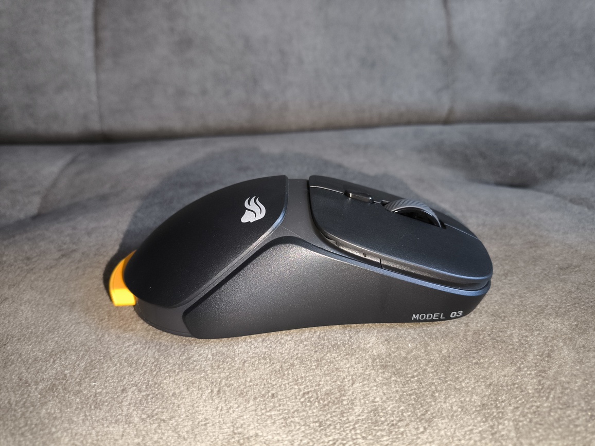 Model O3 Wireless wyraźnie odcina się od swoich poprzedników. W przeciwieństwie do wcześniejszych generacji, bryła stała się pełniejsza i masywniejsza optycznie. Przednia część jest wyżej osadzona, a garb grzbietu bardziej zaznaczony i przesunięty delikatnie ku tyłowi. Oznacza to, że najwyższy punkt nie znajduje się już centralnie, co realnie wpływa na sposób podparcia dłoni.