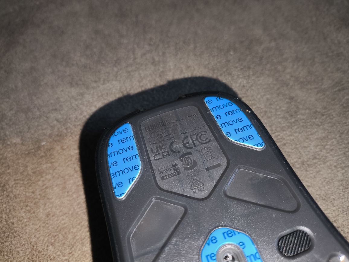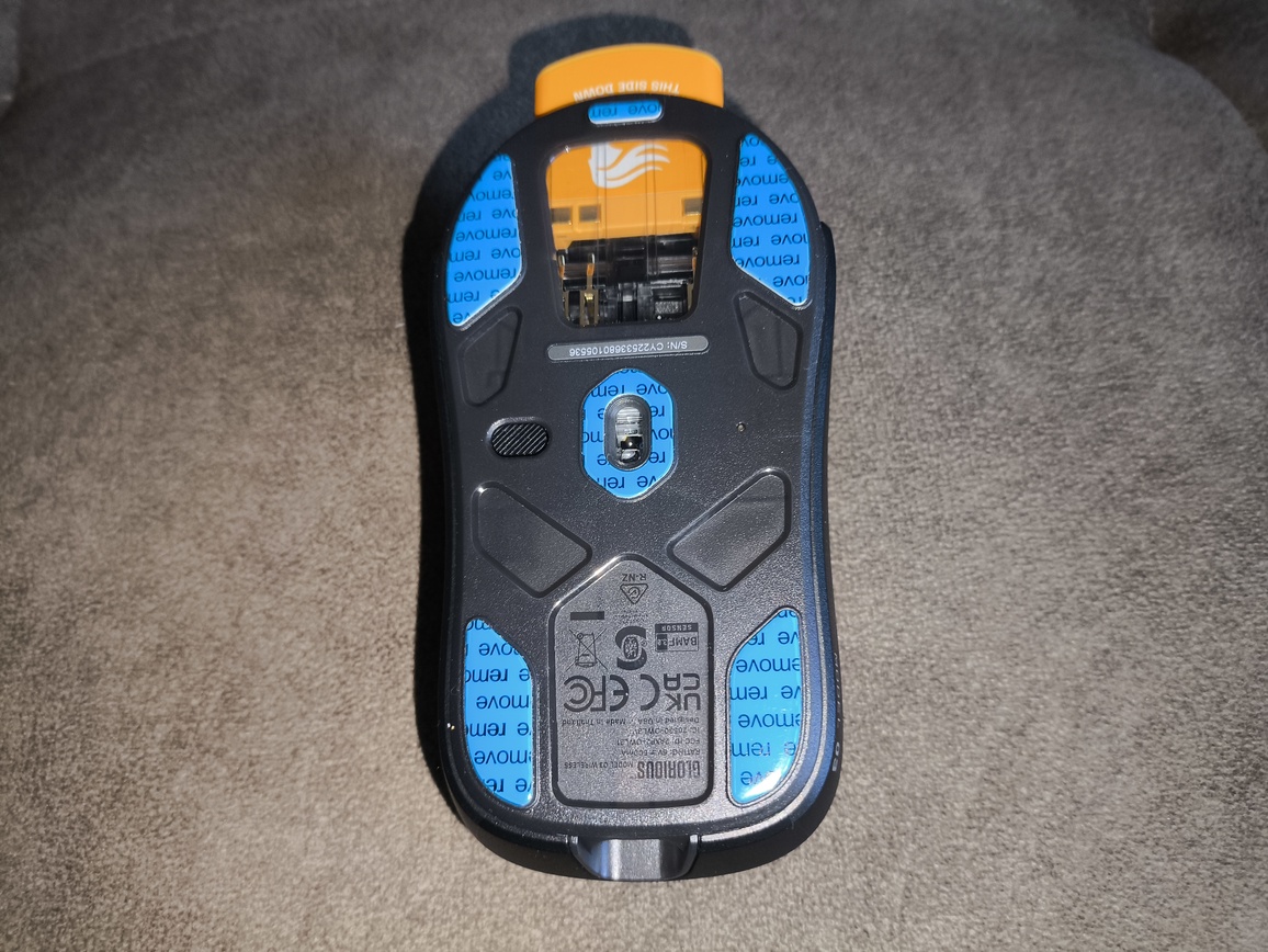 Centralnie umieszczono autorski sensor Glorious BAMF 3.0 oferujący maksymalnie 30.000 DPI, 750 IPS oraz akcelerację 50G. Obok znalazł się dodatkowy przycisk oraz dioda informująca o poziomie DPI.