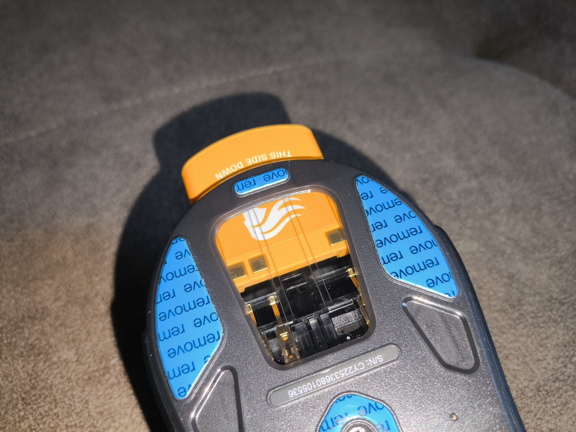 Spód urządzenia zaprojektowano bardzo starannie. Znajduje się tu aż sześć ślizgaczy wykonanych z teflonu (PTFE), w tym jeden okalający sensor – co realnie poprawiało stabilność prowadzenia i równomierność ślizgu. Mysz podczas testów poruszała się płynnie i bez oporów, niezależnie od rodzaju podkładki.