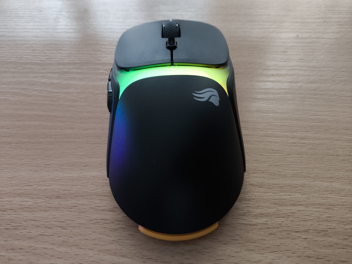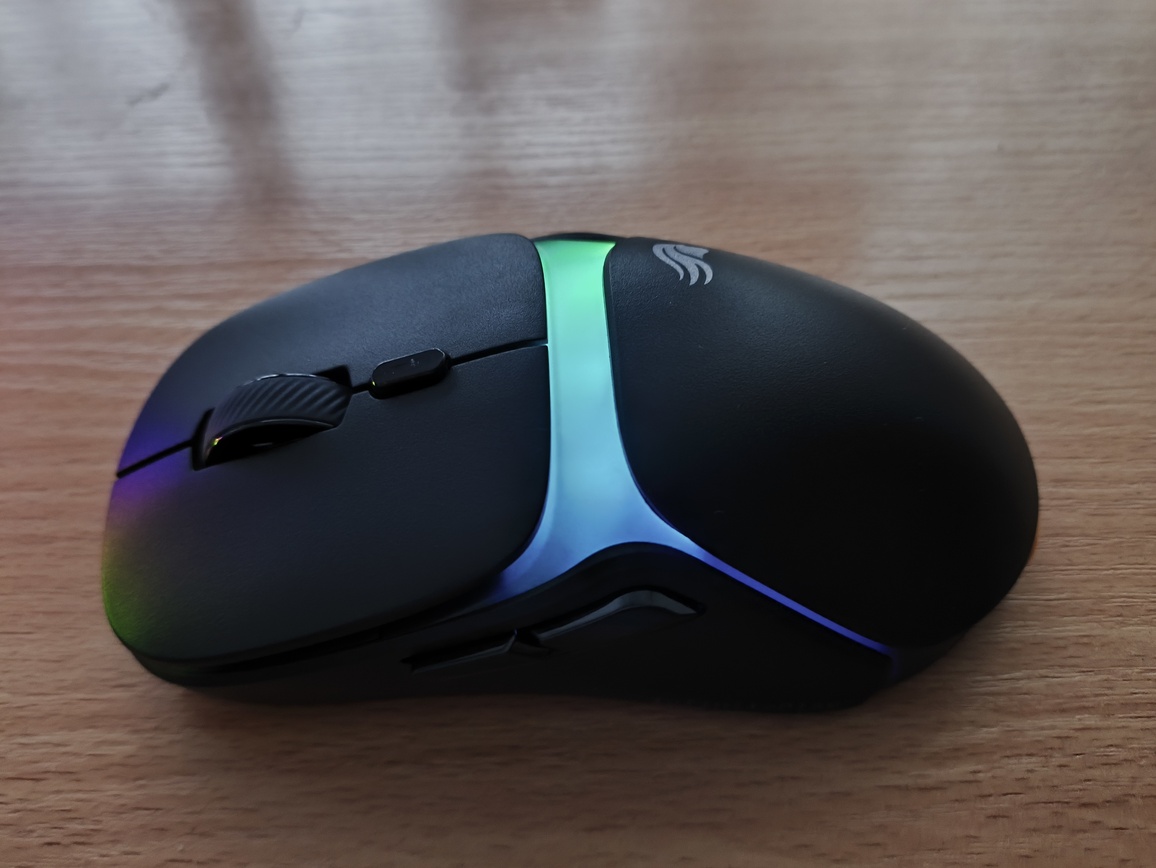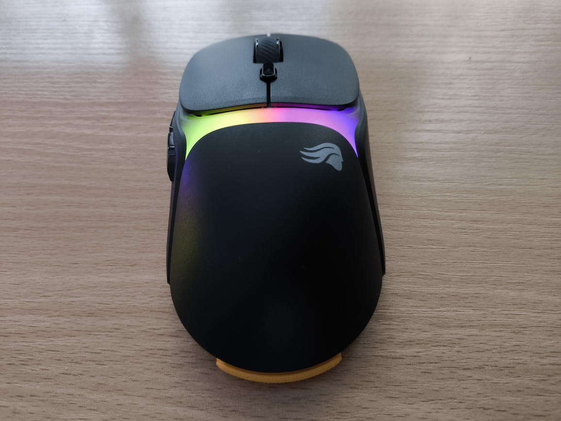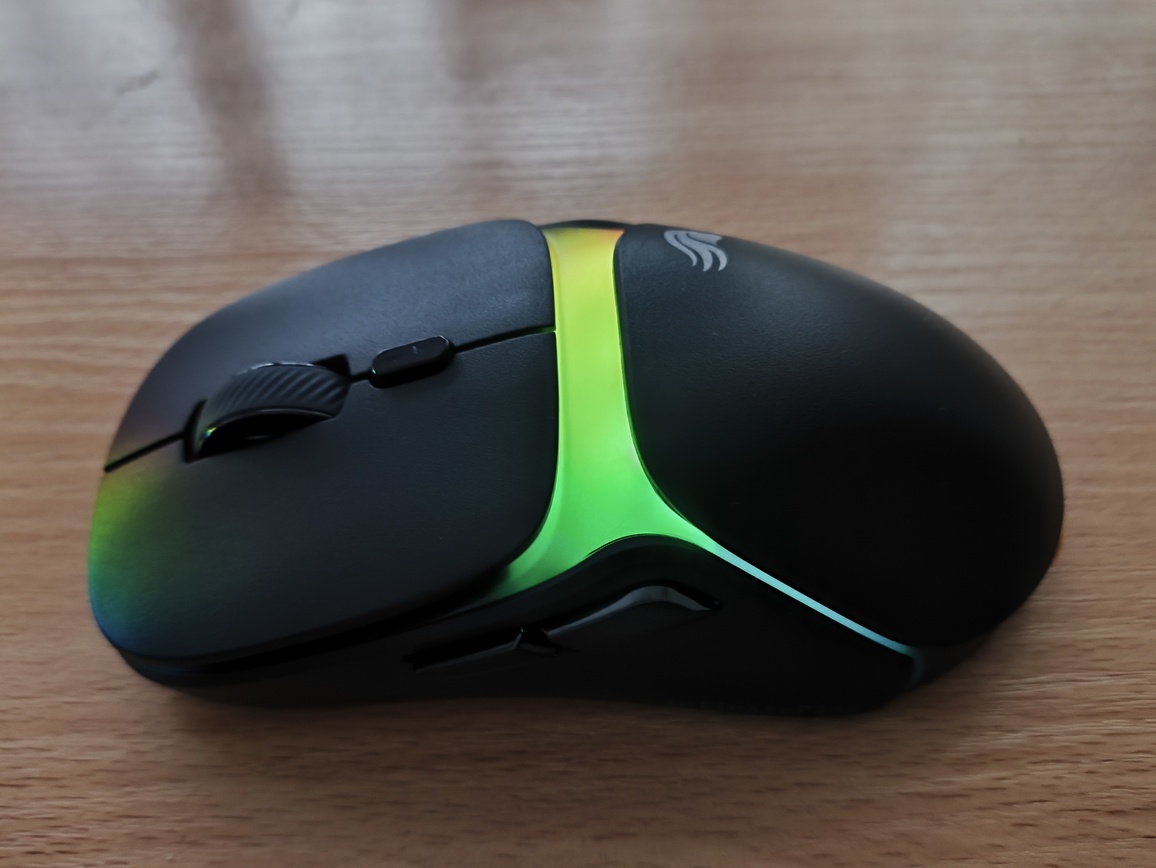 Główne przyciski są duże i wyraźnie oddzielone od reszty korpusu. Rozdziela je pas podświetlenia RGB, który biegnie przez środek myszy i rozgałęzia się ku bokom. Zrezygnowano z bocznych ramek oraz wyżłobień znanych z wcześniejszych generacji, co wizualnie upraszcza konstrukcję.
