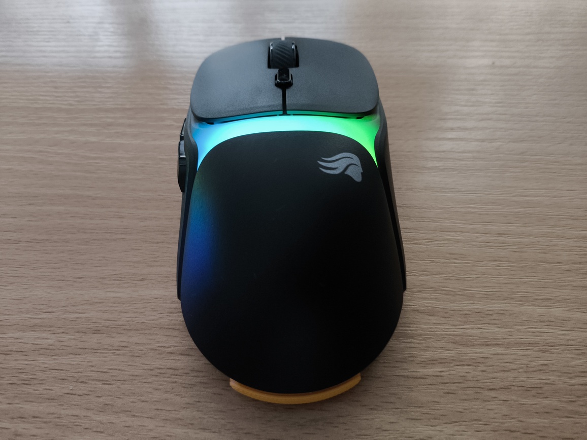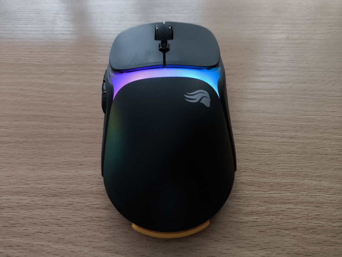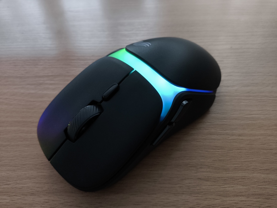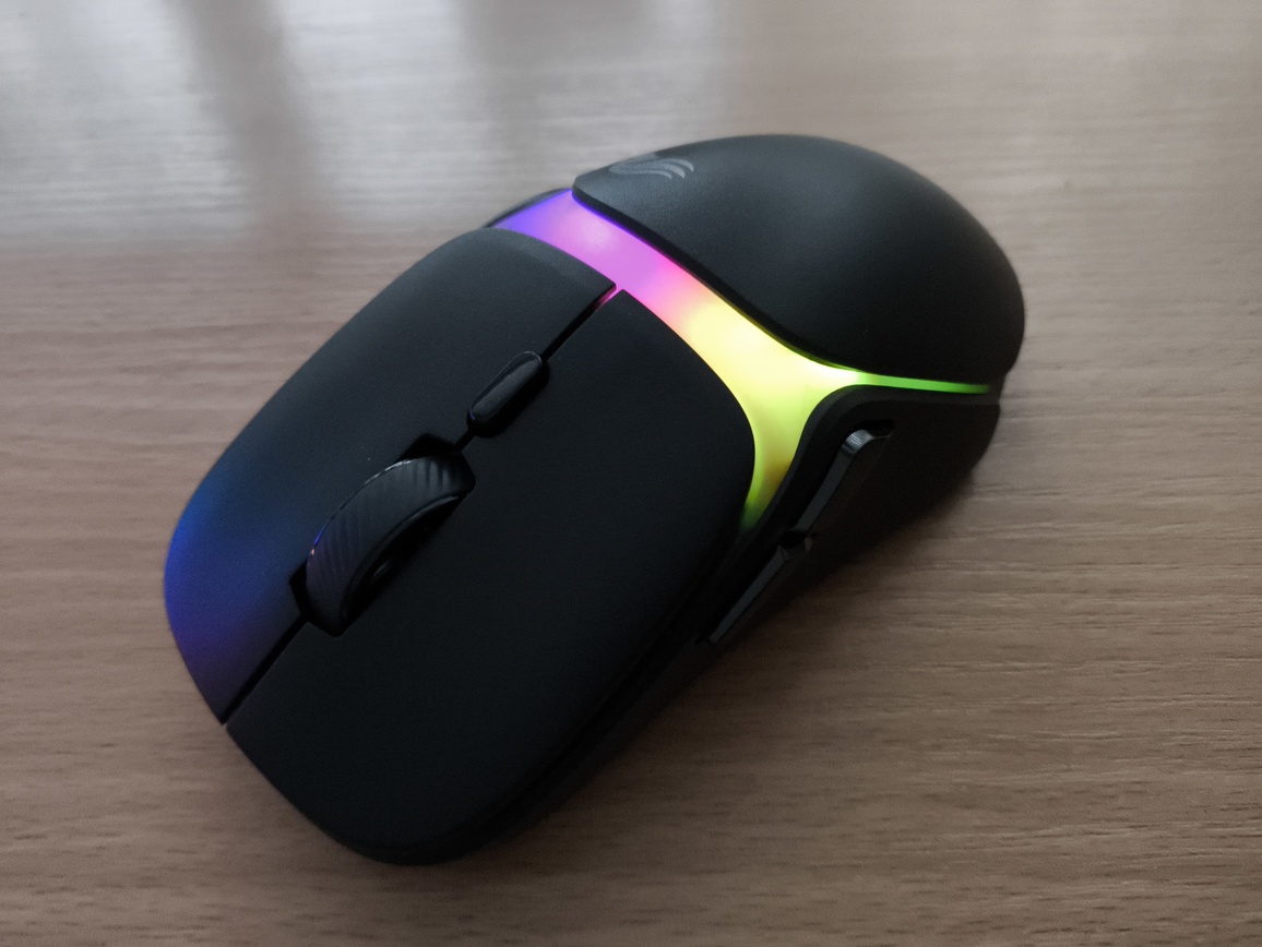 Główne przyciski są duże i wyraźnie oddzielone od reszty korpusu. Rozdziela je pas podświetlenia RGB, który biegnie przez środek myszy i rozgałęzia się ku bokom. Zrezygnowano z bocznych ramek oraz wyżłobień znanych z wcześniejszych generacji, co wizualnie upraszcza konstrukcję.