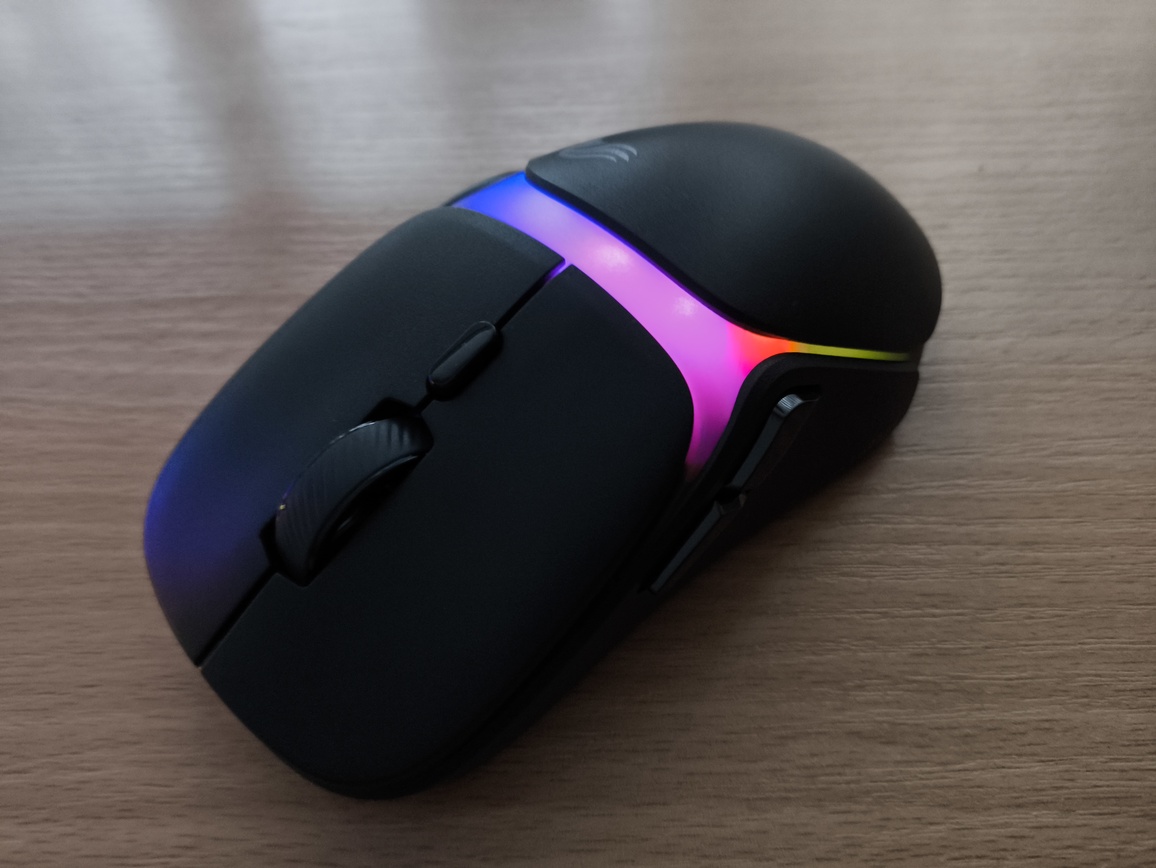 Podświetlenie RGB zostało wkomponowane w centralny pas oddzielający przyciski główne od korpusu oraz w boczne wstawki biegnące nad profilowanymi panelami. Efekt wizualny jest nowoczesny i wyraźnie podkreśla modułową konstrukcję myszy.