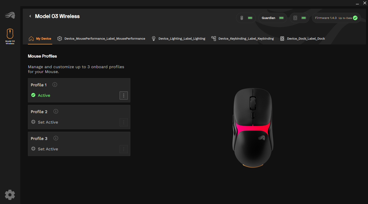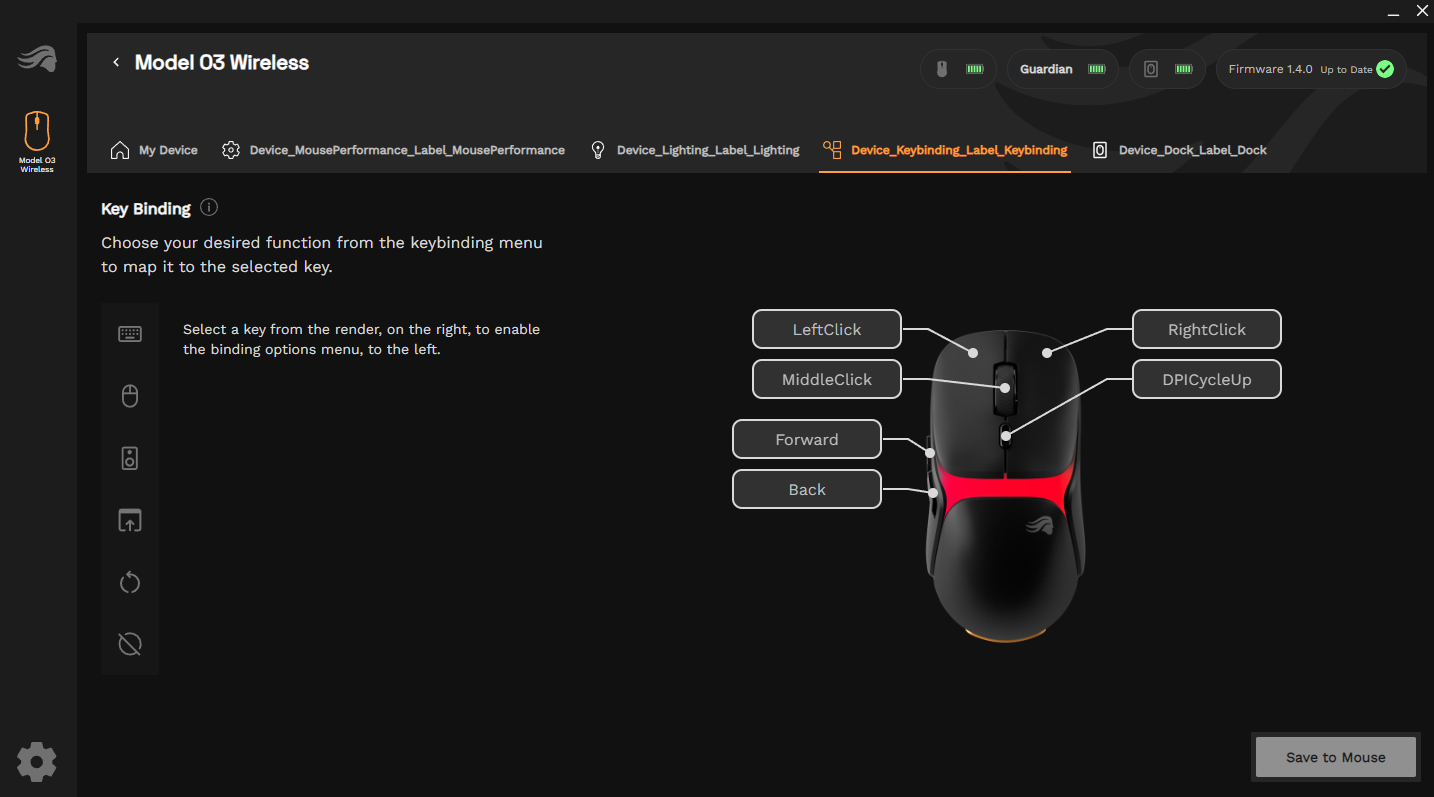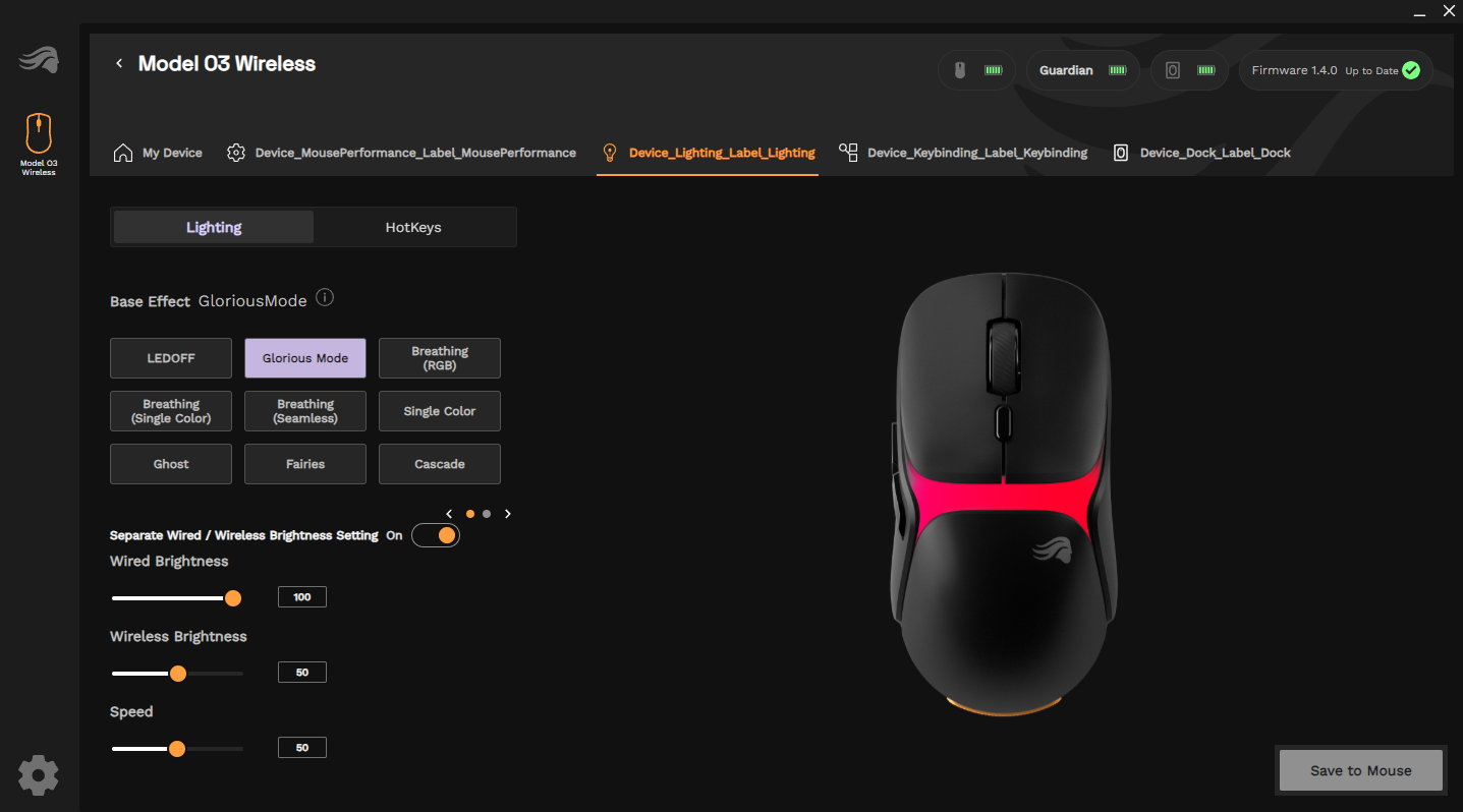 Glorious Model O3 Wireless współpracuje z aplikacją Glorious Core (aktualnie w wersji 2.1.11). Program wykrywał mysz automatycznie po podłączeniu i stanowi centrum zarządzania wszystkimi kluczowymi funkcjami urządzenia.