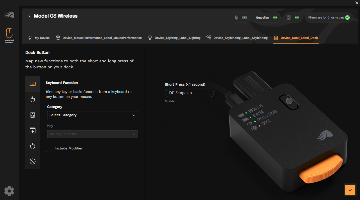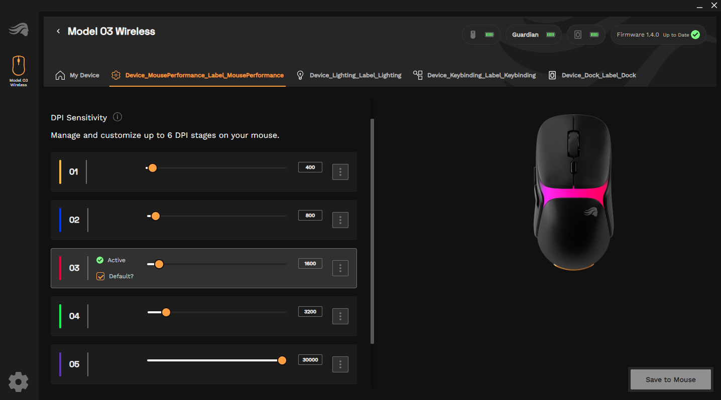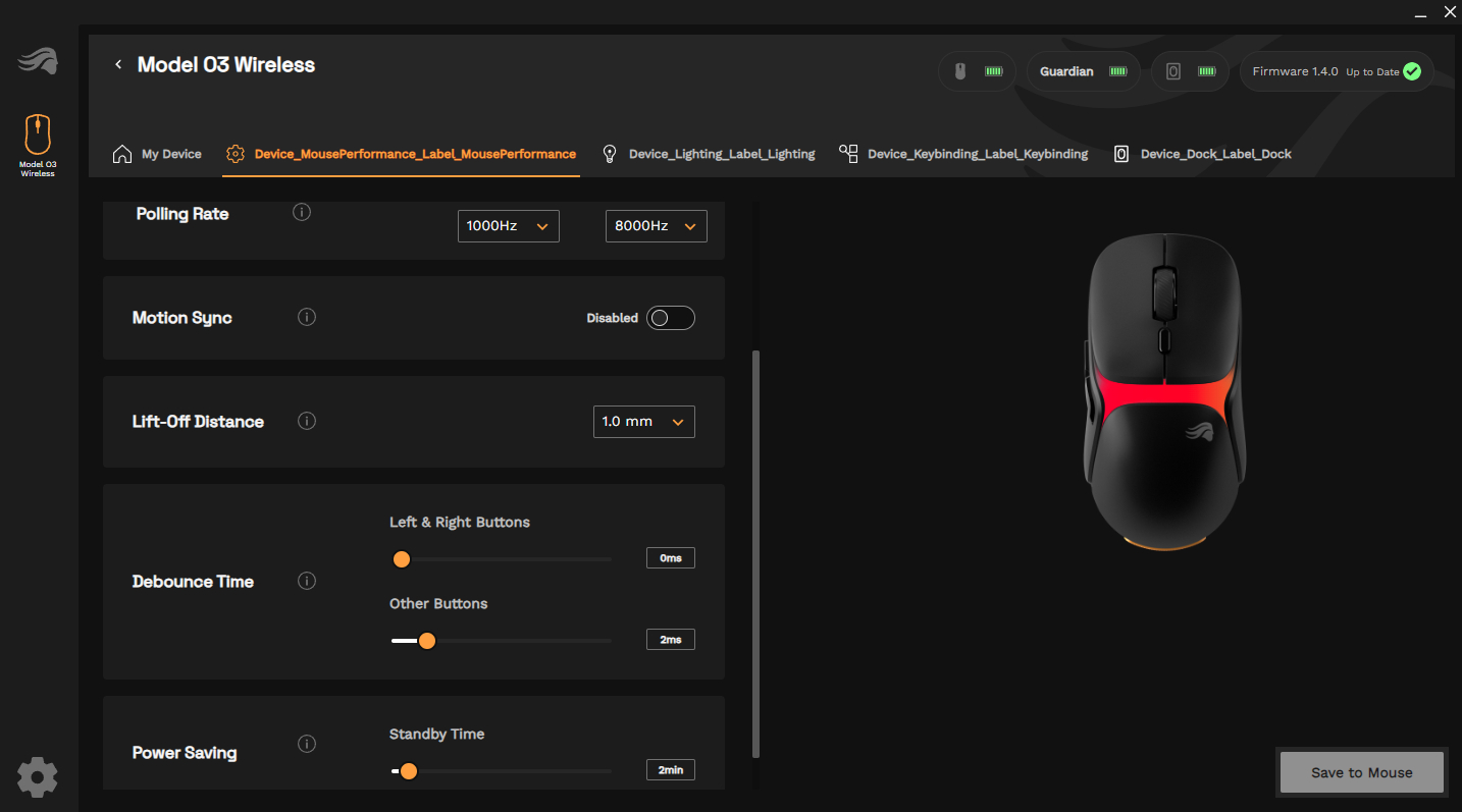 Glorious Model O3 Wireless współpracuje z aplikacją Glorious Core (aktualnie w wersji 2.1.11). Program wykrywał mysz automatycznie po podłączeniu i stanowi centrum zarządzania wszystkimi kluczowymi funkcjami urządzenia.