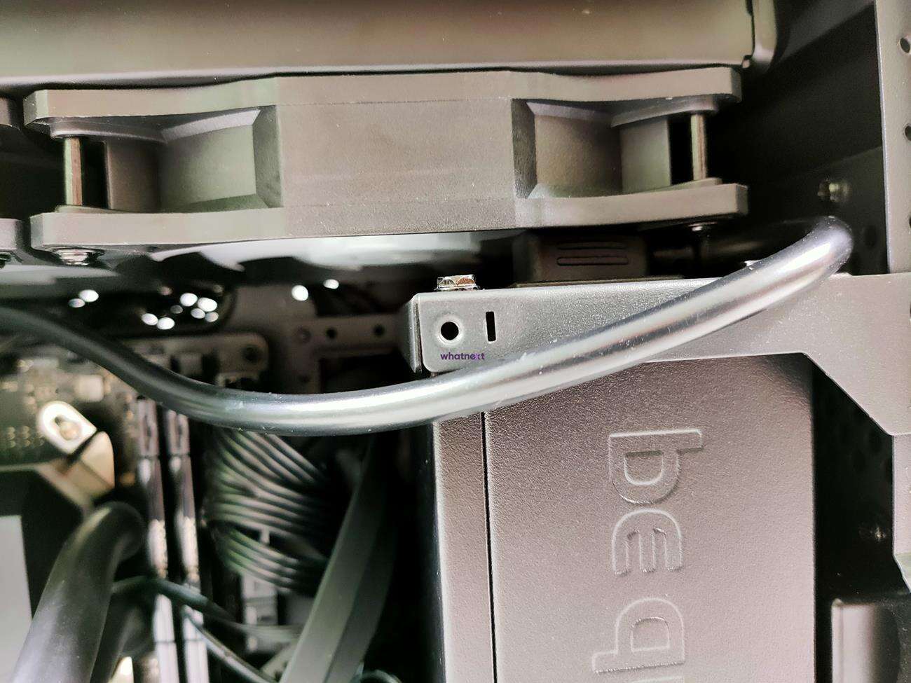 Kolejny problem miałem z kablem zasilającym z obudowy – był on za krótki i minimalnie nie sięgał do zasilacza. W związku z tym musiałem go odpiąć i poprowadzić trochę bardziej przez środek obudowy. Jeśli macie problem z wężami AiO to polecam je jeszcze raz zawinąć. W moim przypadku gdybym obrócił blokopompkę dodatkowo o 180° w lewo, to węże by się ładnie zawinęły. Jeśli jednak nie macie na boku obudowy zamontowanego dysku, to spokojnie wszystko się zmieści przy montażu jak na zdjęciu powyżej.