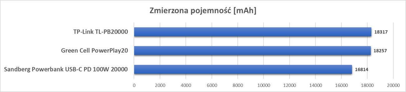 Powerbank ma 77 Wh przy 20000 mAh, co daje napięcie baterii równe 3,85 V. W związku z tym wprowadzony przelicznik wynosi 1,3 zamiast 1,35 V. Zmierzona pojemność jest naprawdę świetna – jest to czołówka powerbanków. 91,3% zadeklarowanej pojemności to znakomity wynik i widać, że Green Cell na niczym nie oszczędza.