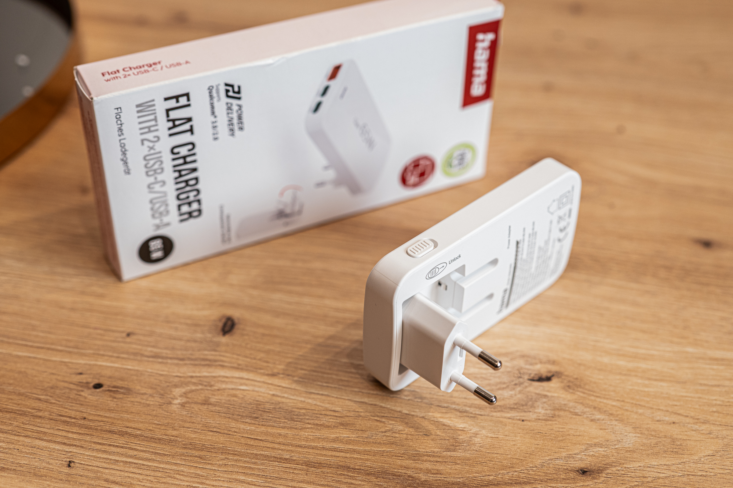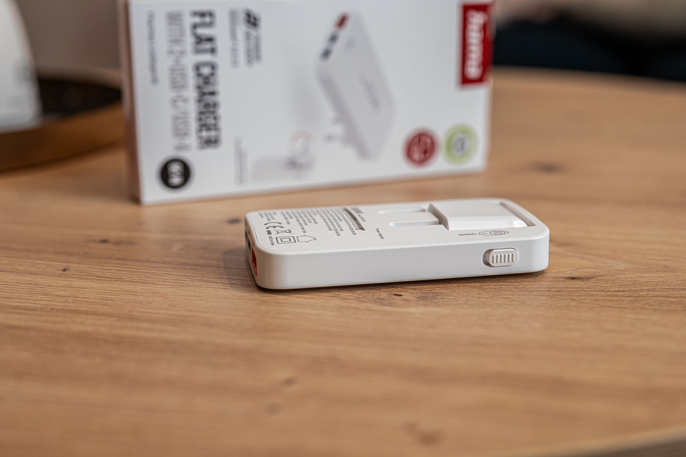 - Obudowa ładowarki jest utrzymana w białej kolorystyce i wykonana z tworzywa o matowym wykończeniu. Zintegrowana składana wtyczka typu Euro (CEE 7/16) sprawia, że całość może leżeć całkowicie płasko, co dodatkowo ułatwia transport i przechowywanie – nie ma odstających elementów, które mogłyby się wyłamać.