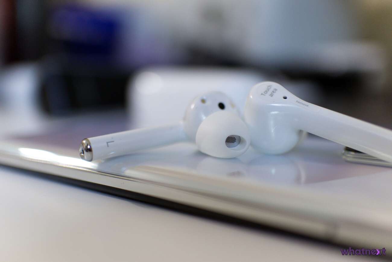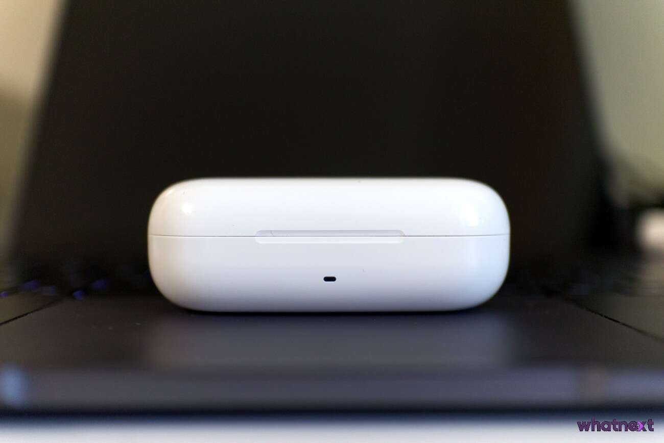 Same słuchawki (wcale nie podobne do AirPodsów… ) są nie dłuższe od typowej zapałki. Na ich zewnętrznej stronie mamy pola dotykowe. Od wewnętrznej widzimy piny, za pomocą których słuchawki są ładowane oraz czujniki zbliżeniowe. Membrany w dolnej części obudowy kryją mikrofony. To one odpowiadają za działanie redukcji hałasu.