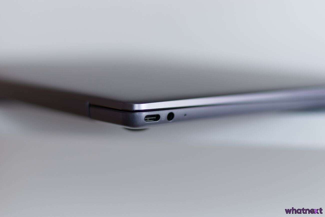 MateBook 13 jest wyposażony w trzy porty. USB-C oraz gniazdo Jack 3,5mm na lewym boku obudowy oraz USB-C na prawym. Jest to fatalne rozwiązanie, przez które rozstawanie się z dołączoną przejściówką jest praktycznie niemożliwe. Co też nie jest idealnym rozwiązaniem, bo mamy na niej tylko jeden duży port USB plus kolejny USB-C, VGA oraz HDMI.