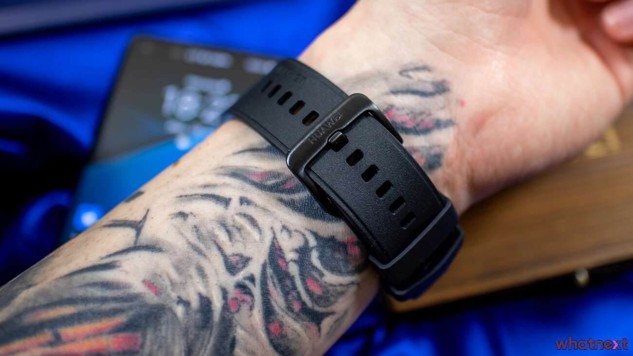 W moim udziale przypadł Watch GT 2 Pro w wersji Sport, wyposażonej w pasek fluoroelastomerowy… Przekładając to na nieco bardziej zrozumiały język, jest to syntetyczny kauczuk na bazie fluorowęglowodorów. Materiał odporniejszy i bardziej trwały od typowej gumy. Ma przy tym ciekawe właściwości. Pasek się nie odkształca, ale jest bardzo miękki i elastyczny. Jak założę zegarek, ładnie się zaokrągla i dopasowuje do reki. Jak go zdejmę i odłożę, jest idealnie płaski i prosty. W razie potrzeby można go łatwo zdjąć i wymienić na dowolny inny o szerokości 22mm.
