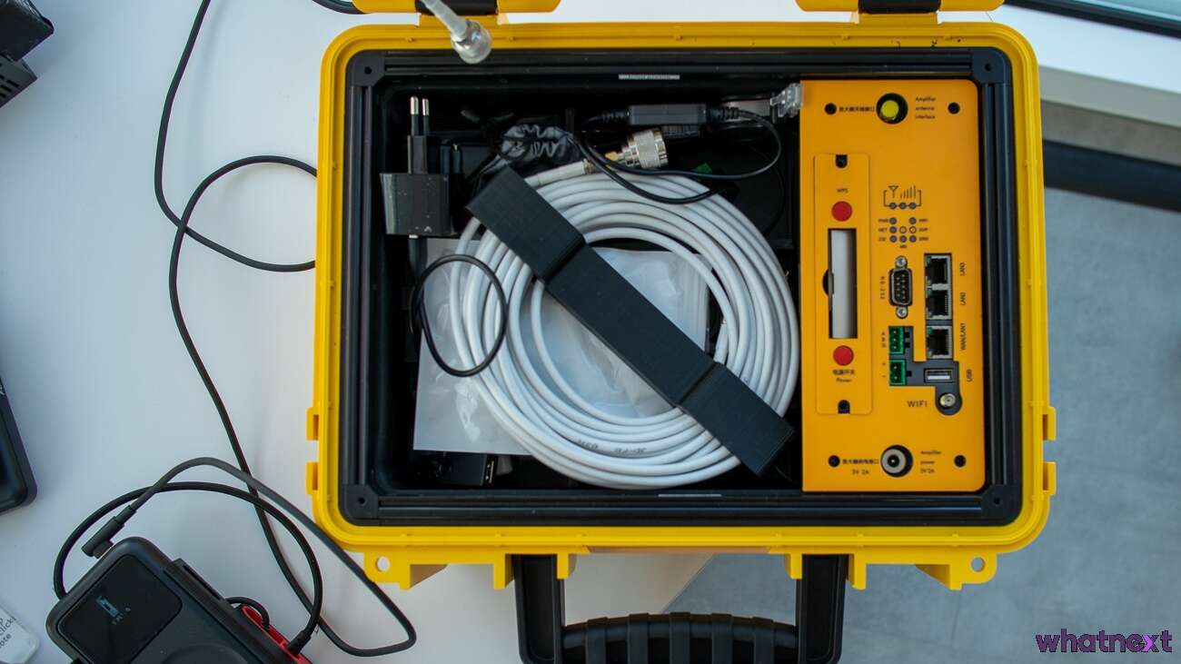 Na pierwszy rzut oka – bojler. Prostopadłościenna konstrukcja z wystającymi dwoma rurkami – niebieską i czerwoną. Jak nic urządzenie do podgrzewania wody. Ale żarty na bok. Mniejsza z konstrukcji (Light 5G 32T32R AAU) widoczna na zdjęciu to modułowa stacja bazowa sieci 5G. Ten konkretny model mieści w sobie 192 niewielkie anteny. Jak na swój rozmiar całość wazy niedużo, bo 24 kg, a maksymalna moc urządzenia to 240W. Choć należy pamiętać, że w praktyce nie zdarzają się sytuacje, w których nadajniki pracują z pełną mocą.