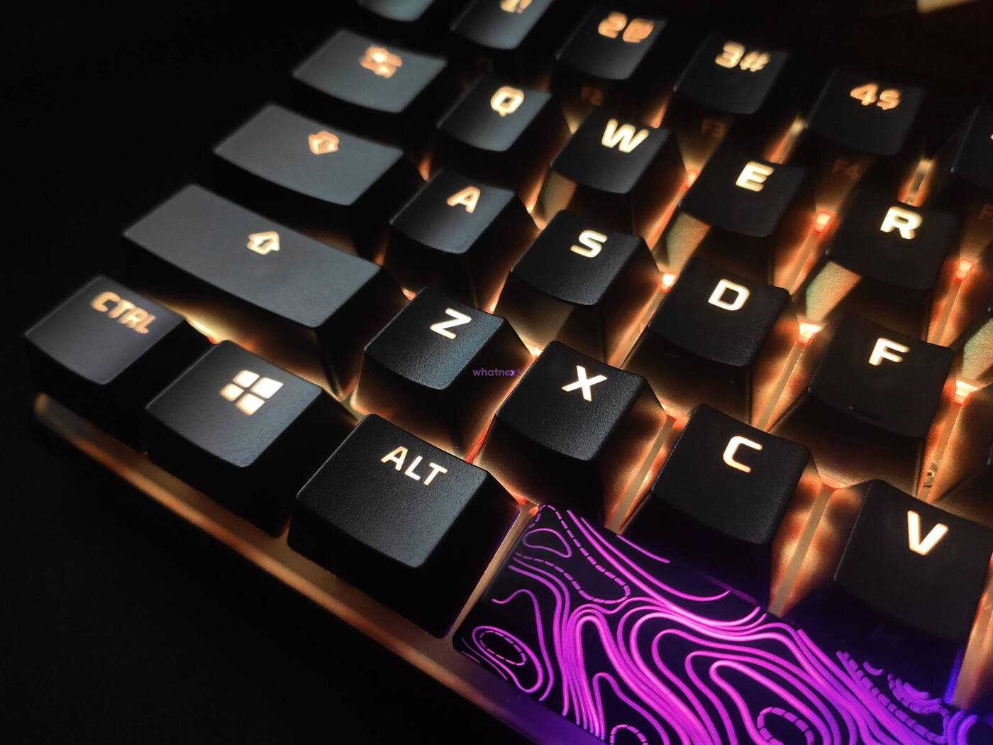 Jeśli z kolei idzie o sam rozkład klawiszy, to należy docenić HyperX za nie tylko klawisze F1-F12 ukryte pod klawiszami 0-9, ale też te pokroju delete, print-screen, czy strzałek, które rozłożono głównie w prawej części klawiatury. Oprócz nich znalazło się kilka tych funkcyjnych, a nawet multimedialnych, do których funkcji uzyskujemy dostęp po wciśnięciu klawisza funkcyjnego w prawym dolnym rogu.