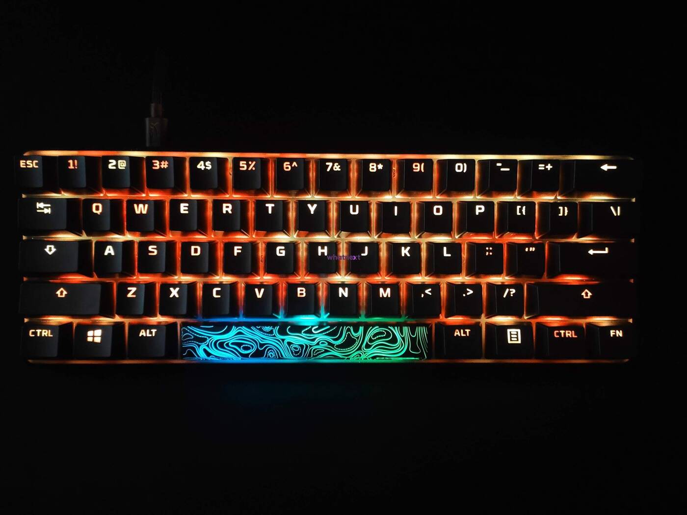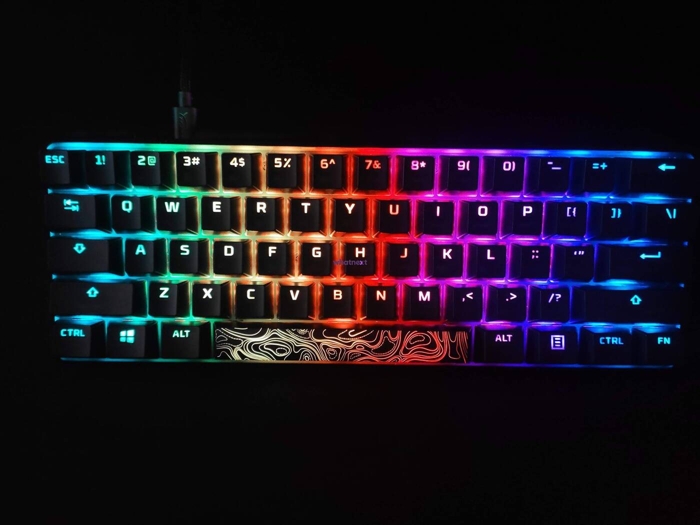 Zwłaszcza że HyperX Alloy Origins 60 posiada świetny system podświetlenia, na który składają się wyciągnięte nad przełącznik jasne diody RGB oraz świetnie wykrojona czcionka. Zwłaszcza w przypadku dodatkowego klawisza spacji o topograficznym wręcz wykończeniu, choć muszę przyznać, że niektóre szczegóły nie są tak dobrze oświetlane, a mowa tutaj głównie o… małej literce A klawisza ALT.