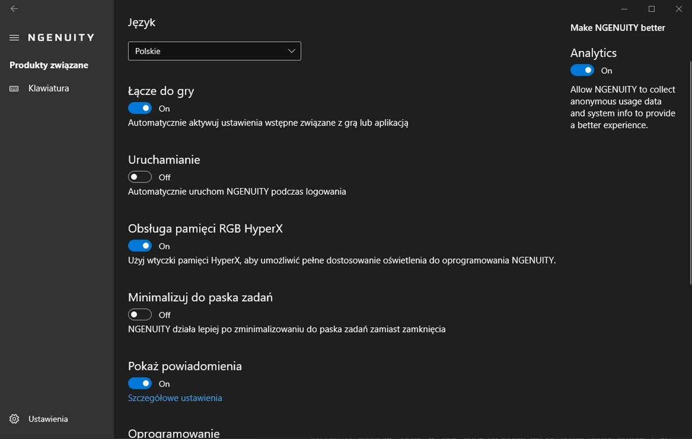 Jak to standardowo u HyperX bywa, do zarządzania Pulsefire Haste wykorzystujemy dostępne w Microsoft Store (na Windowsie 10) oprogramowanie NGenuity, gdzie znajdziemy też inne sprzęty marki. Dzięki niemu zaktualizujemy firmware, skonfigurujemy profile i finalnie zapiszemy je w pamięci myszki. Chociaż znajdziecie w opcjach wybór języka polskiego, ja sugeruję Wam pozostanie na wersji angielskiej, bo i tak większość interfejsu będzie w języku obcym. Dodatkowo aktywacja opcji HyperX RGB Memory Support znacząco obniża stabilność aplikacji, więc jej lepiej nie dotykajcie.