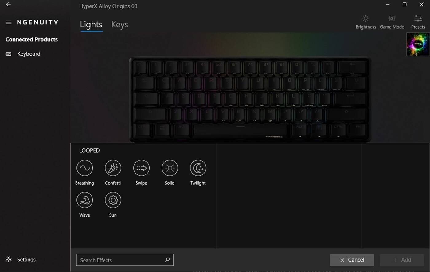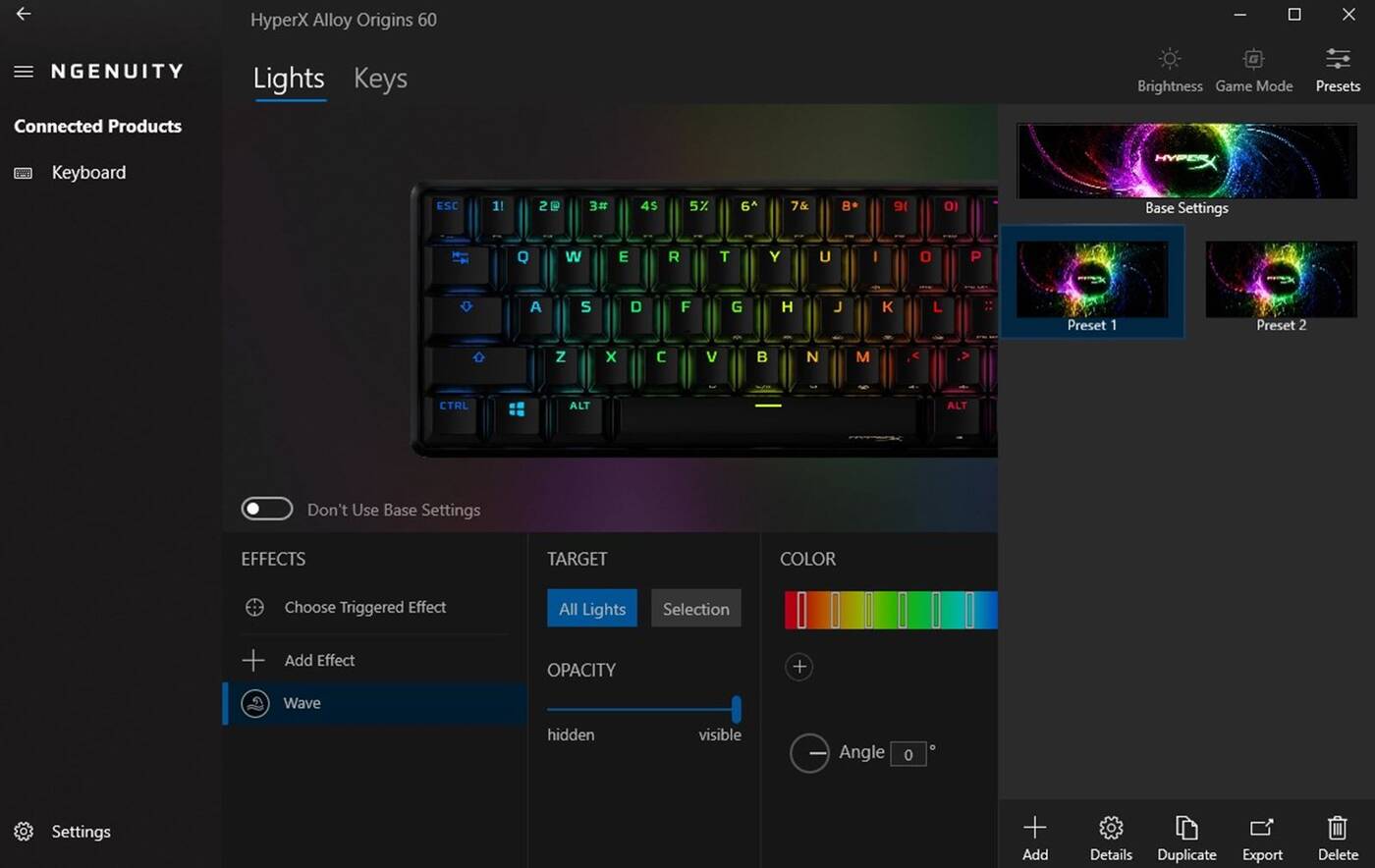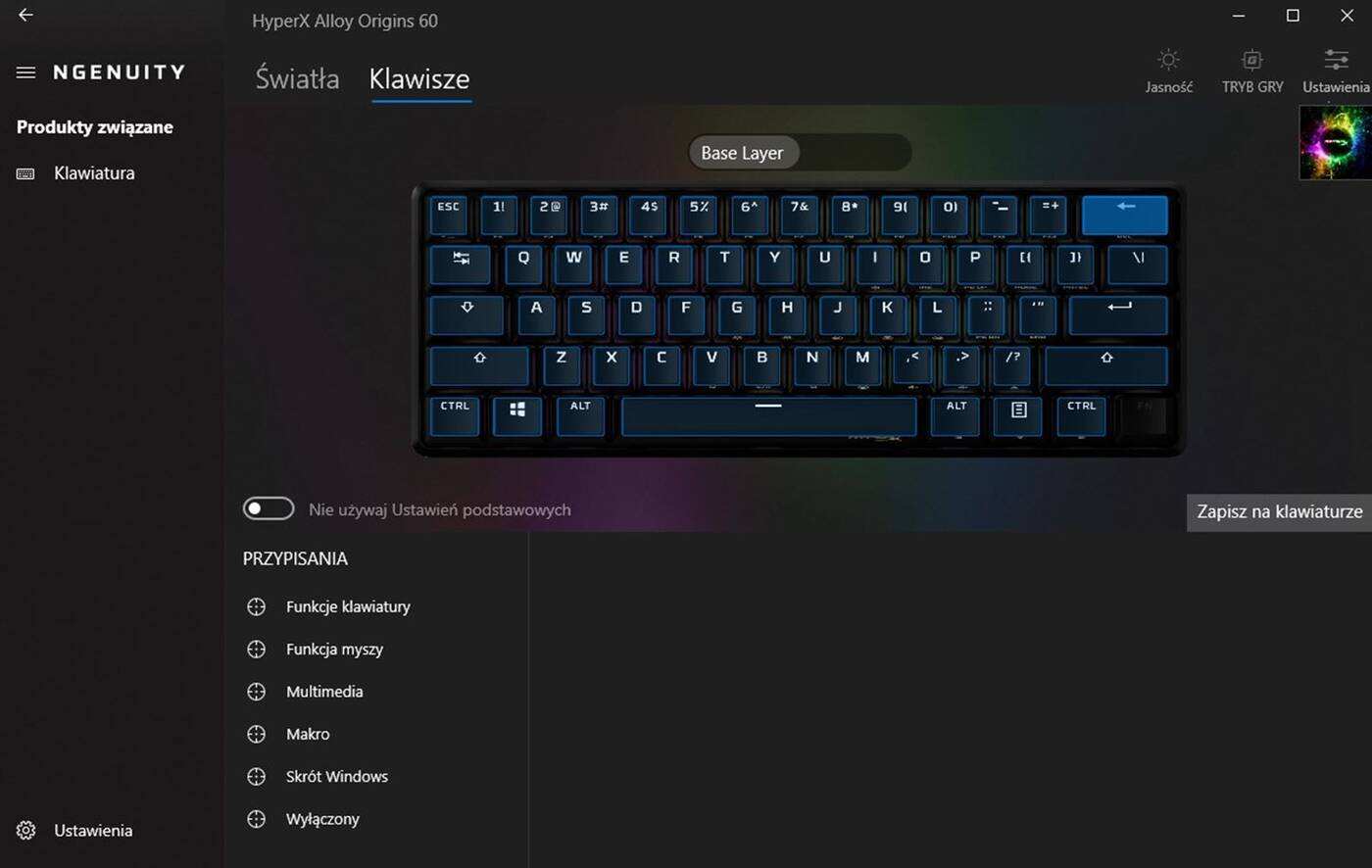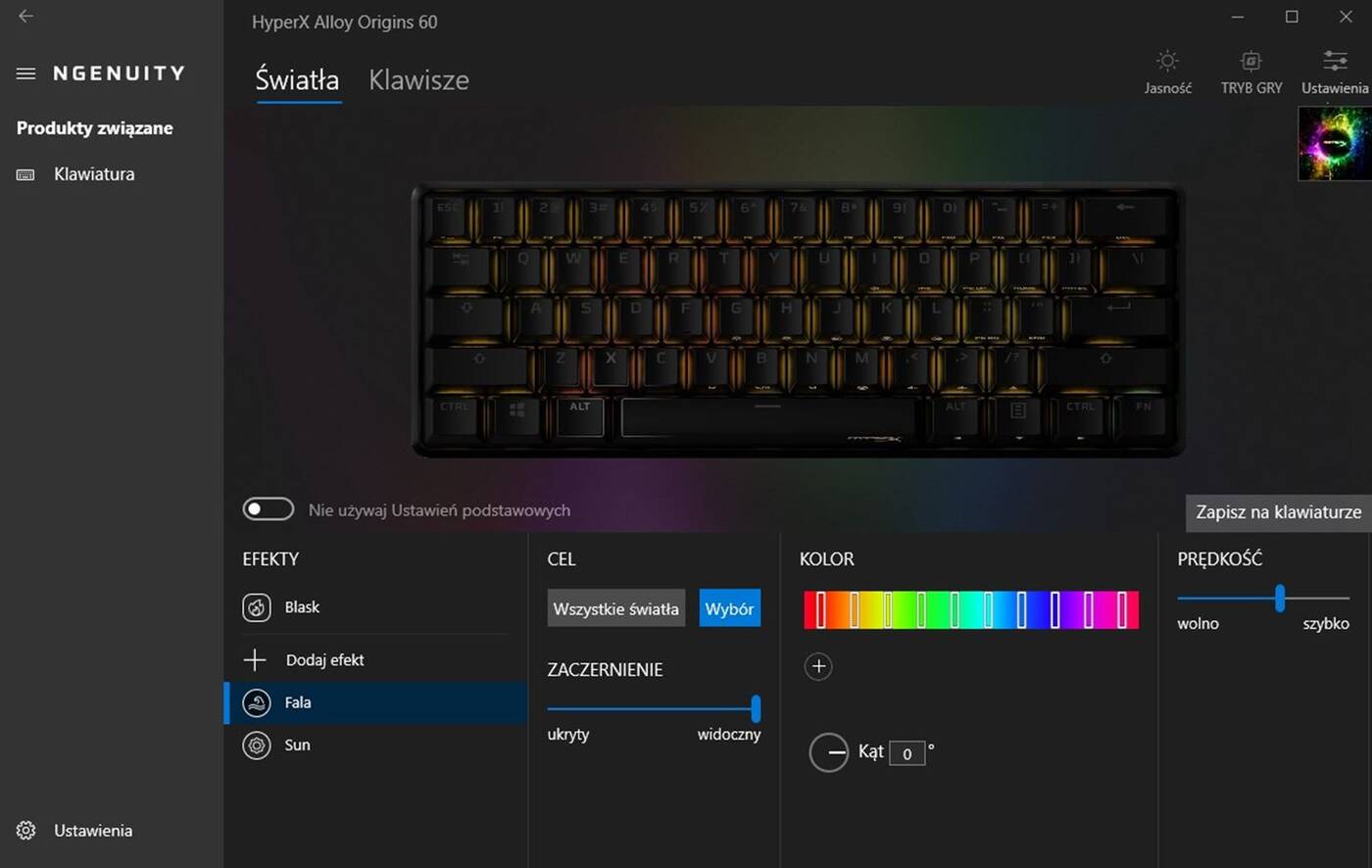 Najwięcej zabawy jest jednak z podświetleniem, bo oczywiście HyperX zadbał o podstawowe ustawienia pokroju jasności, czy szybkości oraz kierunku efektu, ale to, co jest w moich oczach najważniejsze, to możliwość ustawienia każdej diody osobno. Chociaż efektów na liście nie ma wielu, to są one jak najbardziej wystarczające, pozwalając nawet ustawić efekt stały i momentu aktywacji w jednym momencie.