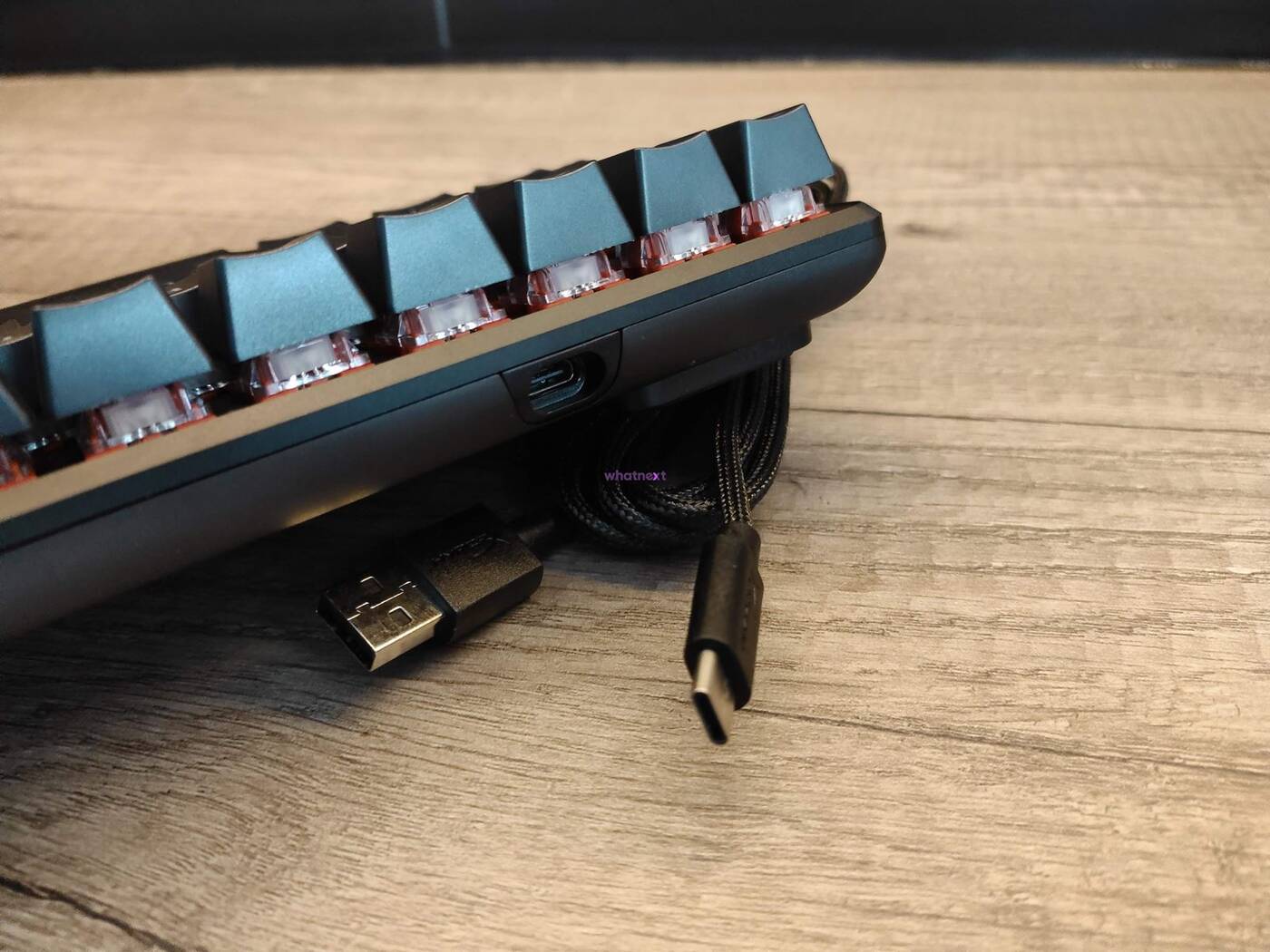 Warto też wspomnieć o umieszczonym w lewej części tylnej krawędzi portu USB typu C, do którego wpinamy dobrze opleciony przewód w materiałowym oplocie, który zachowuje pewien stopień sztywności. Kilka słów należy się też klawiszom, czyli nakładkom na przełączniki. HyperX chwali się, że te zostały stworzone z formowanego dwuwarstwowo materiału PBT, który jest odporny na zużycie, tarcie i działanie rozpuszczalników.