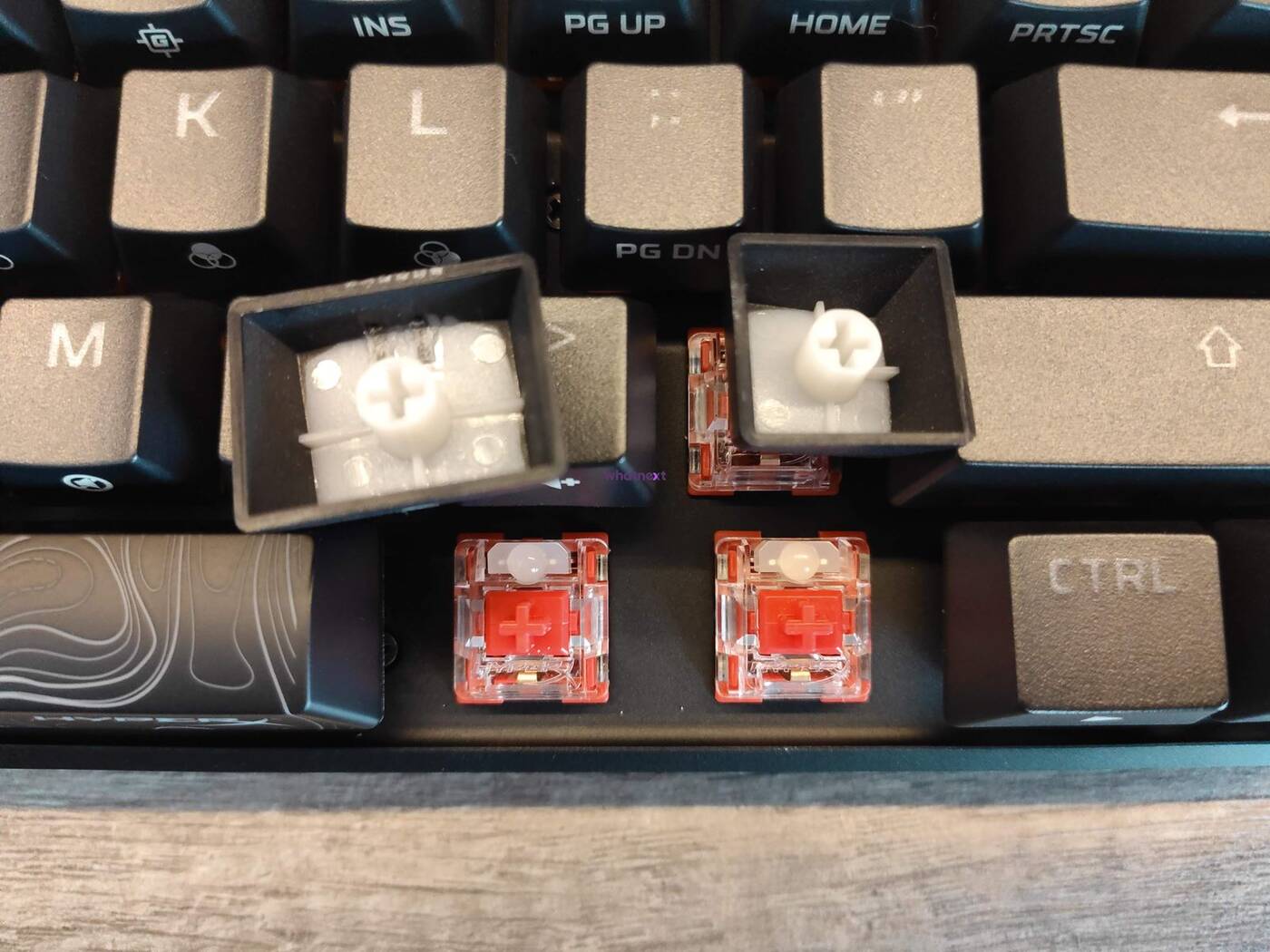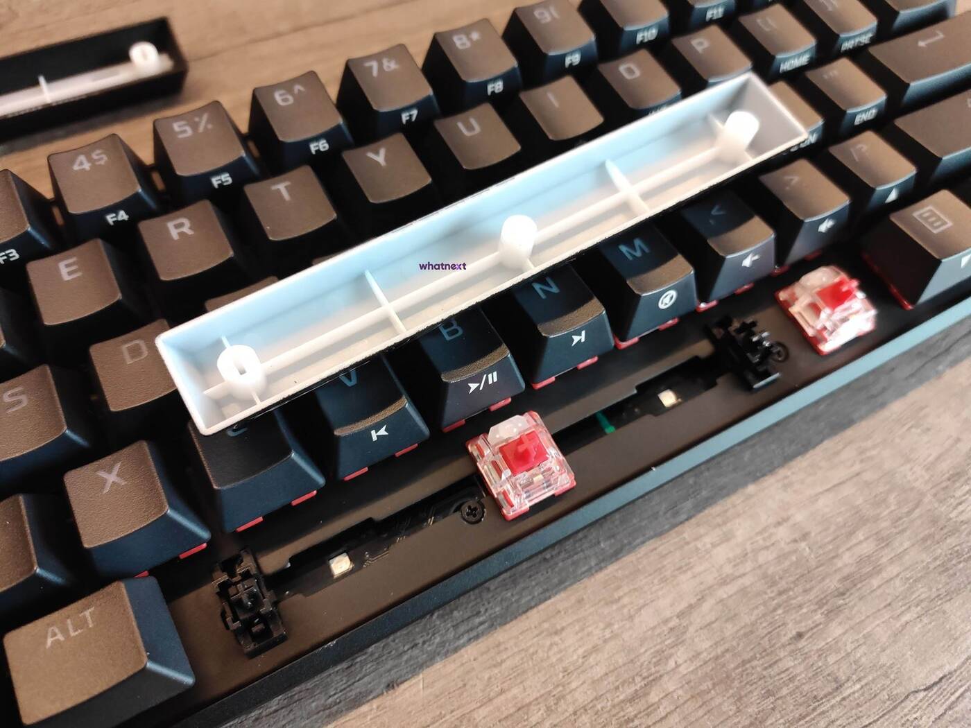 Zapewne wiecie, że te małe klawisze bazują zwykle na jednym przełączniku i tyle – nic poza tym. Problem zaczyna się więc pojawiać przy klawiszach dłuższych pokroju spacji, entera, shifta, czy backspace i to właśnie HyperX rozwiązał wzorowo, decydując się nie na jakieś tam sprężynki, a podobne do przełączników „wsporniki”, które pozostają stałe i dzięki temu utrzymują stabilność przełącznika bez zauważalnego wpływania na niego pod kątem działania.