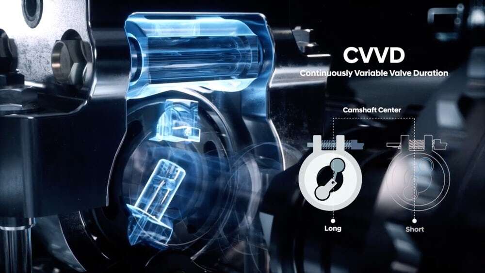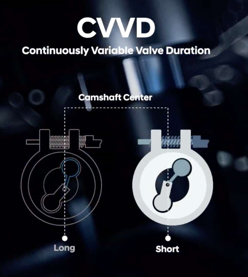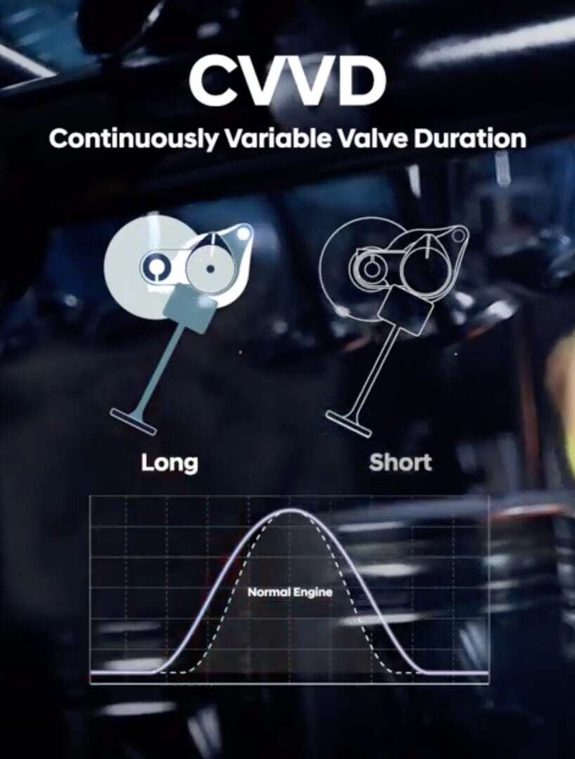 Według Hyundaia jego technologia różni się ona od znanych nam systemów zmiennych faz rozrządu, ponieważ w nich czas zamykania zaworu zależy od momentu otwarcia zaworu. System CVVD dostosowuje czas otwarcia zaworu tak, że pozostawia je dłużej otwartymi przy niższych obrotach i niższym obciążeniu silnika, aby poprawić wydajność poprzez zmniejszenie oporu sprężania. Tak się bowiem składa, że przy wyższych obrotach i obciążeniach silnika, zawory zamykają się szybciej na początku suwu sprężania, aby zmaksymalizować ilość powietrza w cylindrze, gdy iskra go zapali i zapewnić w rezultacie dodatkowy moment obrotowy i wydajność.