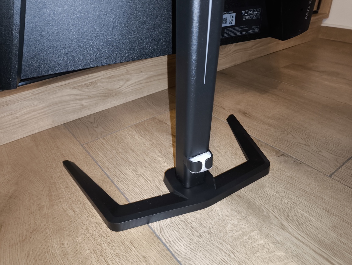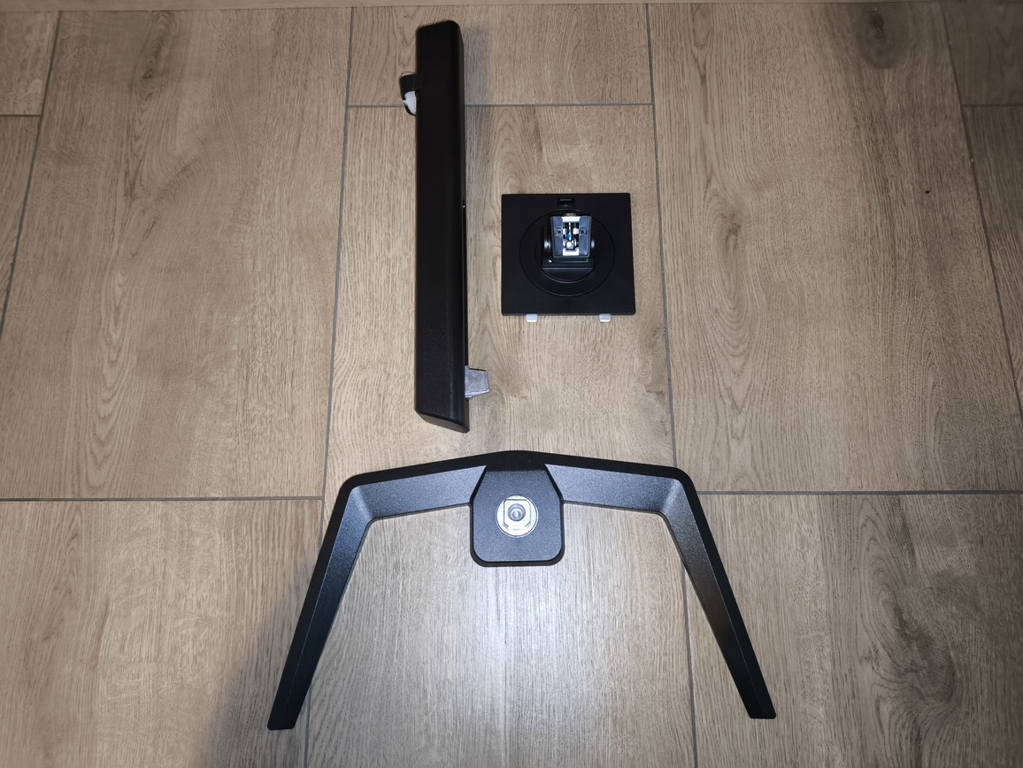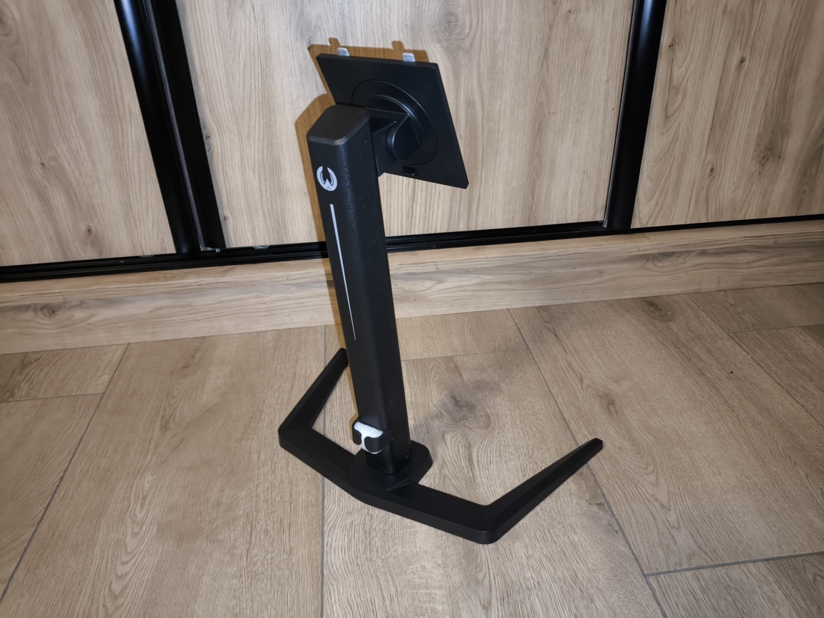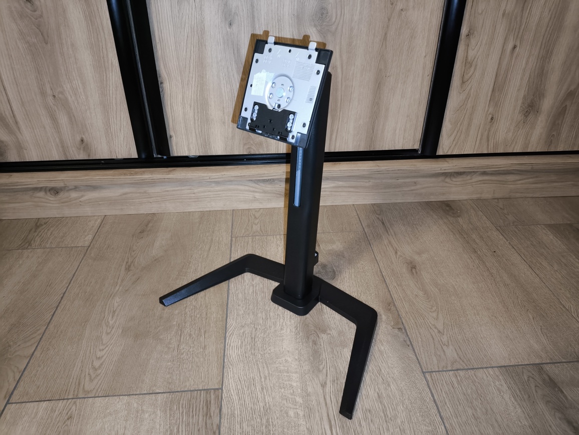 Podstawa monitora składa się z dwóch elementów – pionowego trzpienia oraz szerokiego ramienia. Montaż odbywa się bez użycia narzędzi – całość skręca się za pomocą pokrętła. Główna zaleta tego zestawu to pełna ergonomia – monitor pozwala na: