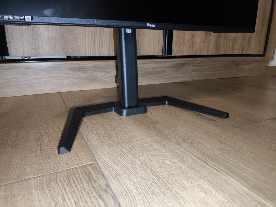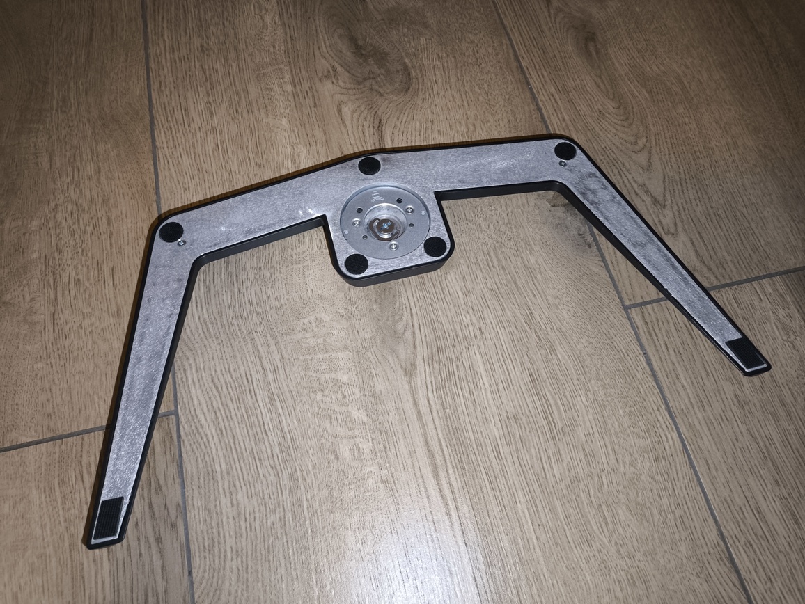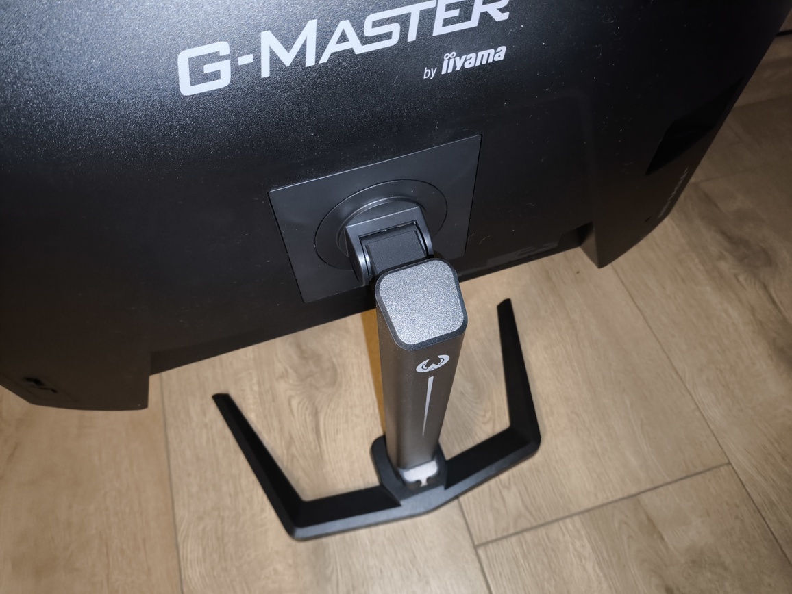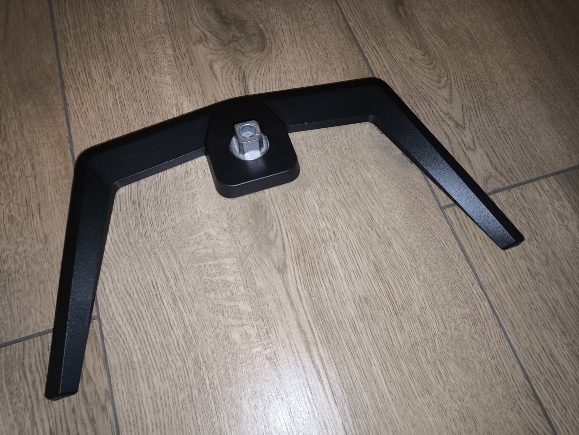Podstawa monitora składa się z dwóch elementów – pionowego trzpienia oraz szerokiego ramienia. Montaż odbywa się bez użycia narzędzi – całość skręca się za pomocą pokrętła. Główna zaleta tego zestawu to pełna ergonomia – monitor pozwala na: