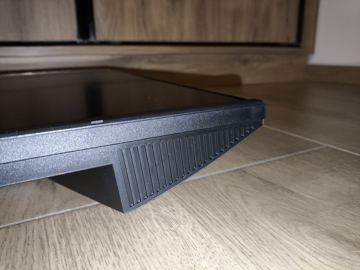 Mechanizmy działają precyzyjnie – są sztywne, ale nie wymagają dużej siły. Nie ma mowy o przypadkowym opadaniu czy chybotaniu panelu. W podstawie znajdziemy też prosty organizer na przewody – plastikową obręcz, przez którą można poprowadzić kable. Dla bardziej zaawansowanych użytkowników dostępne jest także mocowanie VESA 100 x 100 mm.