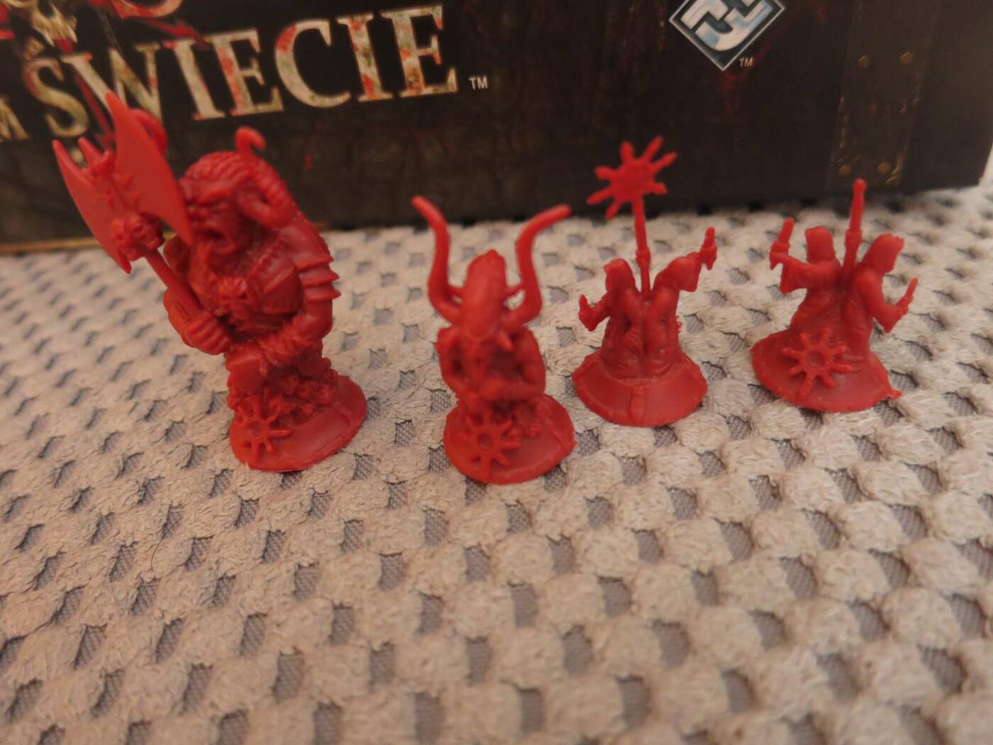 Figurki? Jak na obecne standardy szału nie robią. Jasne, są dość szczegółowe, ale też miękkie, przez co niezbyt trwałe. Bardzo fajnie wyglądają chorągwie u akolitów prawda? Pierwsze odpadną przy rozpakowaniu gry, kolejna połowa zniknie po pierwszej partii. Nie wspominając już o tym, że wszystkie figurki zapakowano tylko w jedne wielki worek strunowy…