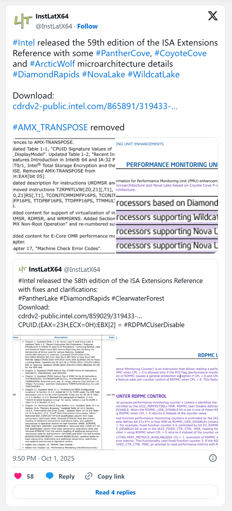 Intel oficjalnie ujawnił architektury rdzeni, które będą napędzać nadchodzące procesory dla komputerów klienckich i centrów danych. Szczegóły znalazły się w najnowszym dokumencie ISA Extensions Reference, rzucając światło na to, czego można się spodziewać po rodzinach Nova Lake oraz Diamond Rapids.