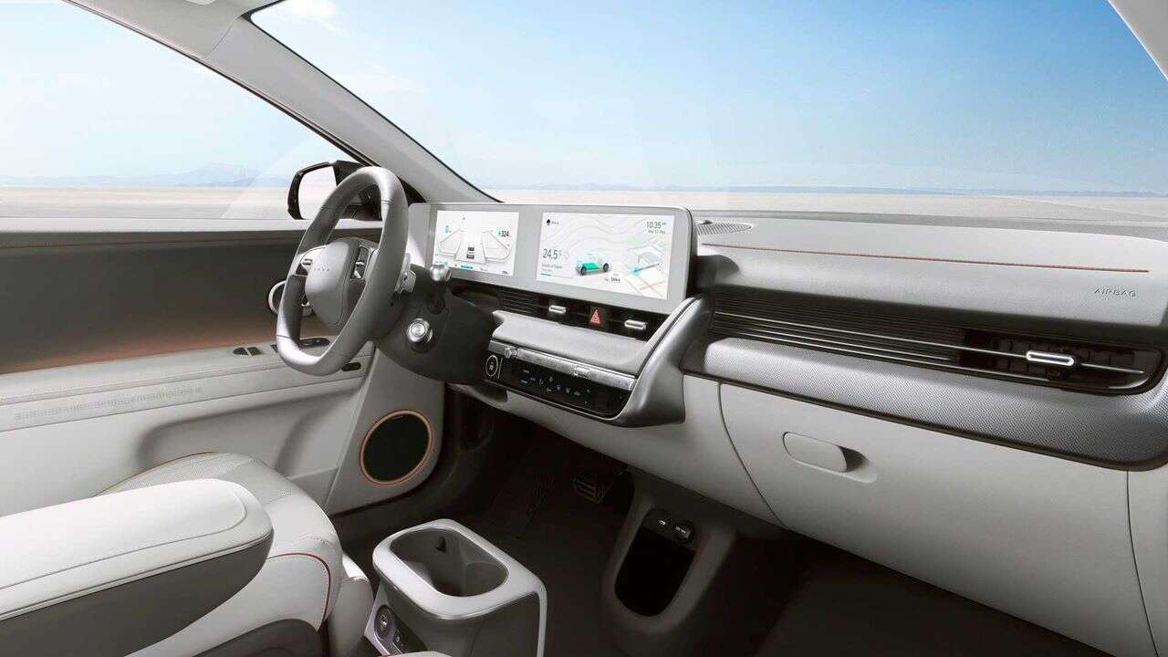 Wewnątrz Ioniq 5 oferuje miejsce dla pięciu osób i co tu dużo mówić – czerpie pełnymi garściami z zalet elektrycznej platformy, zapewniając ogrom miejsca wewnątrz na czele z 531-litrowym bagażnikiem (1600-litrowym po złożeniu siedzeń). Pod kątem technologii możecie liczyć na parę 12-calowych wyświetlaczy cyfrowych, czy opcję dachu solarnego.
