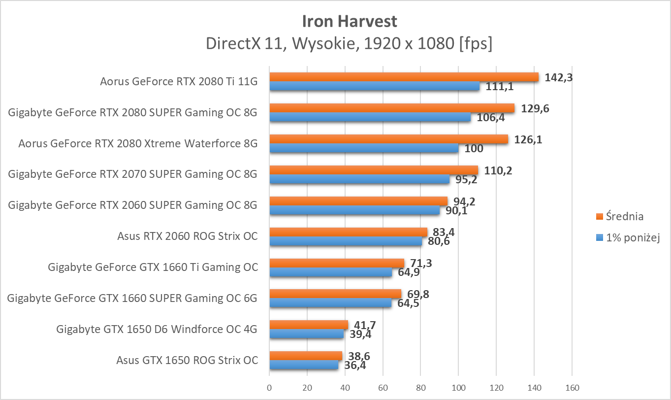 Zgodnie z oczekiwaniami, Iron Harvest to bardzo wymagający tytuł. Do uzyskania 60 fps w rozdzielczości Full HD potrzeba przynajmniej GTX 1660 SUPER – tutaj jeszcze nie jest tak źle. Najmocniejsze grafiki zapewniają ponad 100 fps, co jest dobrym rezultatem. Przy kartach GTX 1650 można też mówić o płynnej grze – w końcu jest to RTS, więc te 40 fps również powinno wystarczyć.