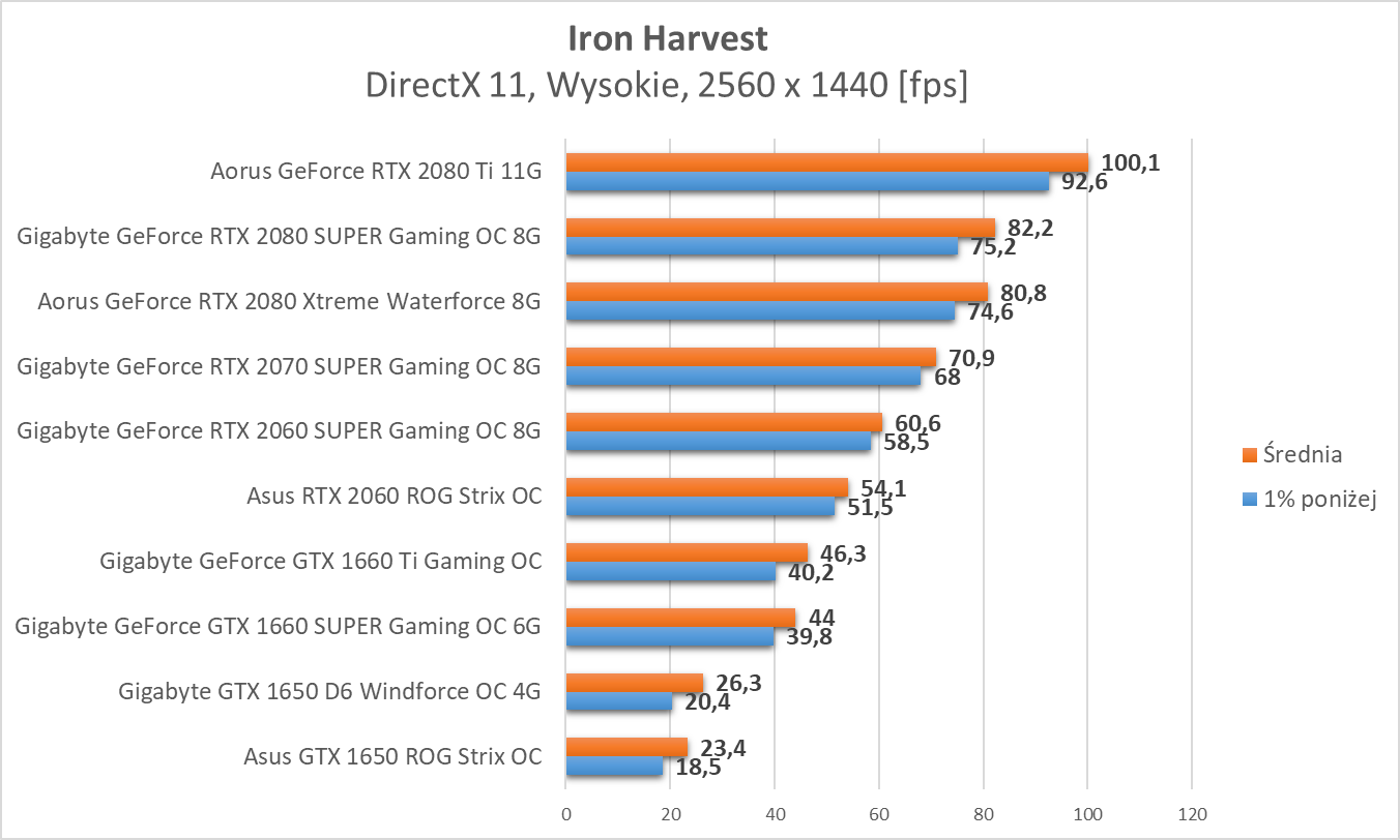 Iron Harvest to wymagająca gra w wyższych rozdzielczościach dla kart graficznych. Jedynie w Full HD nie jest tak źle i mając kartę pokroju GTX 1660 SUPER możecie w ciemno odpalać maksymalne detale. Przy rozdzielczości 2560 x 1440 px potrzebujecie RTX 260 SUPER do uzyskania 60 fps, a w 4K przy żadnej z kart nie osiągniecie takiej wartości. Tutaj trzeba będzie obniżyć detale, jeśli będziecie chcieli cieszyć się z tej magicznej liczby fps.