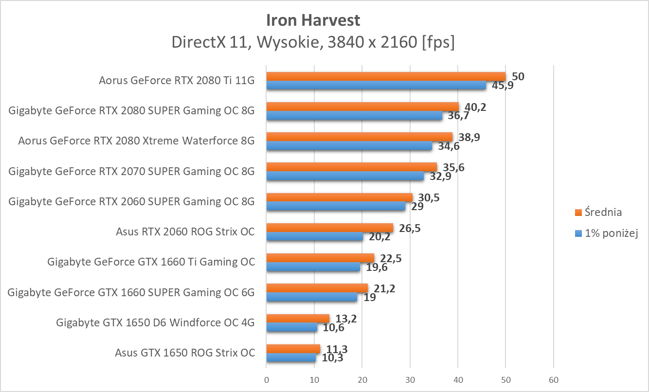 W rozdzielczości 3840 x 2160 jest już pogrom. Żadna z kart nie osiągnęła średnio 60 fps, co pokazuje wymagania Iron Harvest. RTX 2080 Ti miał średnio 50 fps – jest to jednak również płynna rozgrywka. Przy kartach do tak naprawdę RTX 2060 SUPER włącznie ciężko jest mówić o płynnej grze – fpsy spadają poniżej 30.