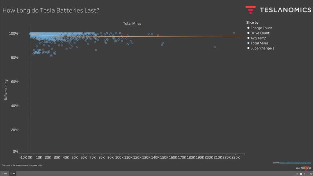 Na ich podstawie wynika, że choć występują skrajne przypadki, to w większości Modeli Tesli te zachowują wytrzymałość baterii pod kątem pojemności powyżej 90% nawet po przejechaniu 160000 kilometrów.