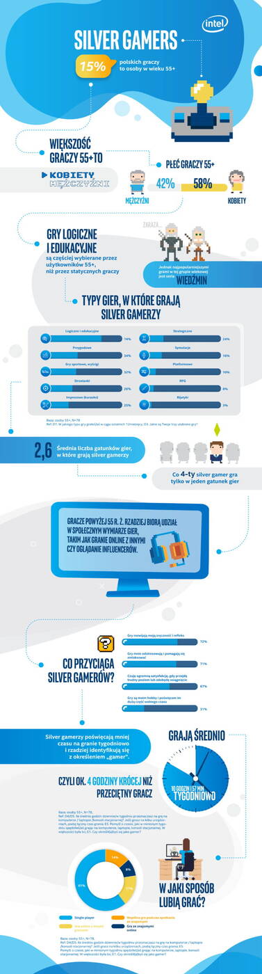 Łącznie 15% polskich graczy to osoby w wieku powyżej 55 lat. Co ciekawe, aż 58% z nich to kobiety. W co najczęściej grają silver gamerzy? Ulubiona seria gier to Wiedźmin (25%), The Sims (22%) i Fifa (21%). Dla przykładu w Pasjansa gra 8% badanych.