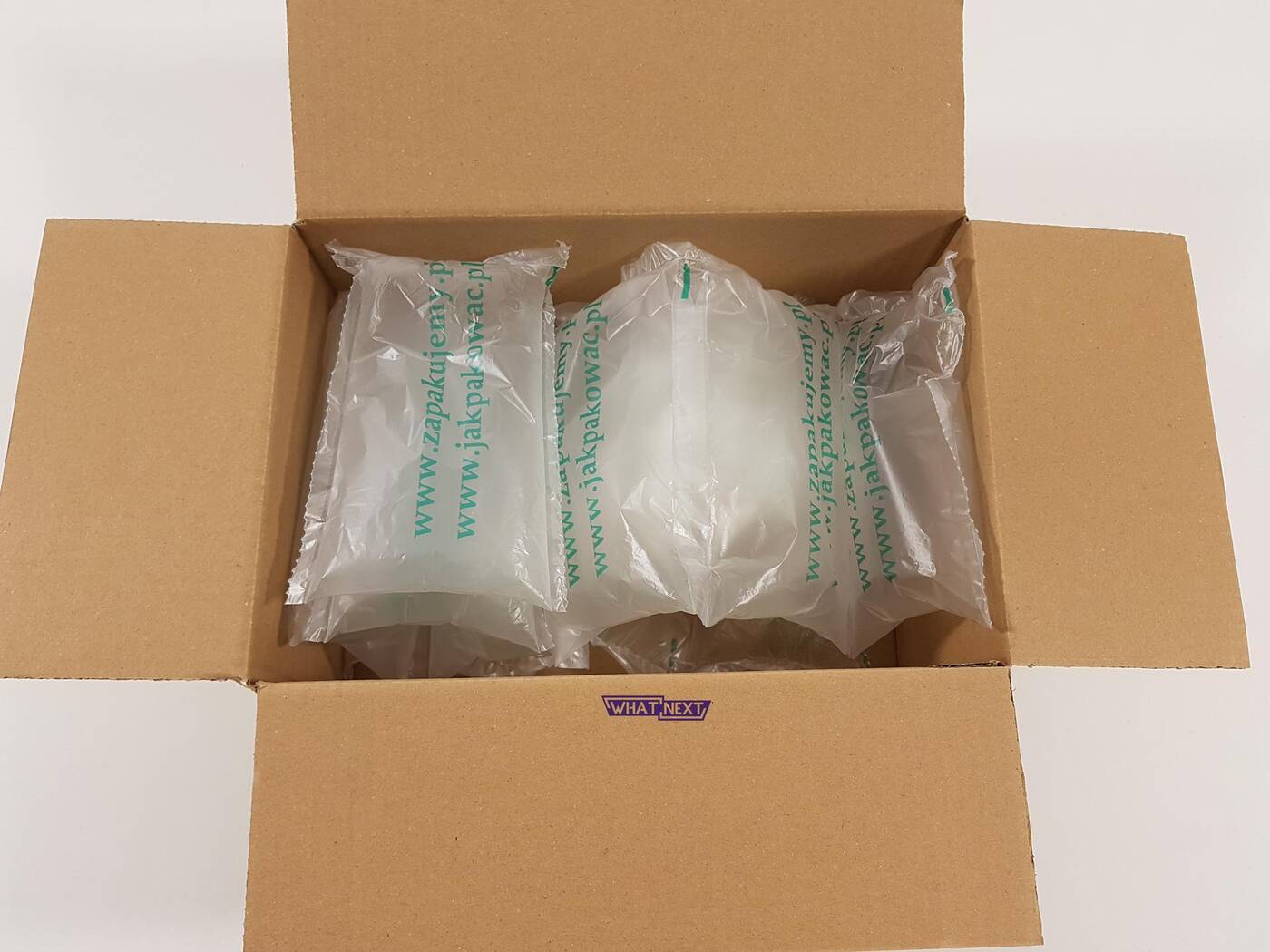 Szklanki zostały owinięte folią bąbelkową, a wolne miejsce w kartonie zostało wypełnione poduszkami powietrznymi. Powinno to zapewnić bezpieczeństwo podczas podróży.
