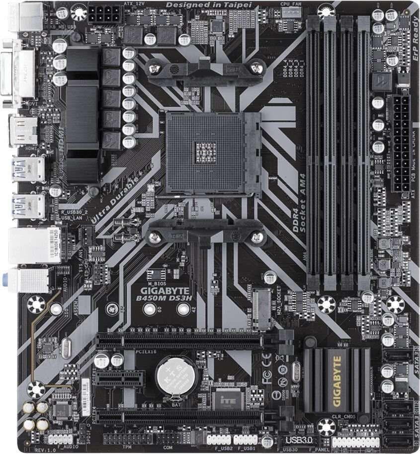 Pierwsza z płyt to bardzo podstawowy model, który po aktualizacji BIOS świetnie sprawdzi się z podstawowymi procesorami AMD. Gigabyte B450M DS3H jest bardzo często polecany do tańszych zestawów i nie ma się co dziwić. Płyta ma cztery złącza na pamięci RAM oraz obsługuje dyski NVMe. W połączeniu z takimi jednostkami jak Ryzen 3 3100 powinna się naprawdę świetnie spisywać.