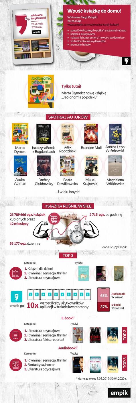 Książka wciąż rośnie w siłę, co bardzo nas cieszy. W ciągu minionych 12 miesięcy klienci księgarni Empik, Livro, Mole Mole oraz sieci sklepów Papiernik by Empik kupili aż 23,8 mln egzemplarzy książek! Podczas kwarantanny zanotowaliśmy też dziesięciokrotny wzrost zainteresowania e-bookami i pięciokrotny audiobookami. Widzimy więc, że czytelnicy coraz chętniej sięgają również po tę formę konsumpcji literatury. Ten rok jest szczególnie wymagający dla rynku wydawniczego, ponieważ z uwagi na zagrożenie epidemiczne odwołane zostały najważniejsze wydarzenia książkowe, w tym targi. Maj od lat jest miesiącem premier, dlatego jako największy sprzedawca książek online w Polsce postanowiliśmy skorzystać z możliwości, jakie daje nam internet, aby w bezpiecznej formule zapewnić tysiącom czytelników kontakt z ich ulubionymi autorami. Staraliśmy się, by jak najlepiej zaadaptować tradycyjne targi książki do wirtualnej formuły, nie rezygnując z żadnej z właściwych dla nich atrakcji – nawet możliwości zdobycia książek z autografem.