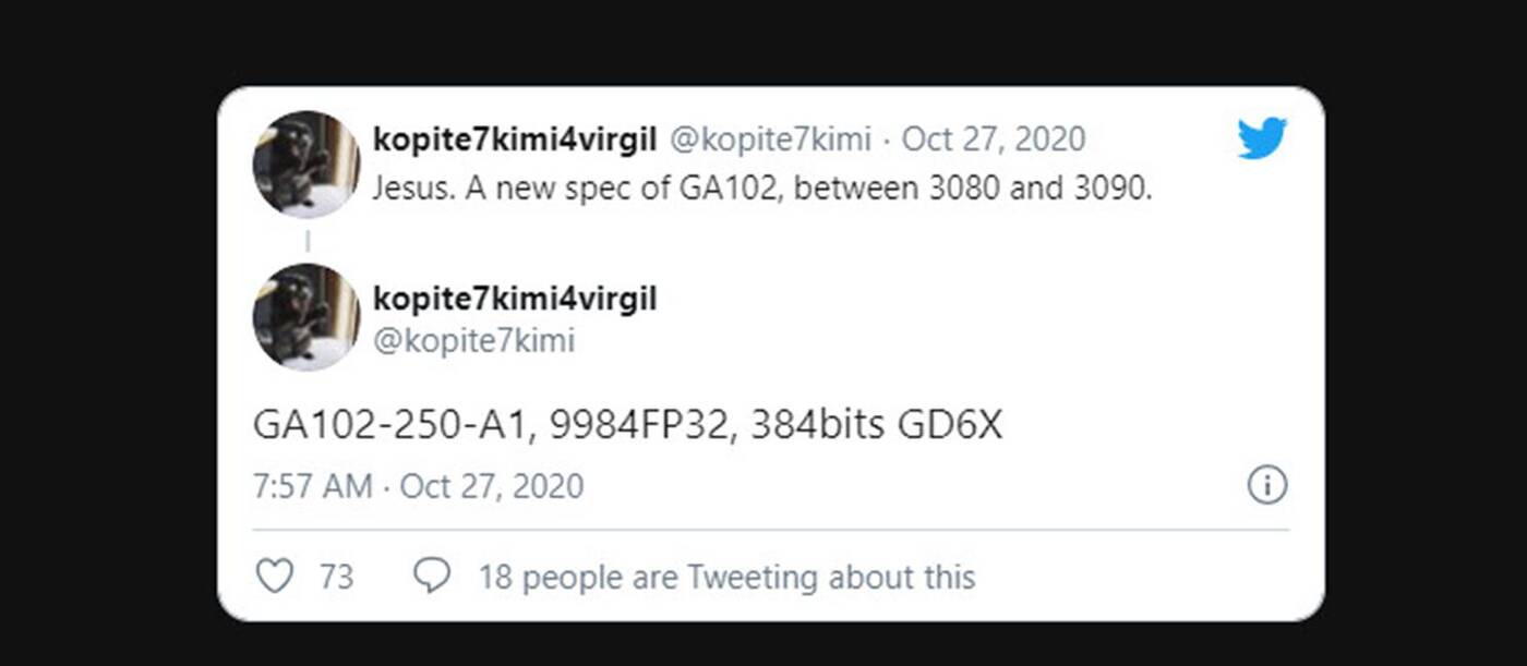 Teraz Kopite7kimi, znany gość od przedpremierowych informacji, które często rzeczywiście się spełniają, twierdzi, że NVIDIA już przygotowuje nową kartę graficzną opartą na GA102, znajdującą się pomiędzy RTX 3080 i RTX 3090.