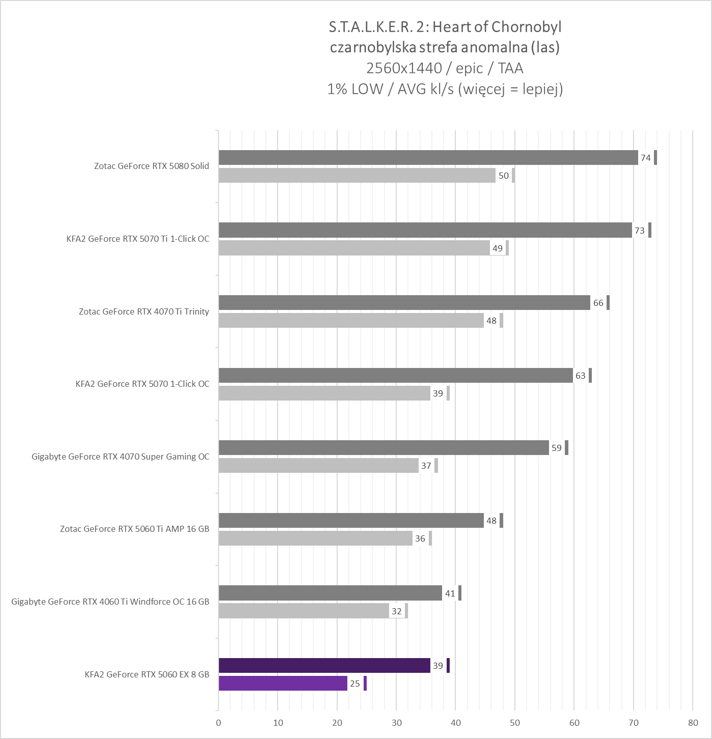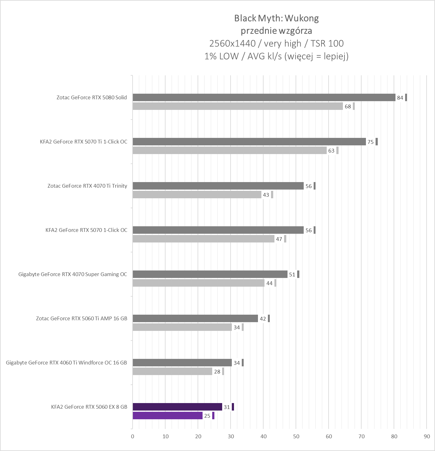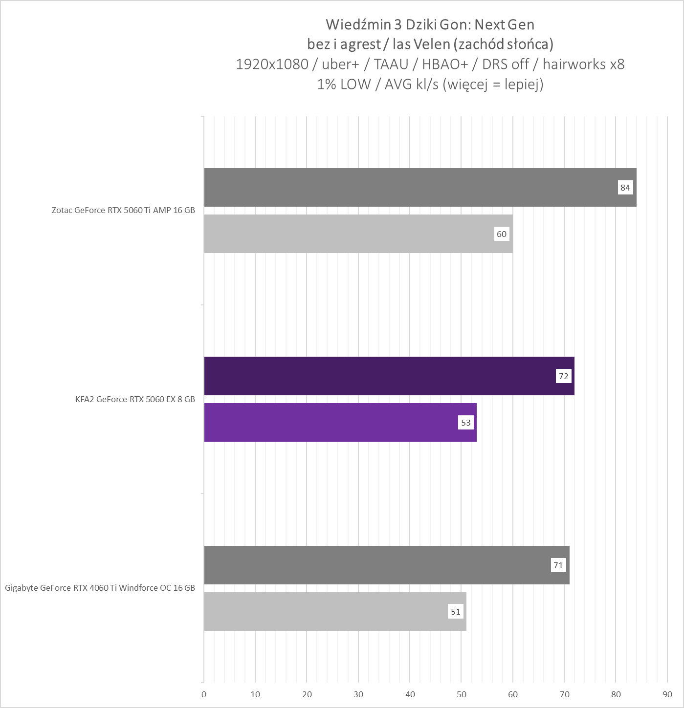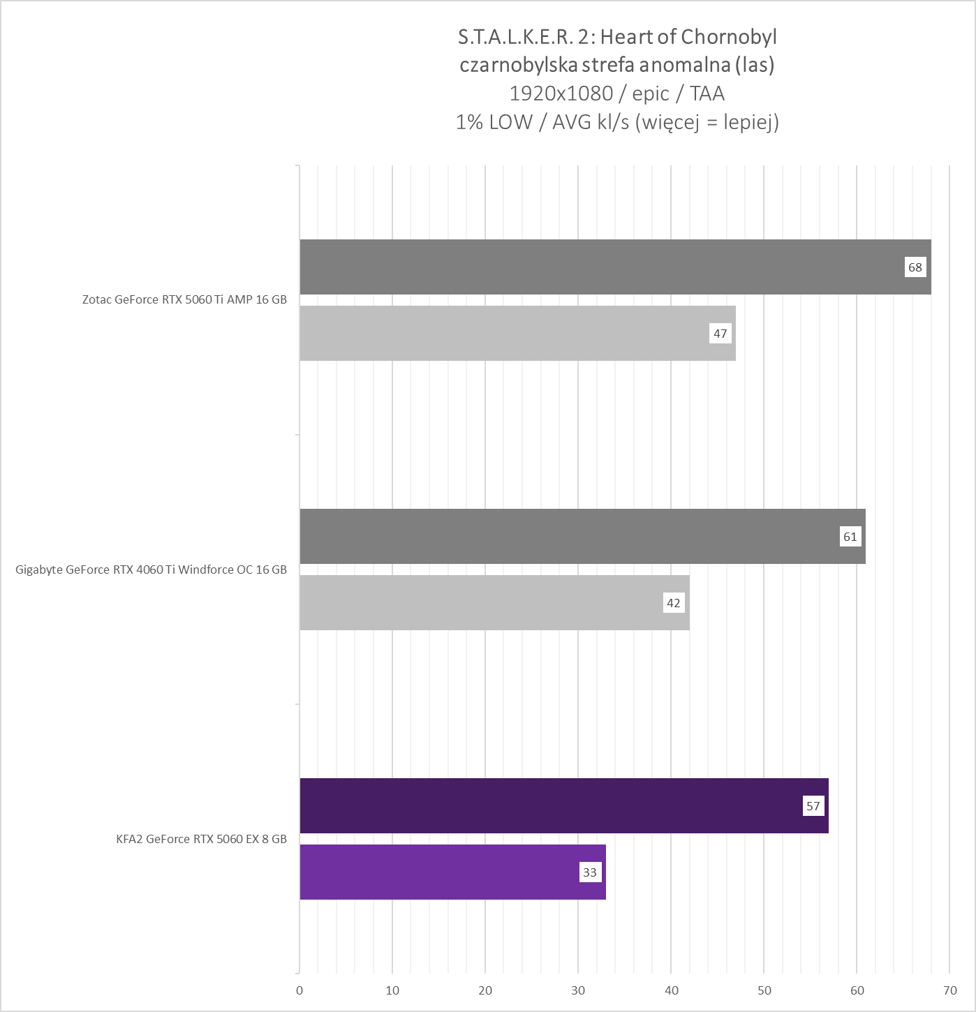 Testy karty graficznej przeprowadzono na systemie Windows 11 64-bit (wersja 23H2) z użyciem sterowników nVidia 576.52, w trakcie rzeczywistej rozgrywki. Do pomiaru liczby klatek wykorzystałem program CapeFrameX w wersji 1.7.2.