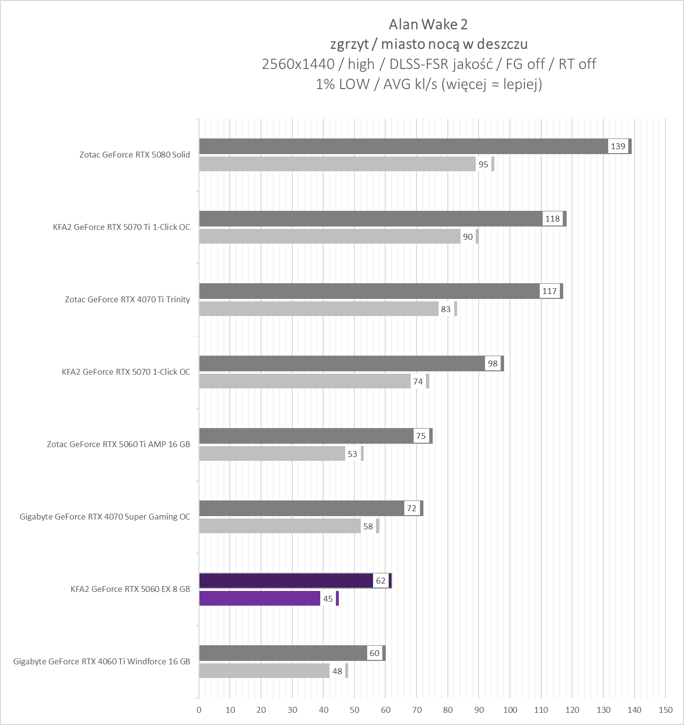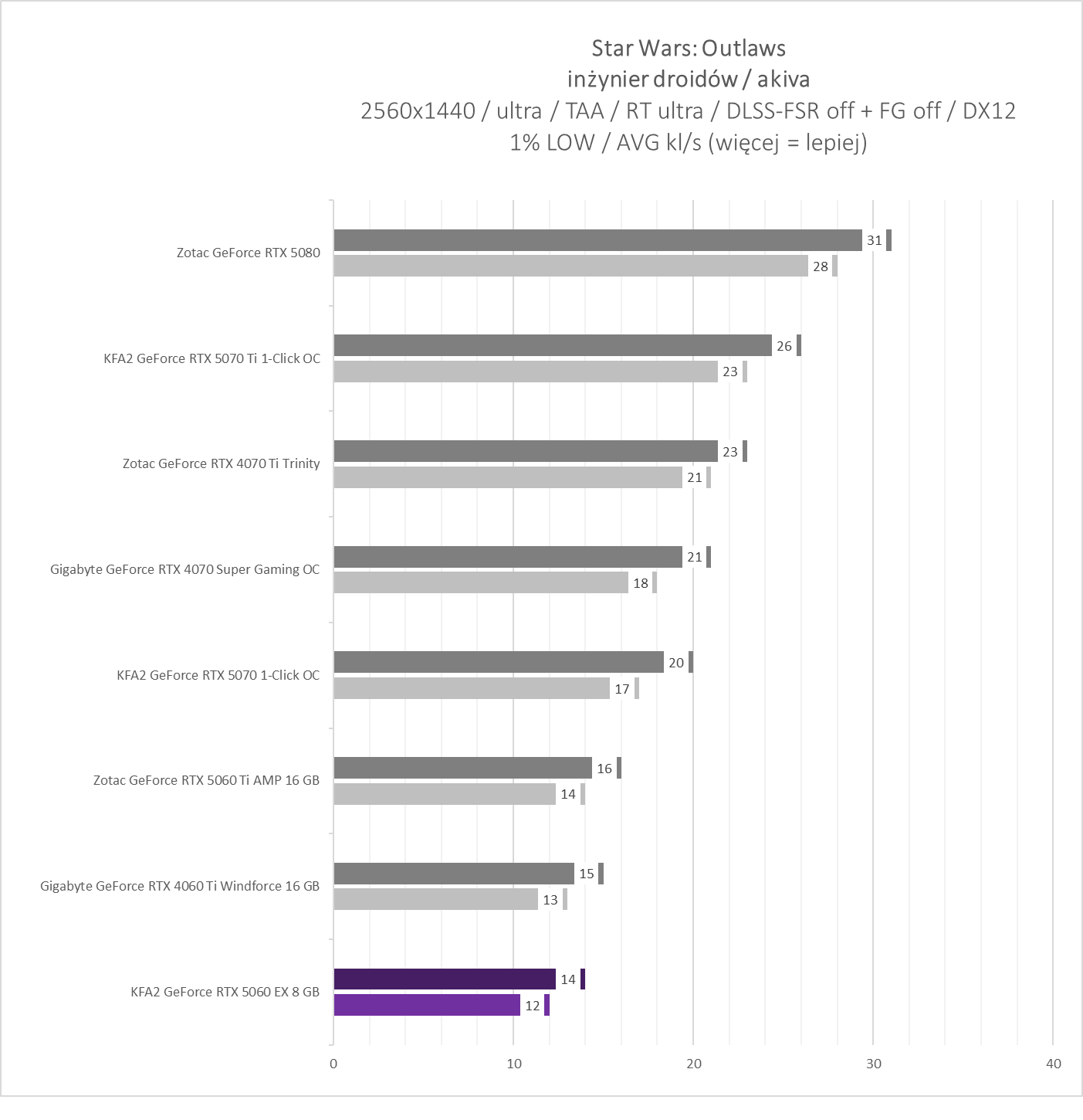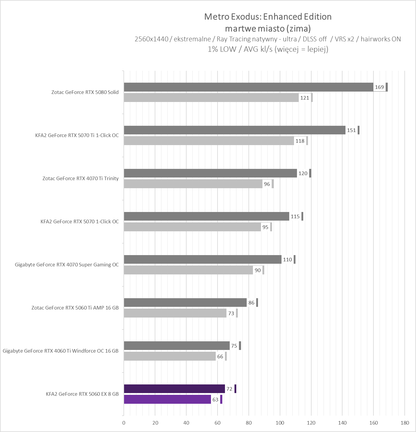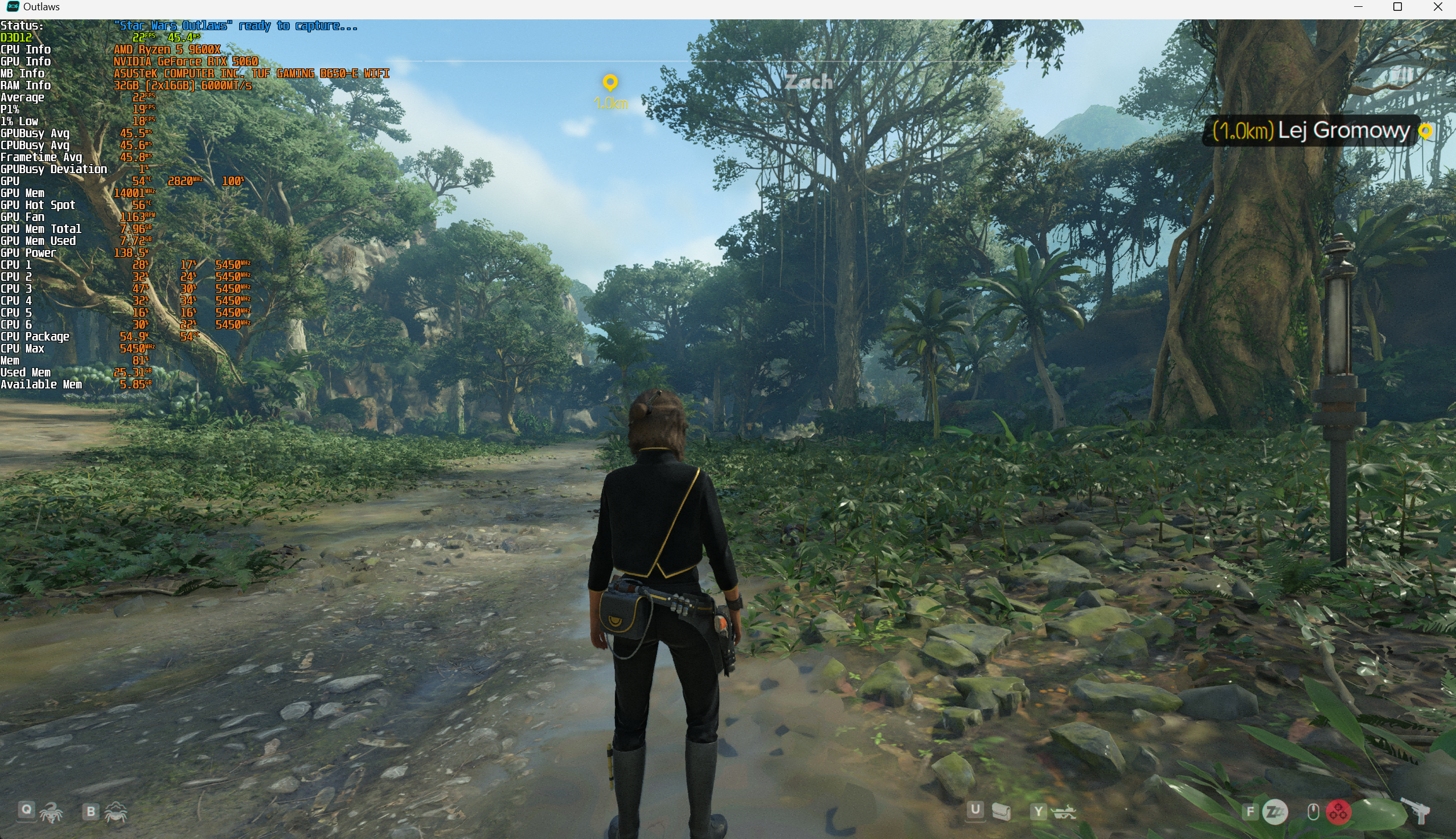 Testy karty graficznej przeprowadzono na systemie Windows 11 64-bit (wersja 23H2) z użyciem sterowników nVidia 576.52, w trakcie rzeczywistej rozgrywki. Do pomiaru liczby klatek wykorzystałem program CapeFrameX w wersji 1.7.2.