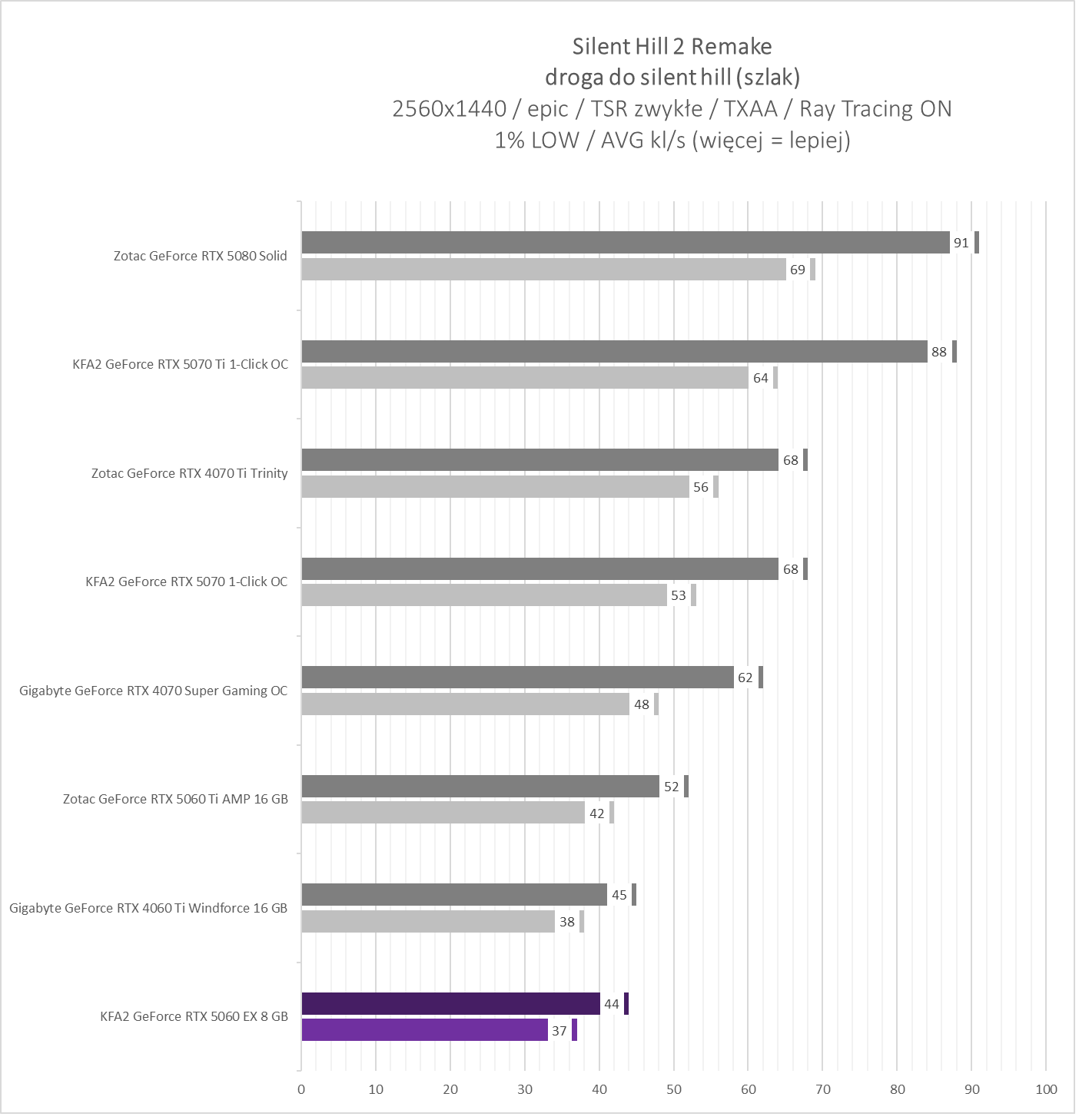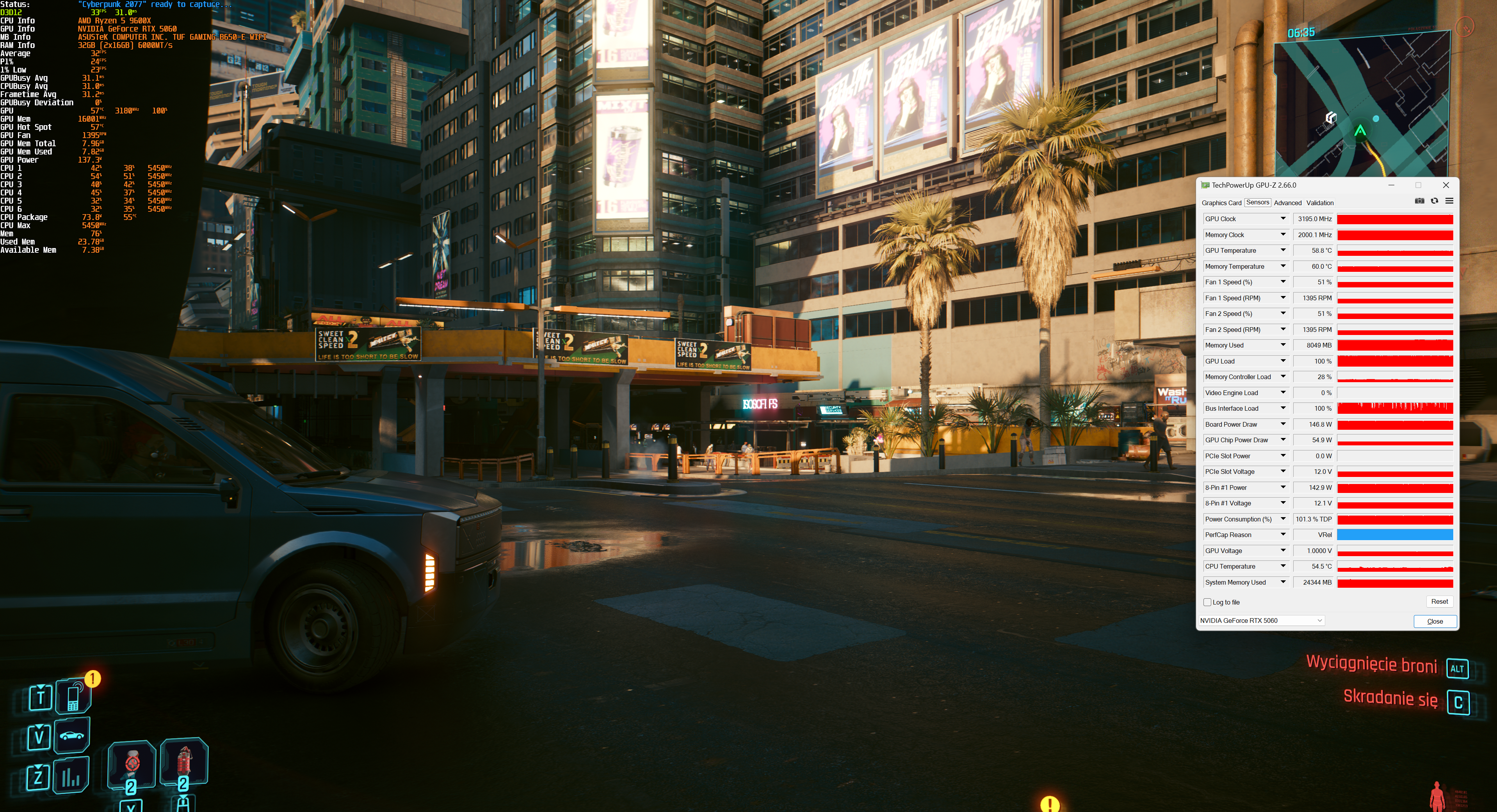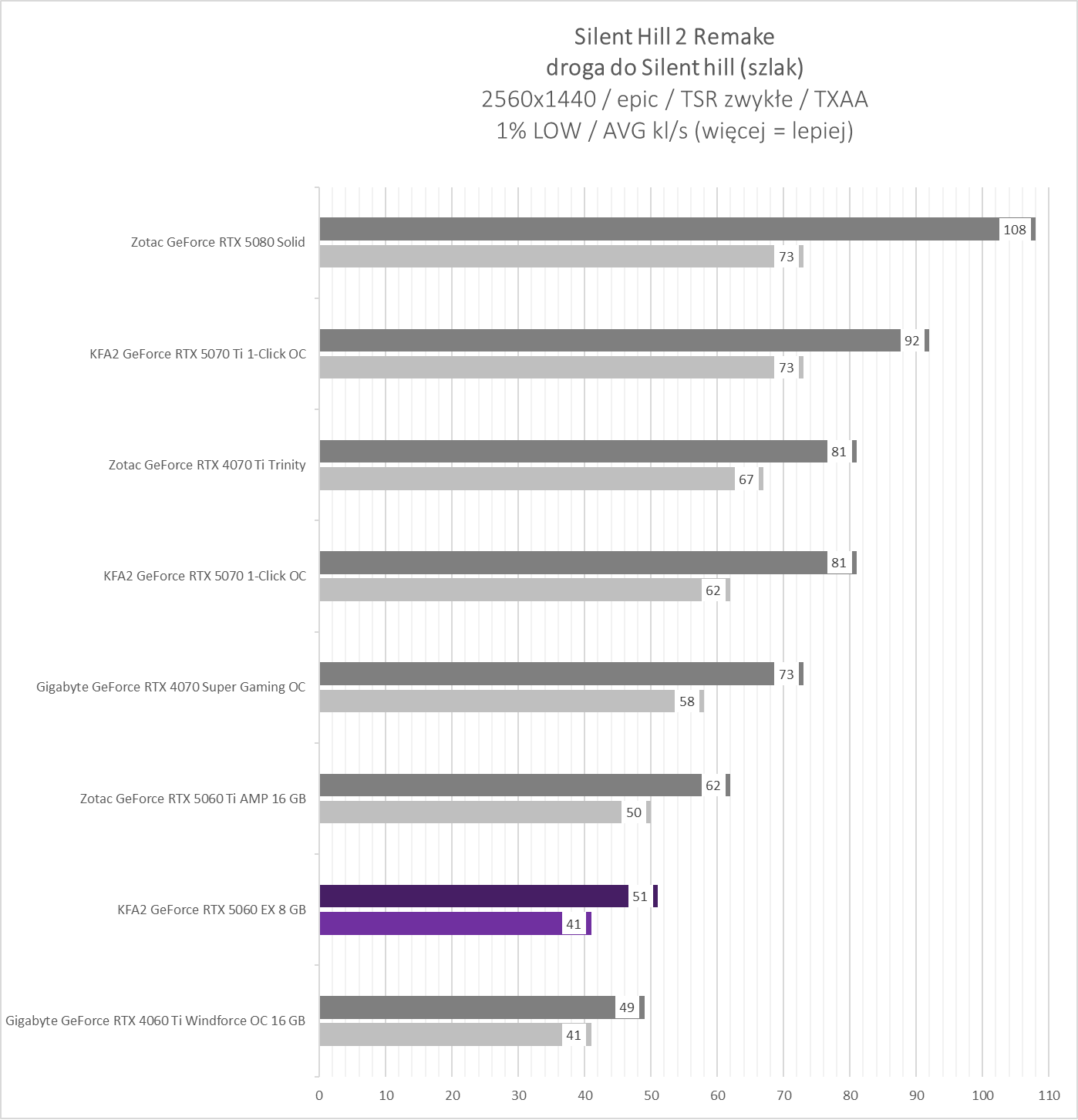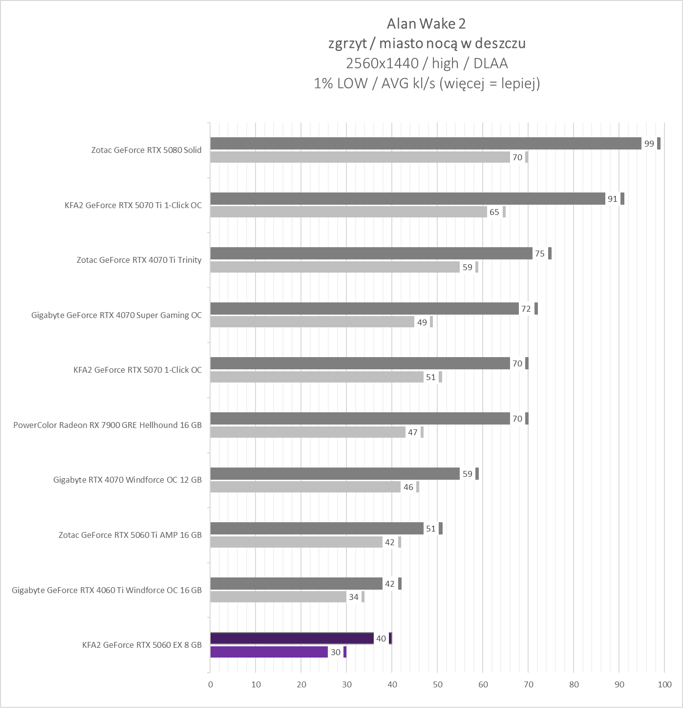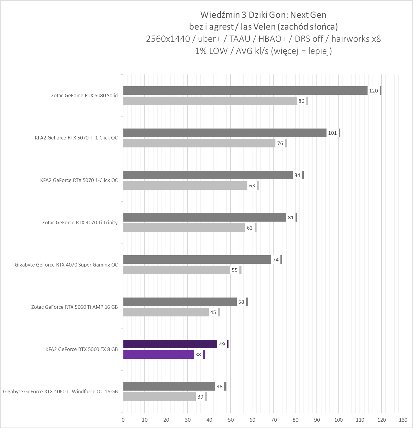 Testy karty graficznej przeprowadzono na systemie Windows 11 64-bit (wersja 23H2) z użyciem sterowników nVidia 576.52, w trakcie rzeczywistej rozgrywki. Do pomiaru liczby klatek wykorzystałem program CapeFrameX w wersji 1.7.2.