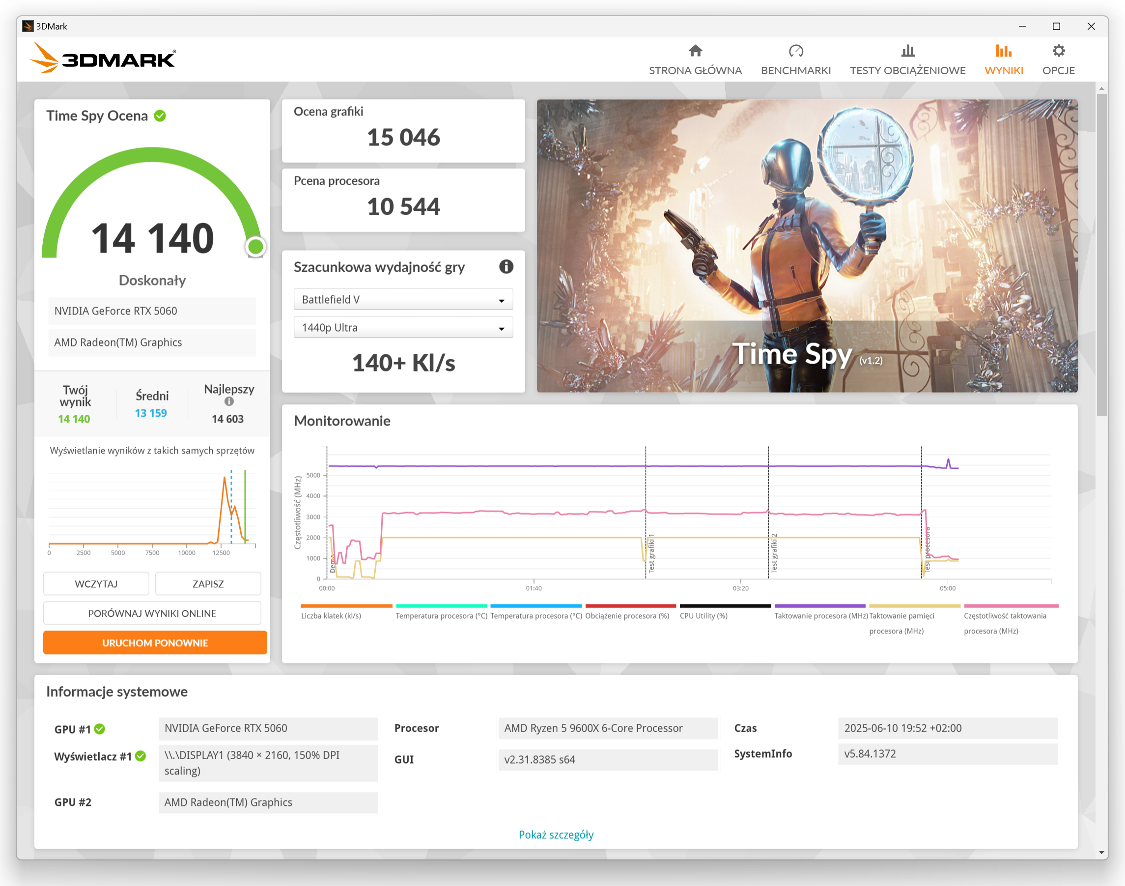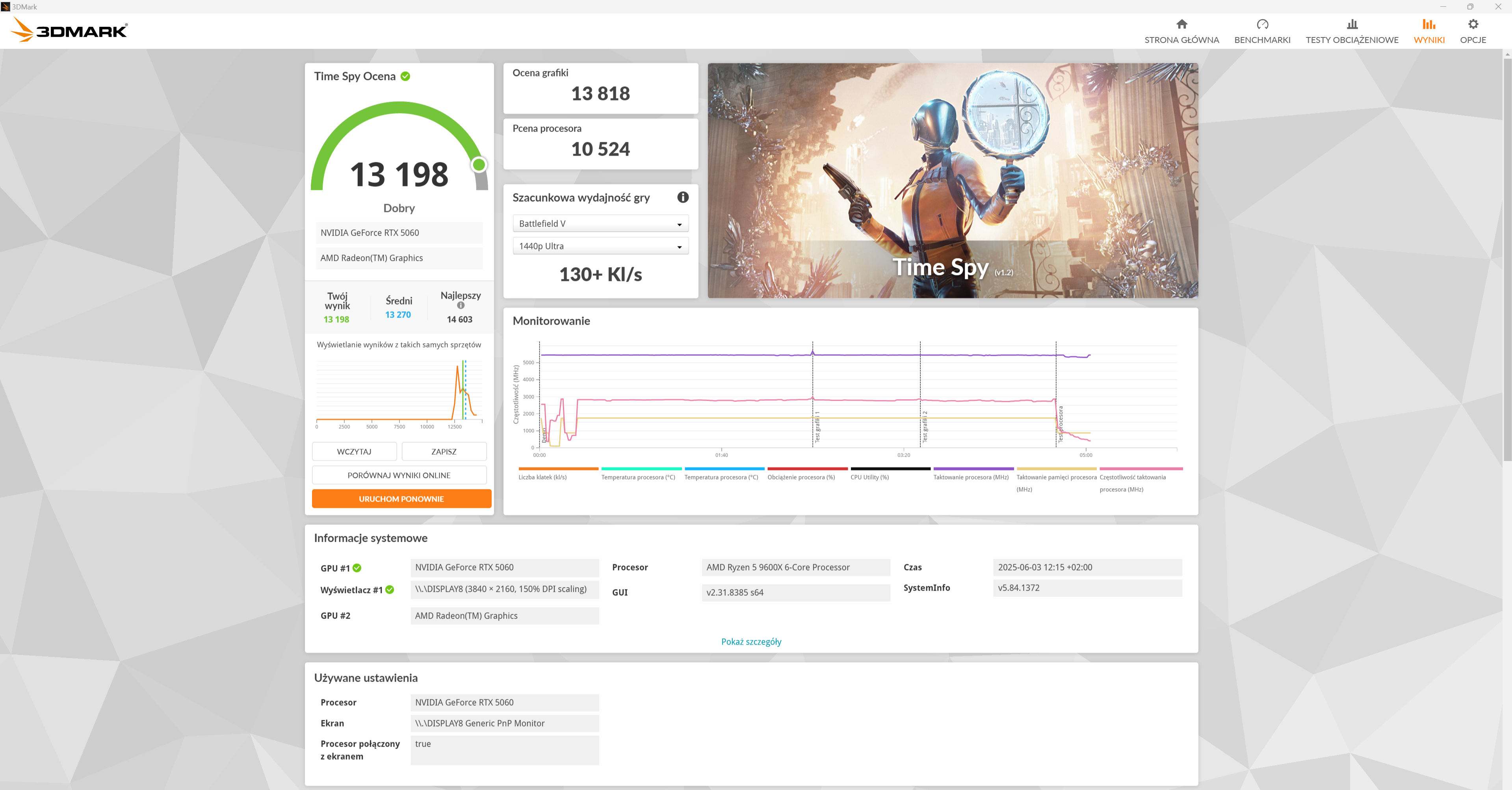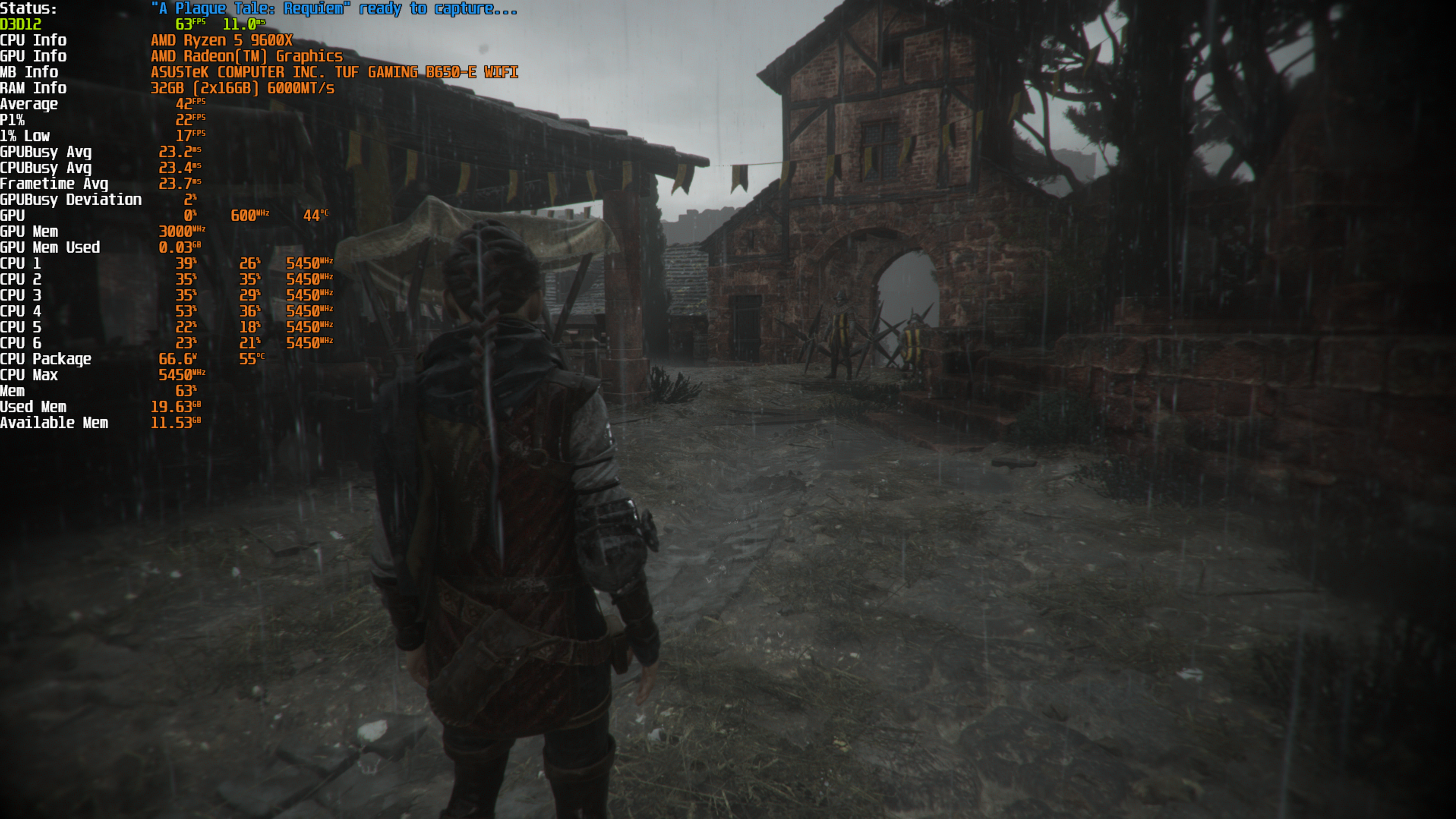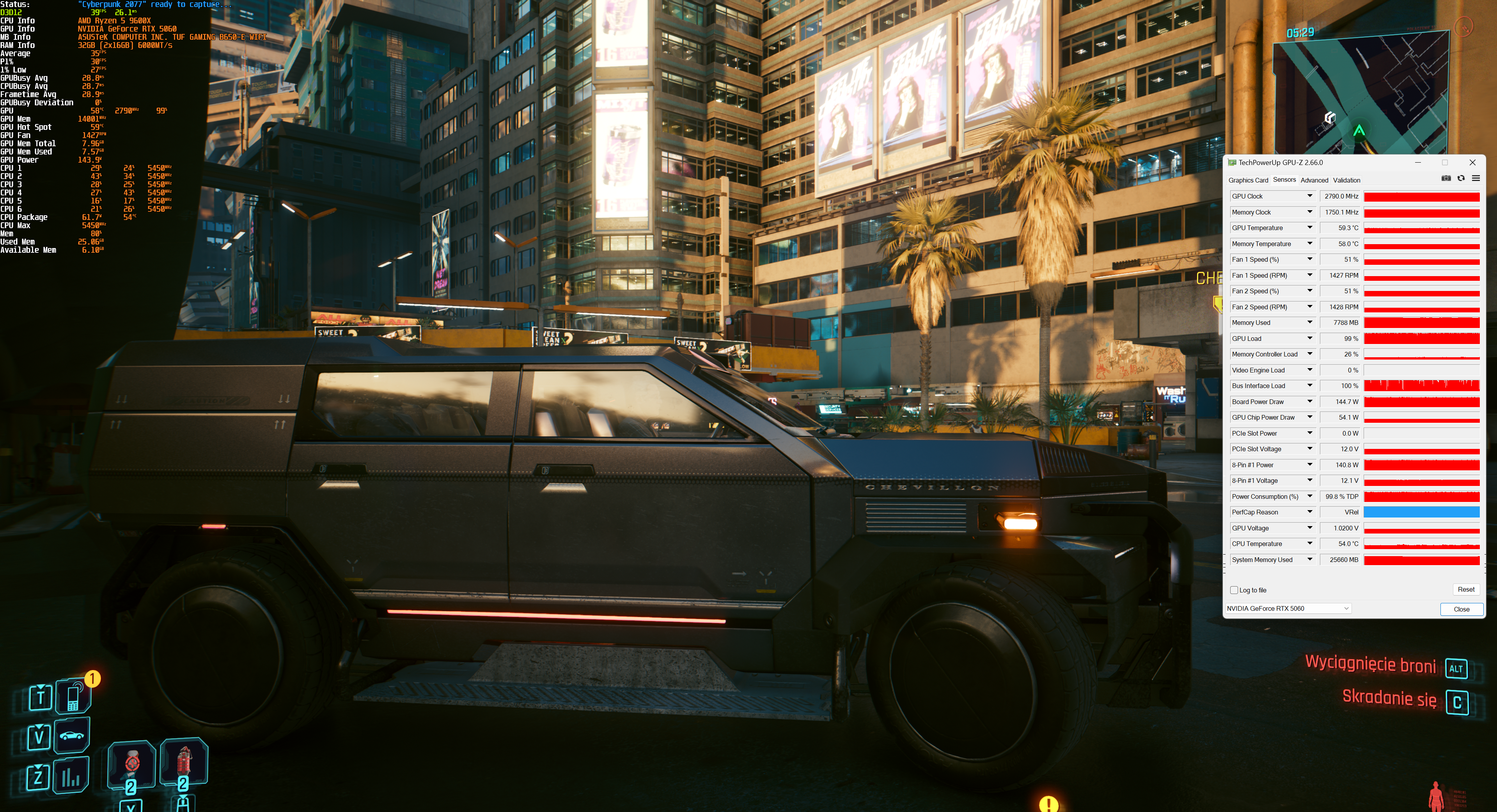 Testy karty graficznej przeprowadzono na systemie Windows 11 64-bit (wersja 23H2) z użyciem sterowników nVidia 576.52, w trakcie rzeczywistej rozgrywki. Do pomiaru liczby klatek wykorzystałem program CapeFrameX w wersji 1.7.2.