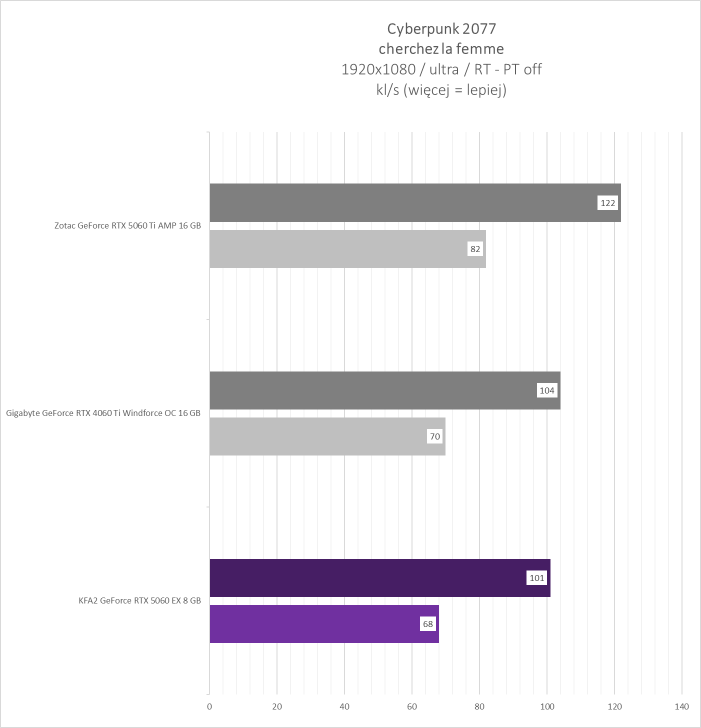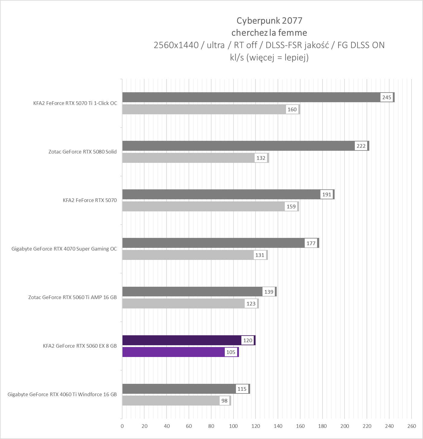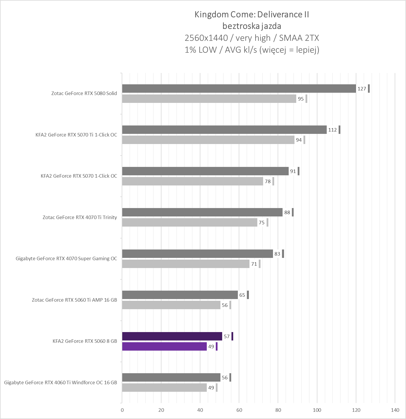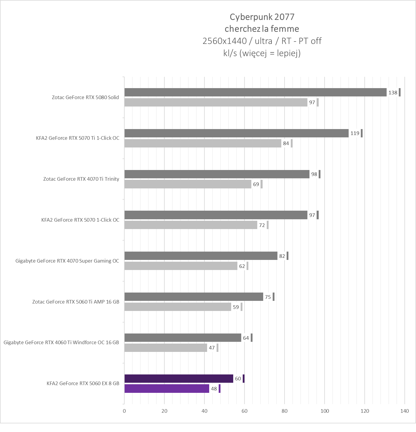 Jeśli chodzi o testowaną dziś konstrukcję od KFA2 to wielkich epopei też tutaj nie ma co pisać. Karta jest solidnie wykonana (szkoda tylko, że ma plastikowy backplate), pobiera mało energii, jest cicha, i nie nagrzewa się zbytnio mocno. Posiada standardowy dla serii 5060/Ti zestaw wejść/wyjść, więc tutaj nie ma nic odkrywczego. Potencjał OC jest solidny (mimo zablokowanego limitu mocy – średnio +10%), ale w mojej opinii będzie on zbędny dla wielu osób, bowiem głównym hamulcowym i tak będzie tu VRAM. Podsumowując. W przypadku RTX-a 5060 (jak i 5060 Ti, oraz 5070) czekamy na odświeżone wersje Super, które będą wyposażone w większą ilość VRAM.