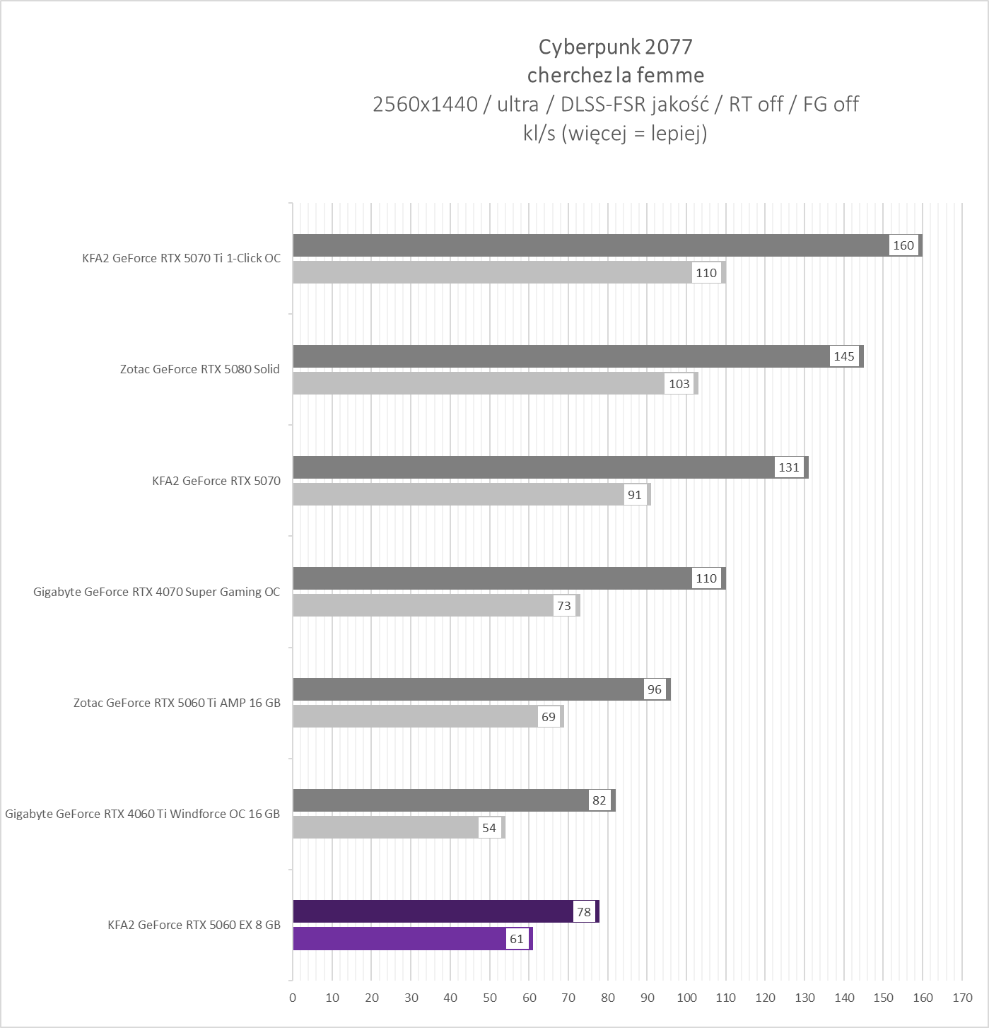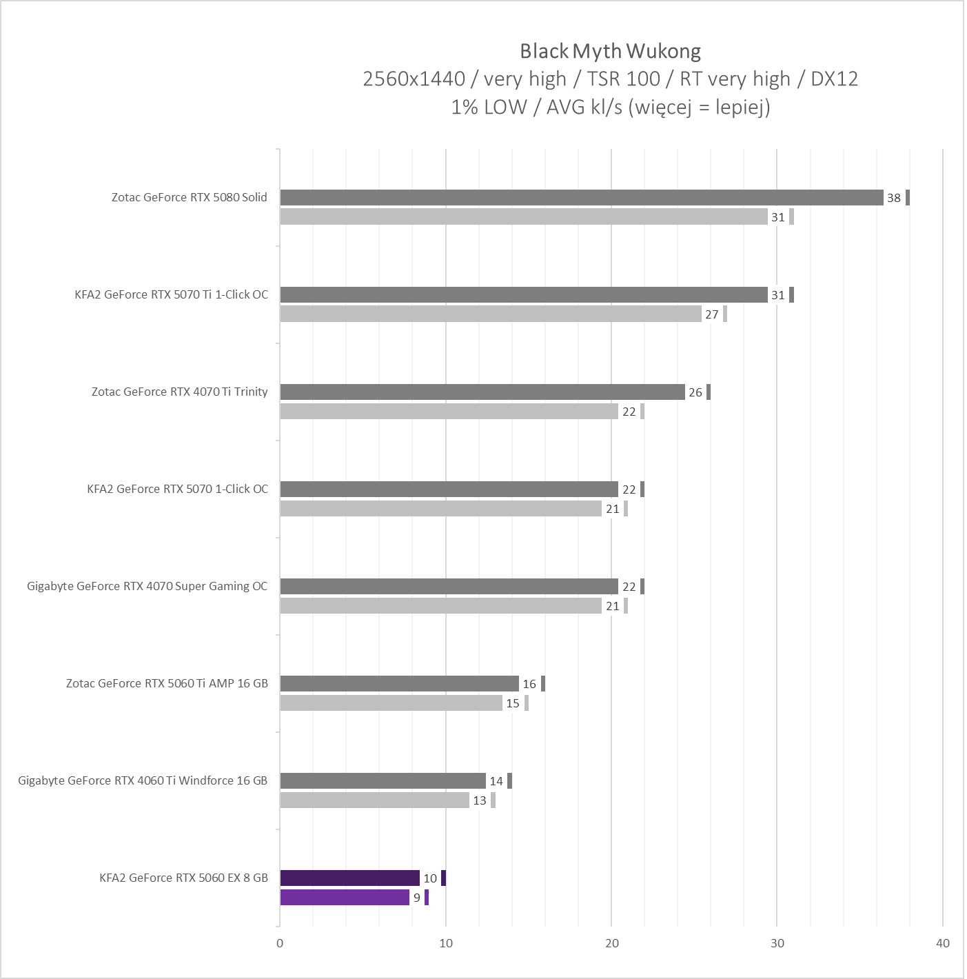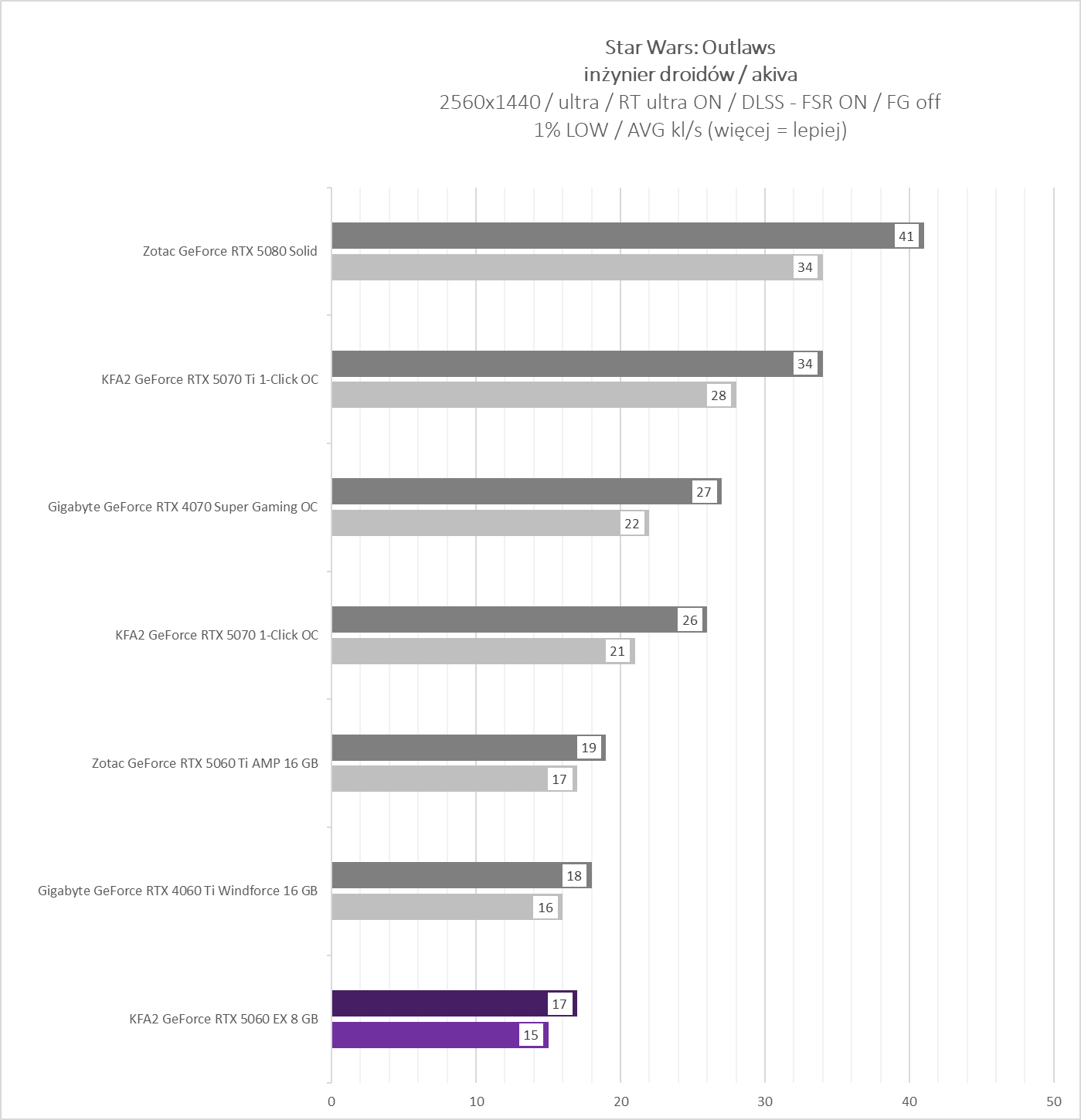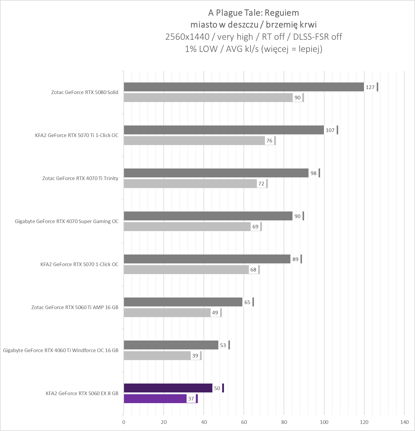 Jeśli chodzi o testowaną dziś konstrukcję od KFA2 to wielkich epopei też tutaj nie ma co pisać. Karta jest solidnie wykonana (szkoda tylko, że ma plastikowy backplate), pobiera mało energii, jest cicha, i nie nagrzewa się zbytnio mocno. Posiada standardowy dla serii 5060/Ti zestaw wejść/wyjść, więc tutaj nie ma nic odkrywczego. Potencjał OC jest solidny (mimo zablokowanego limitu mocy – średnio +10%), ale w mojej opinii będzie on zbędny dla wielu osób, bowiem głównym hamulcowym i tak będzie tu VRAM. Podsumowując. W przypadku RTX-a 5060 (jak i 5060 Ti, oraz 5070) czekamy na odświeżone wersje Super, które będą wyposażone w większą ilość VRAM.