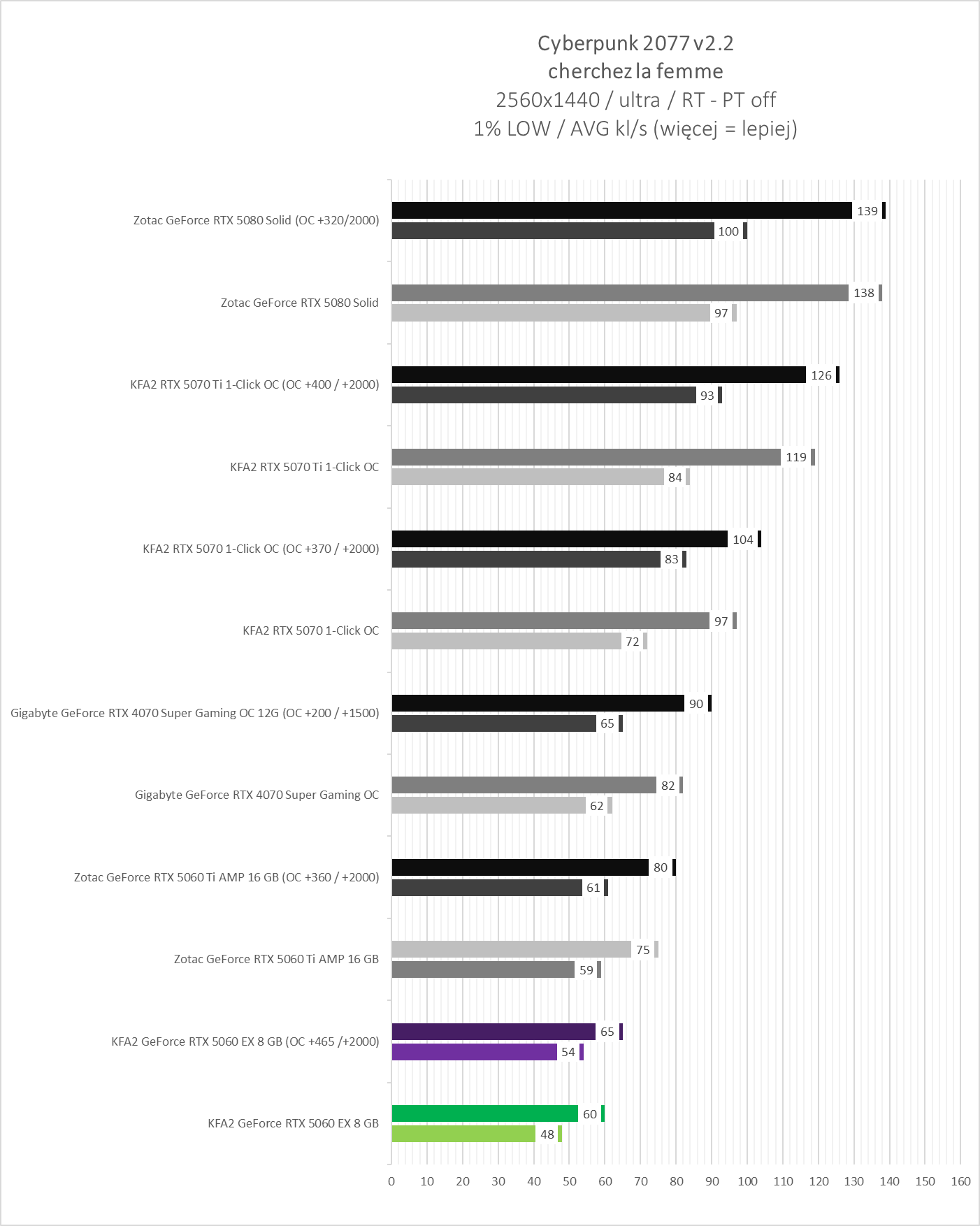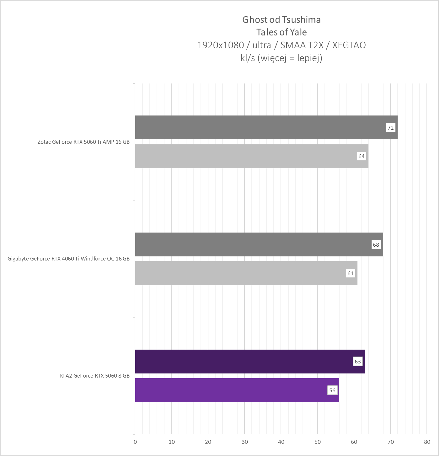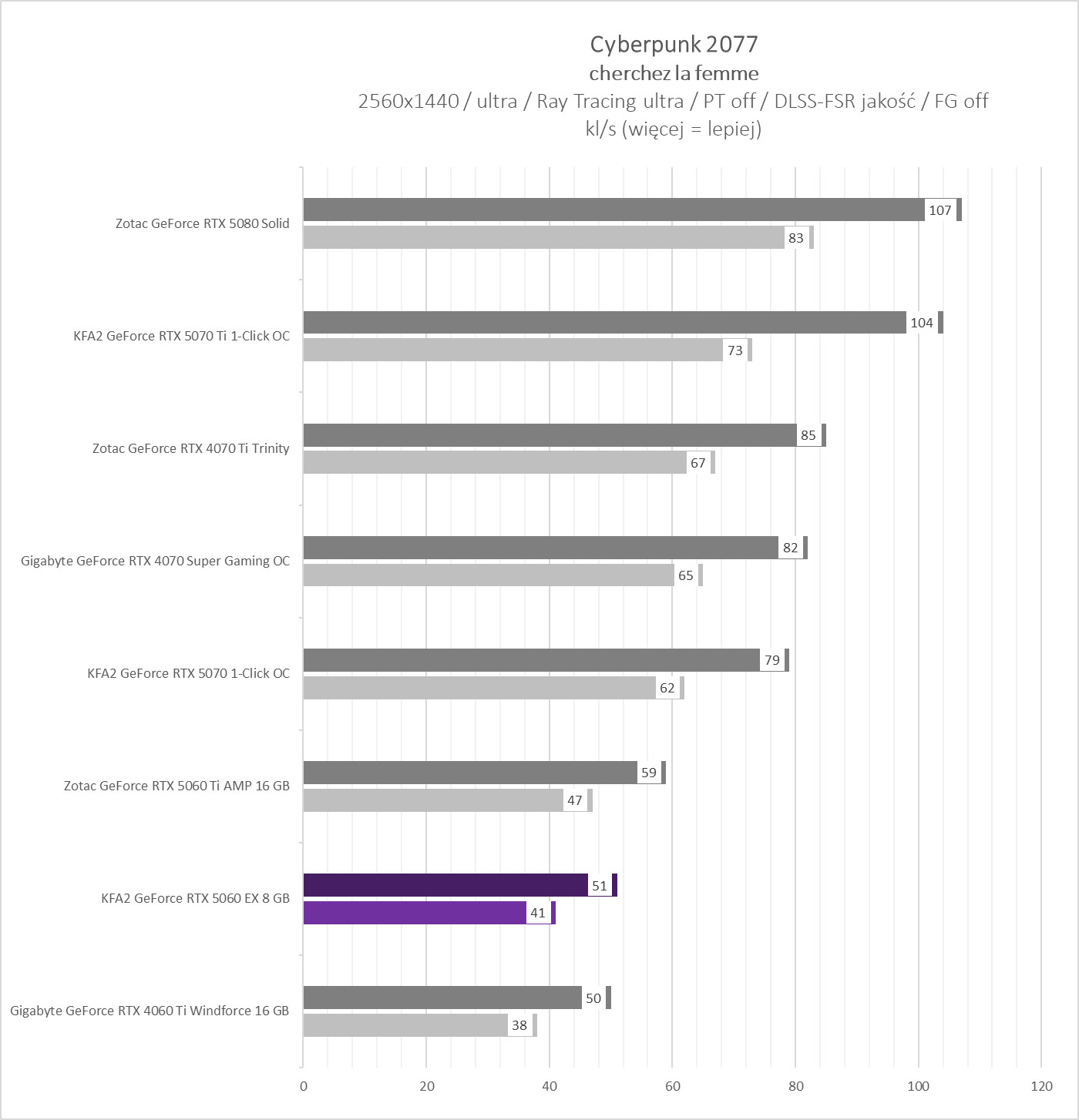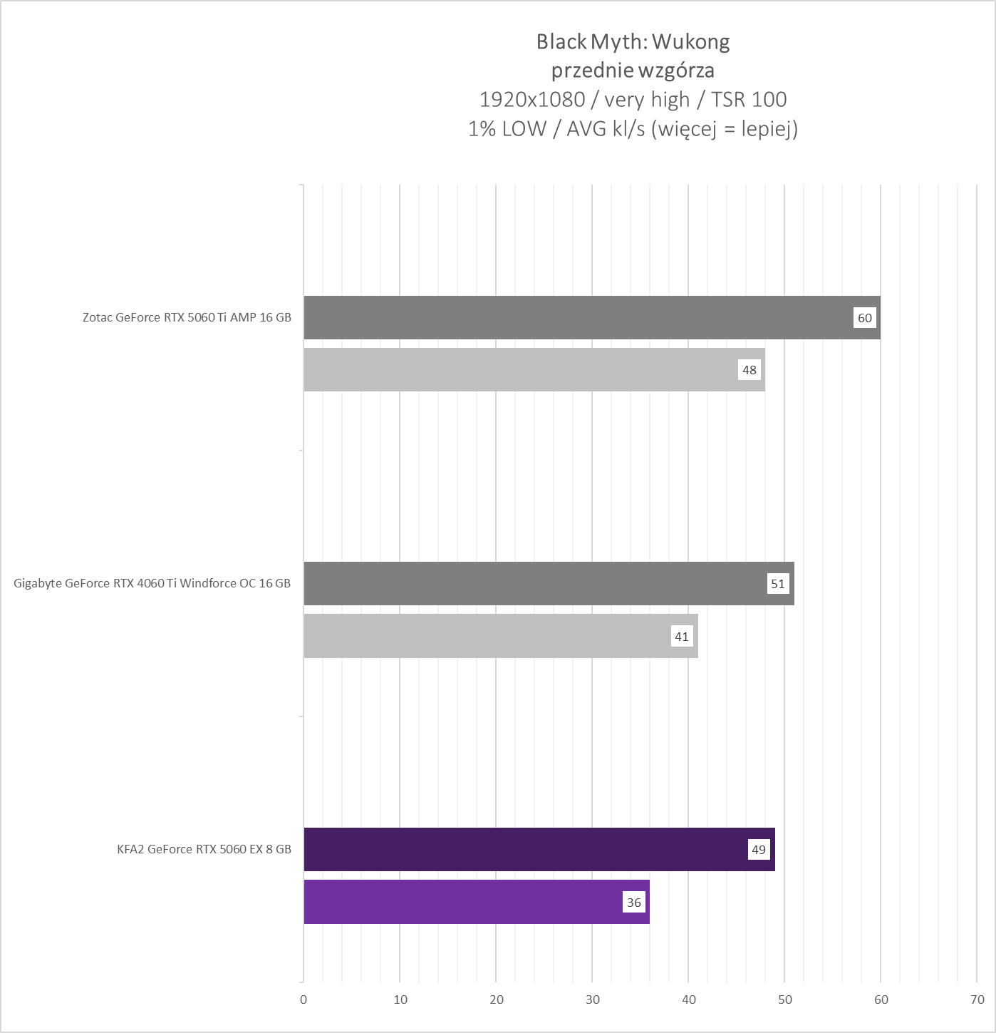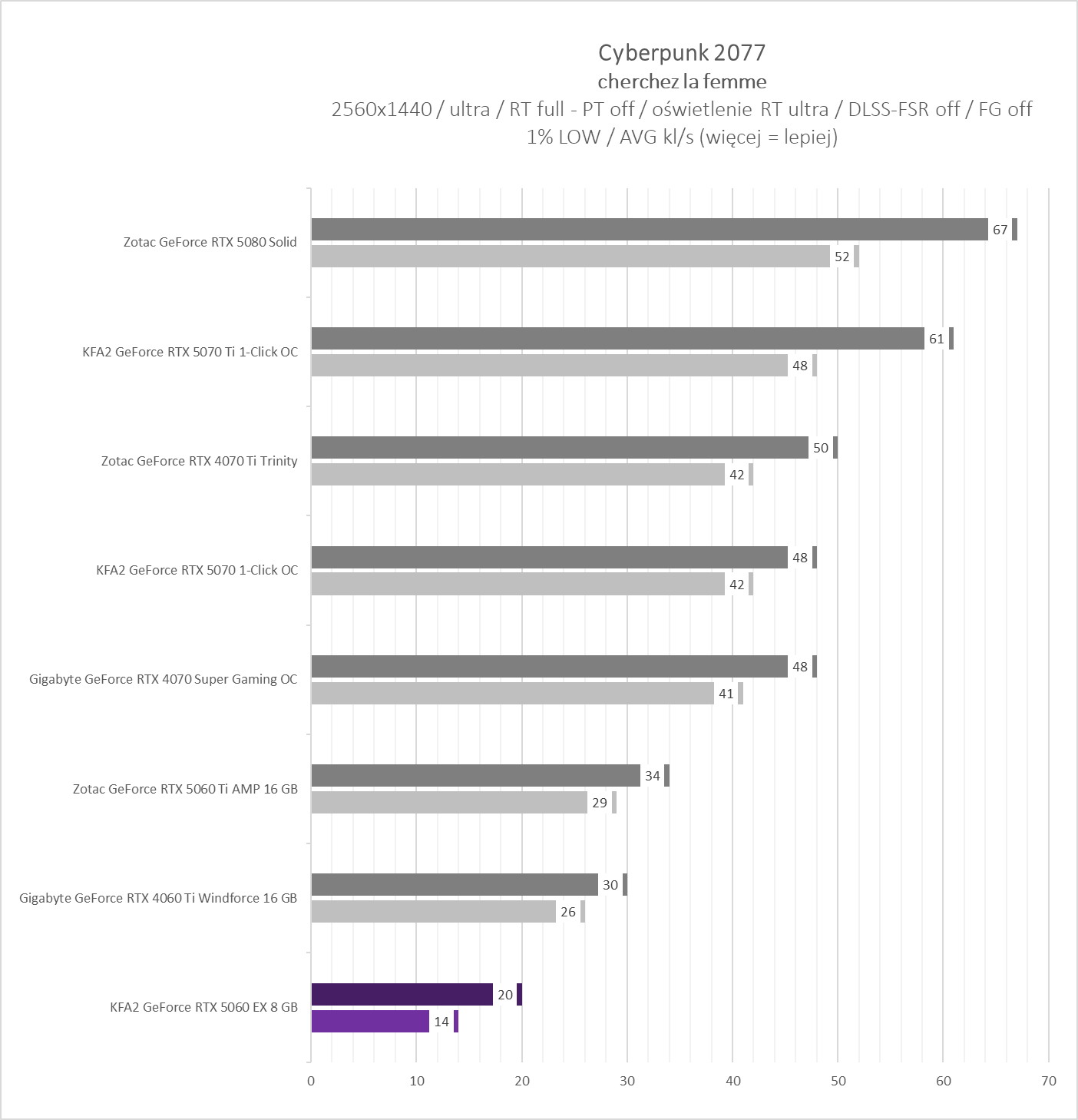 Jeśli chodzi o testowaną dziś konstrukcję od KFA2 to wielkich epopei też tutaj nie ma co pisać. Karta jest solidnie wykonana (szkoda tylko, że ma plastikowy backplate), pobiera mało energii, jest cicha, i nie nagrzewa się zbytnio mocno. Posiada standardowy dla serii 5060/Ti zestaw wejść/wyjść, więc tutaj nie ma nic odkrywczego. Potencjał OC jest solidny (mimo zablokowanego limitu mocy – średnio +10%), ale w mojej opinii będzie on zbędny dla wielu osób, bowiem głównym hamulcowym i tak będzie tu VRAM. Podsumowując. W przypadku RTX-a 5060 (jak i 5060 Ti, oraz 5070) czekamy na odświeżone wersje Super, które będą wyposażone w większą ilość VRAM.