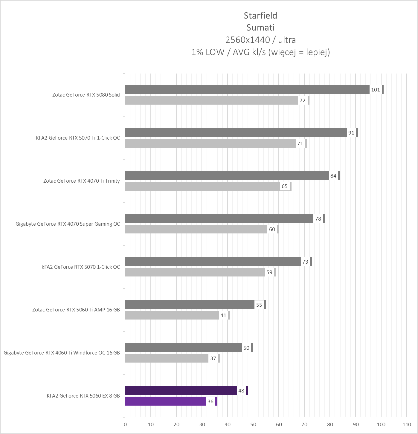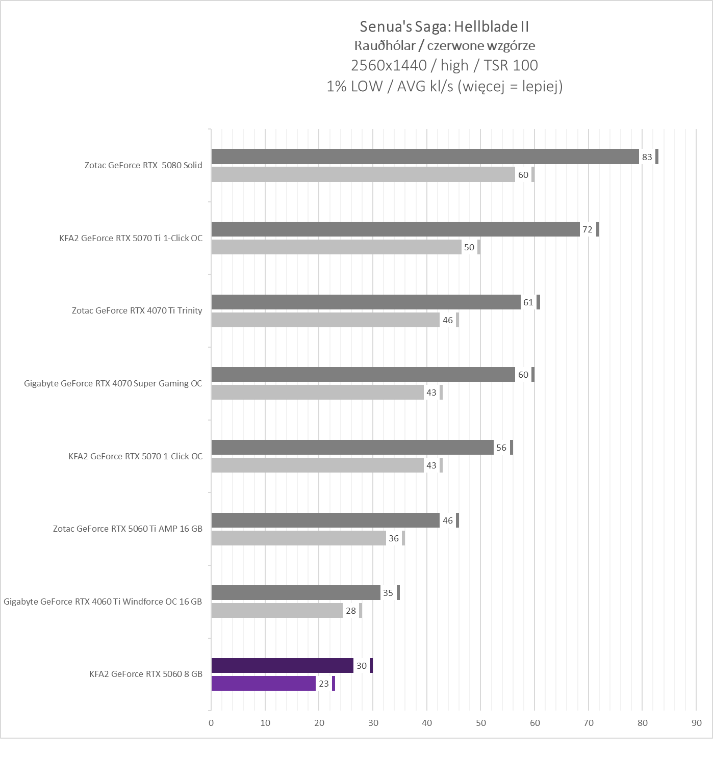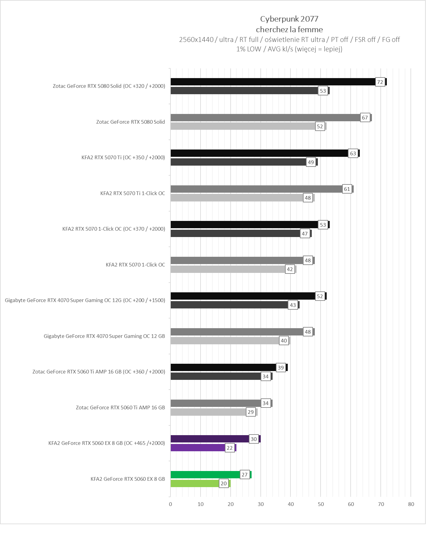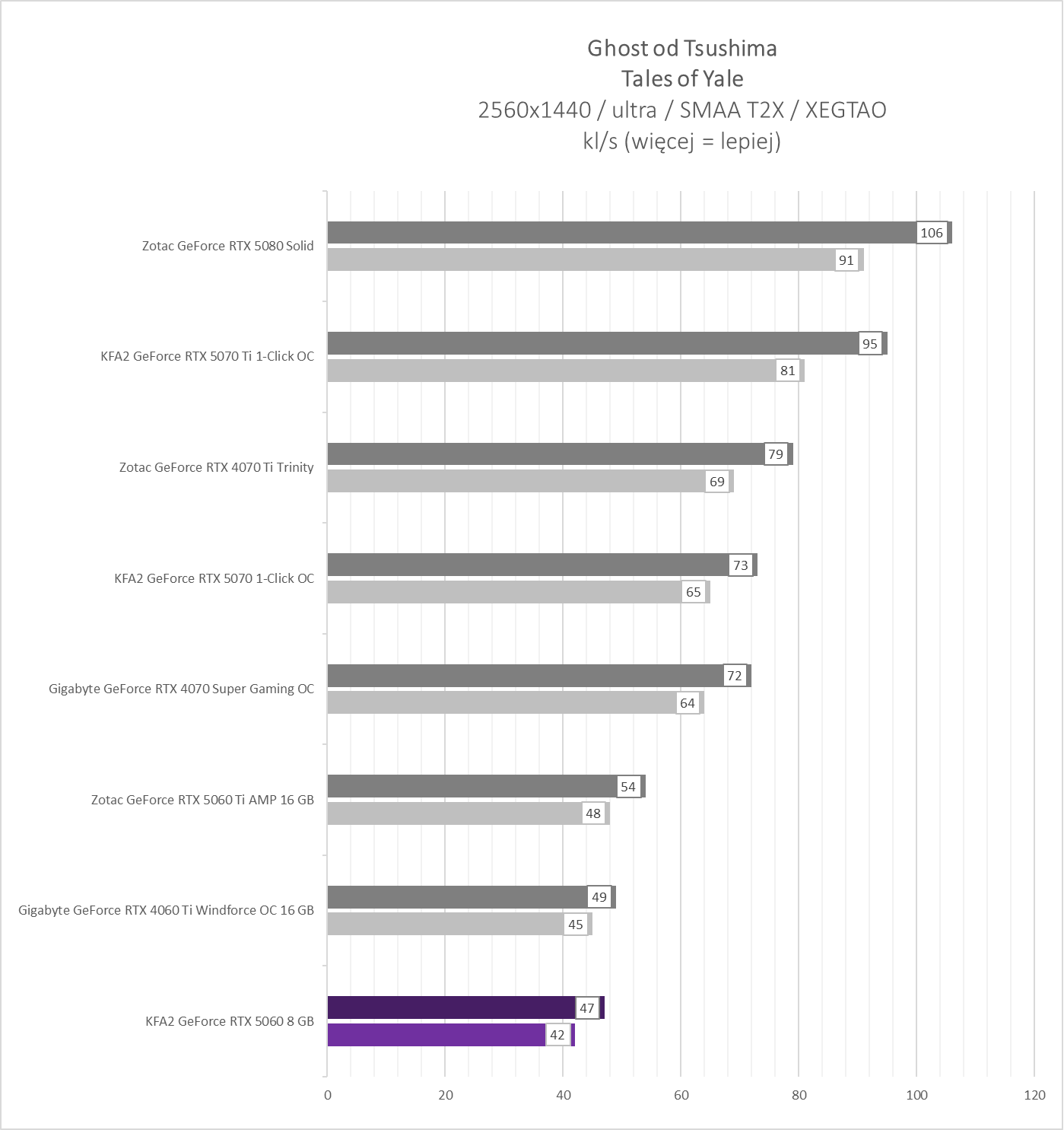 Jeśli chodzi o testowaną dziś konstrukcję od KFA2 to wielkich epopei też tutaj nie ma co pisać. Karta jest solidnie wykonana (szkoda tylko, że ma plastikowy backplate), pobiera mało energii, jest cicha, i nie nagrzewa się zbytnio mocno. Posiada standardowy dla serii 5060/Ti zestaw wejść/wyjść, więc tutaj nie ma nic odkrywczego. Potencjał OC jest solidny (mimo zablokowanego limitu mocy – średnio +10%), ale w mojej opinii będzie on zbędny dla wielu osób, bowiem głównym hamulcowym i tak będzie tu VRAM. Podsumowując. W przypadku RTX-a 5060 (jak i 5060 Ti, oraz 5070) czekamy na odświeżone wersje Super, które będą wyposażone w większą ilość VRAM.